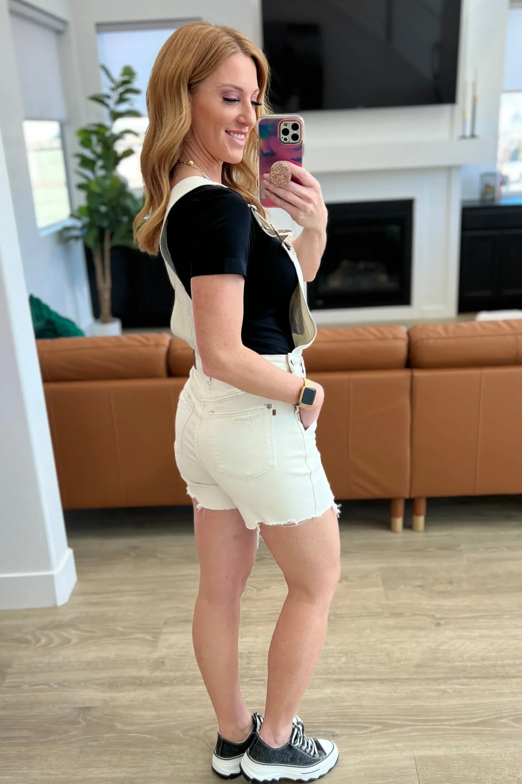 Get ready for some playful style with our Anna High Waist Garment Dyed Cutoff Shortalls from Judy Blue! These overall shorts in a trendy ecru color feature a bib front, side buttons, and a raw hem. They also come with adjustable straps for the perfect fit. Stand out with unique fashion – and pockets – in one!