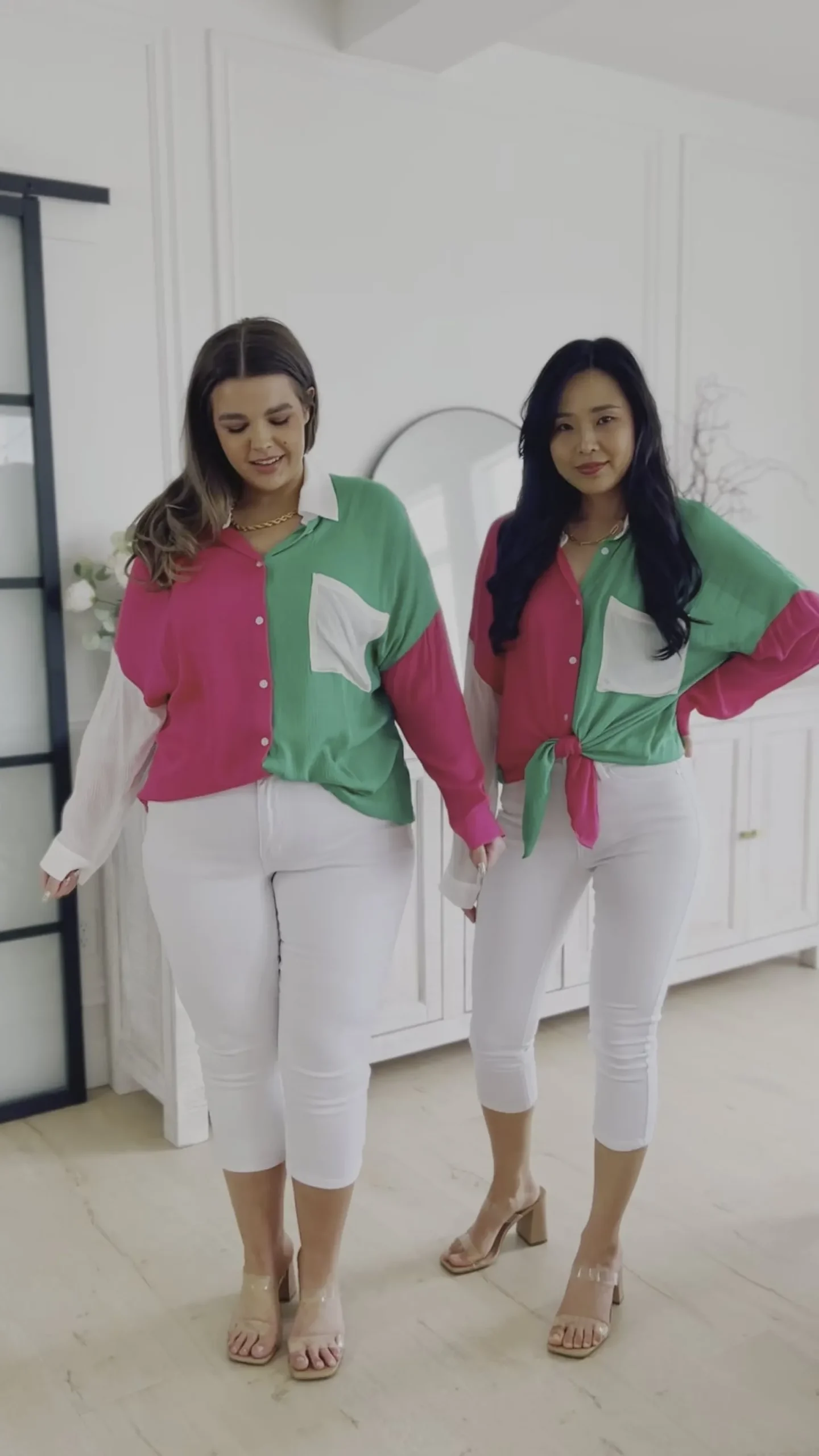 The Capture the Day Two Toned Button Up is the perfect top for Sunday brunch or Mondays in the office! A lightweight, woven crinkle fabric shapes a collared neckline with a functional button front and long sleeves with button cuffs. A front patch pocket and a two-toned design adds an effortless cool girl detail!