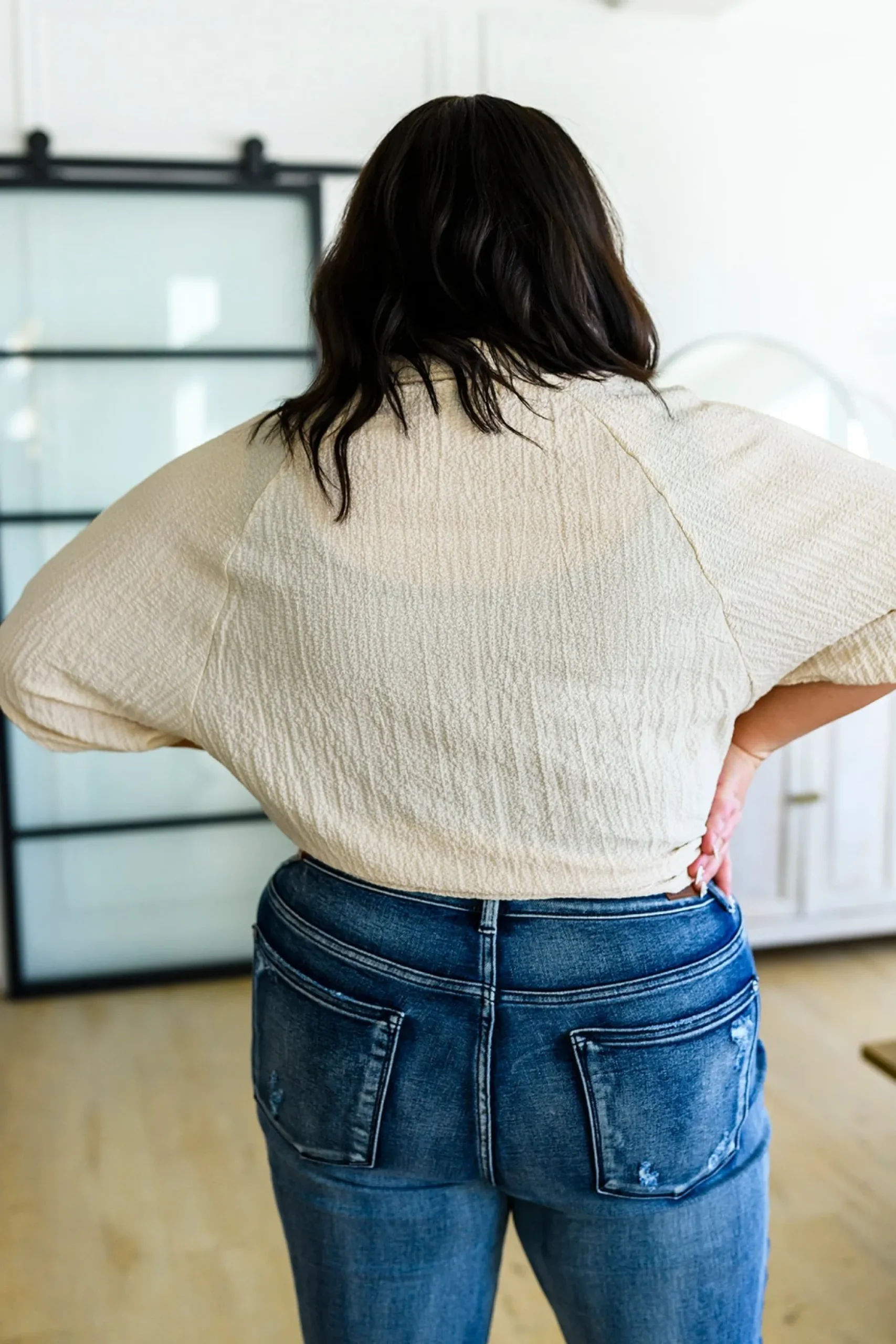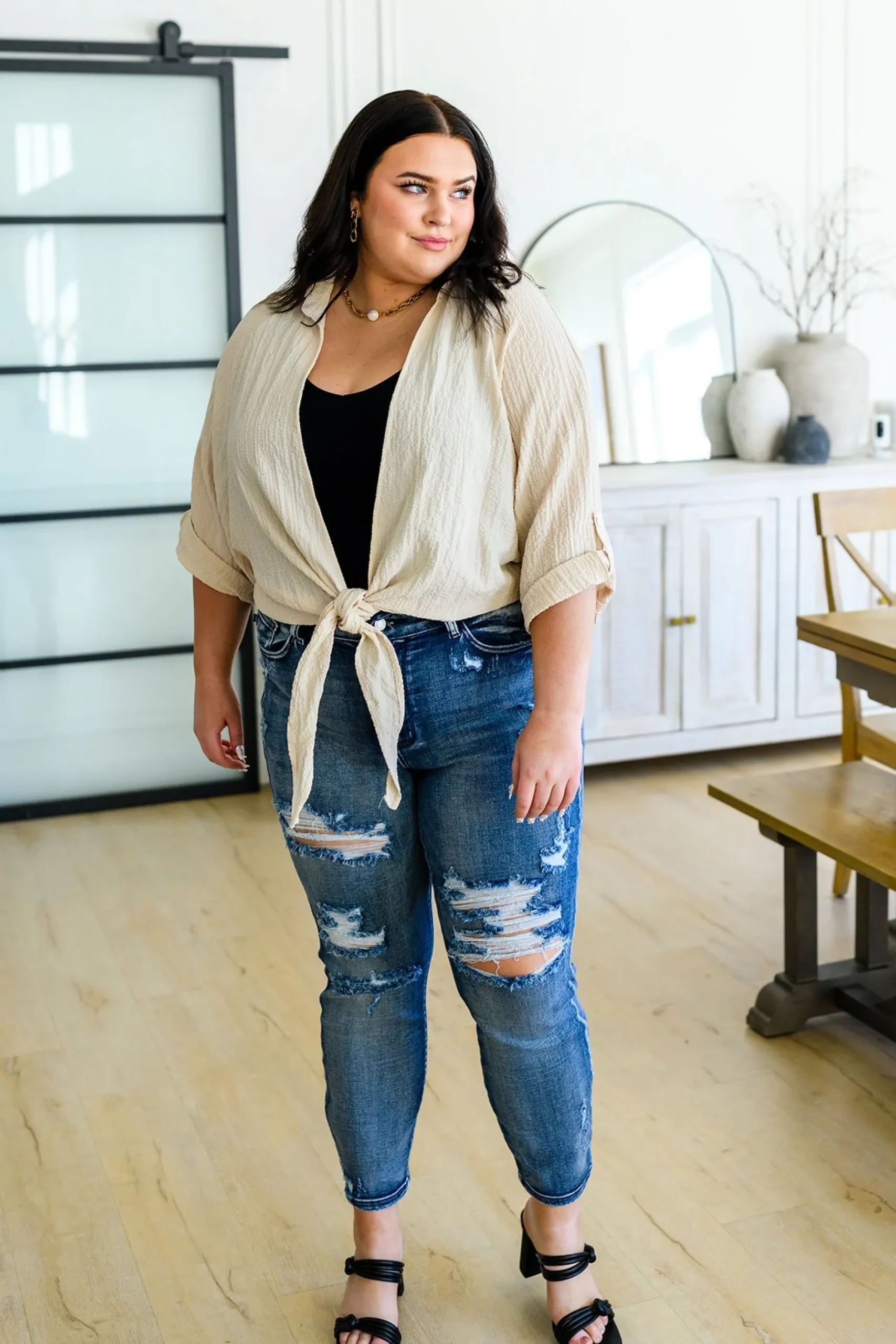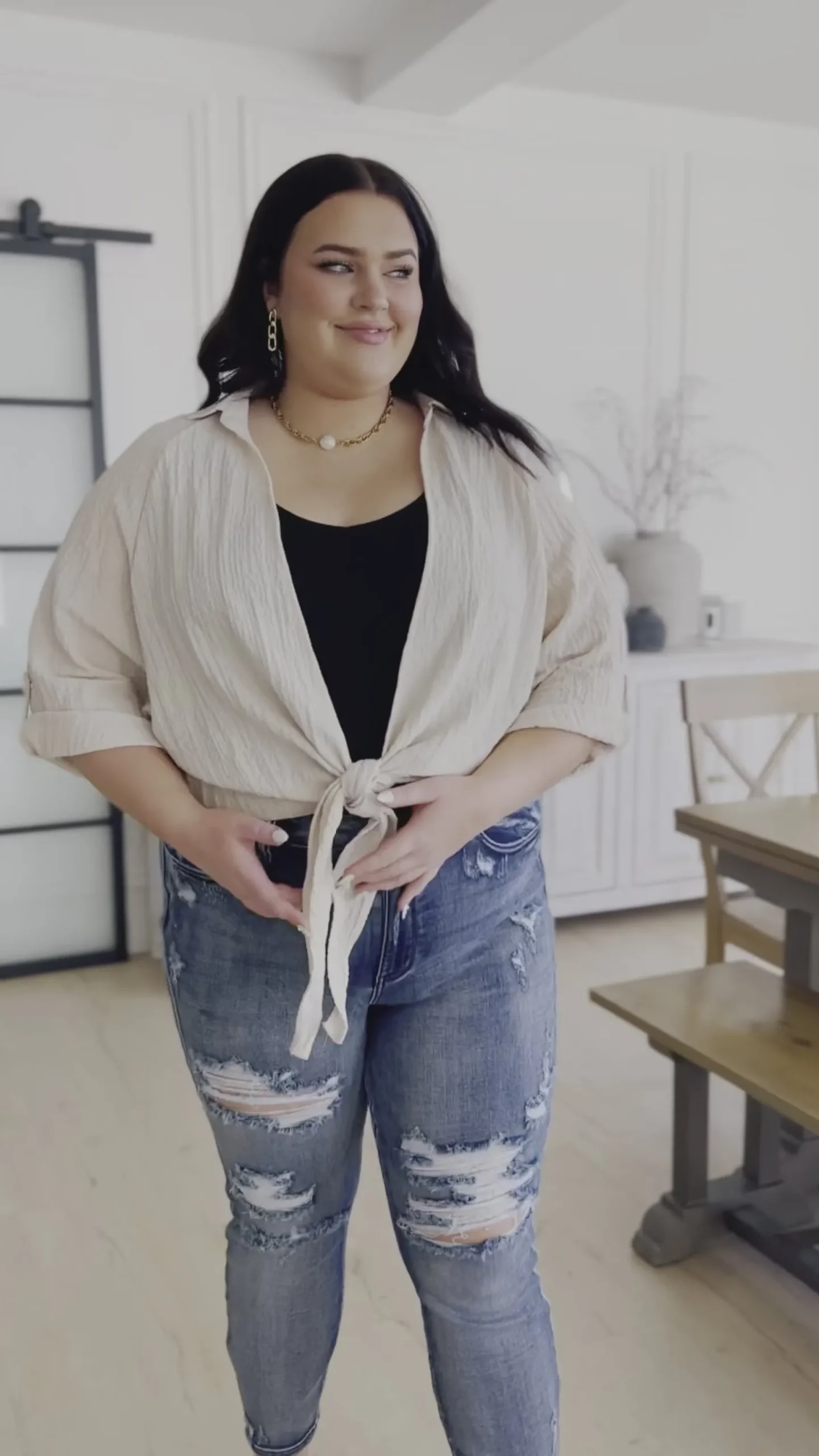 Experience the stylish, comfortable layer of the Castaway Tie Front Shirt. Crafted from lightweight textured crinkle fabric, it features a fold over collar, raglan sleeves, and a tie front that offers adjustable coverage. Roll tab sleeves and a warm, neutral color complete the look. Move with ease and look sensational!