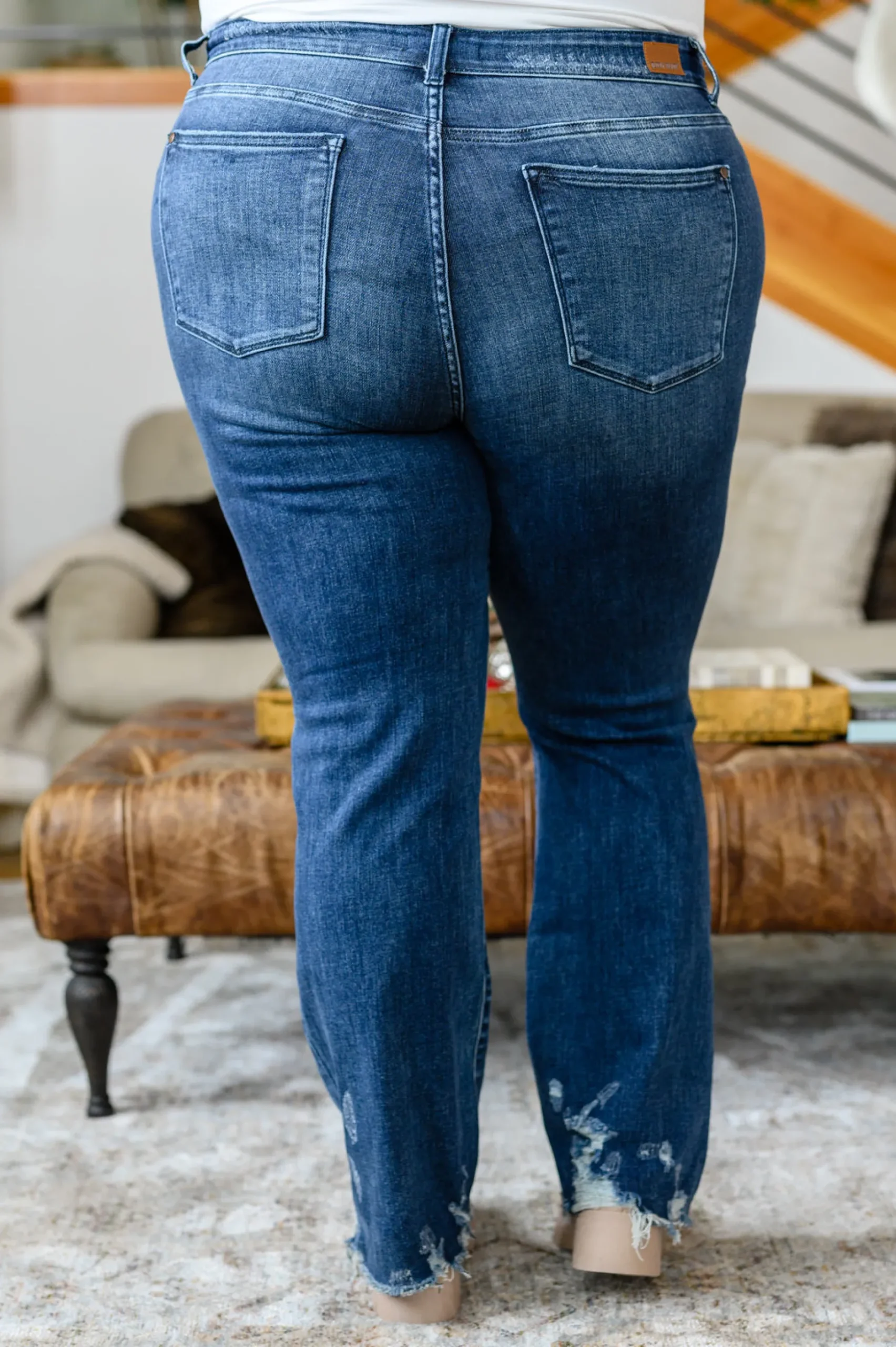 The Christine High Contrast Slim Bootcut Destroyed Jeans feature a dark wash, stretch denim that shapes a mid-rise waist with a five pocket cut and zipper fly. A slim fit through the thighs flares out slightly towards the ankle creating a bootcut hem. The distressing throughout the legs and around the pockets and hem add an edgy and cute touch!
