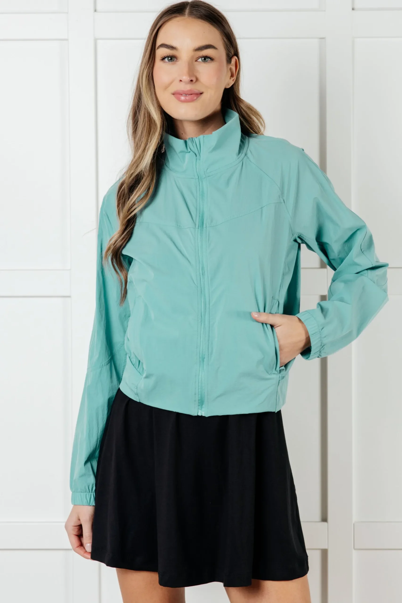 Perfect your serve and keep it stylish with our Fit Happens Nylon Tennis Jacket in Tidal Wave. The high neckline and bubble detail at back provide extra coverage and flair, while the functional zipper side pockets and inside patch pocket keep your essentials close. Made with nylon stretch woven for ultimate comfort. Game on!