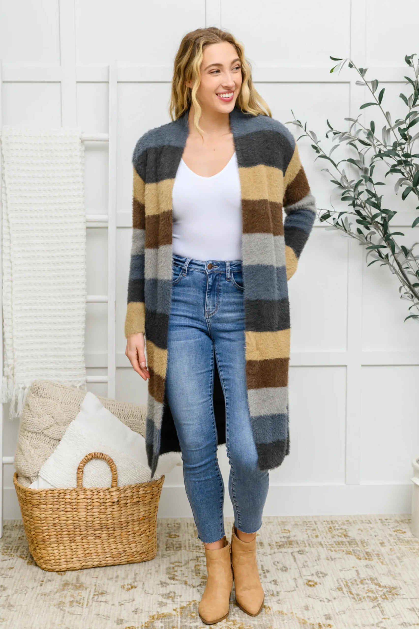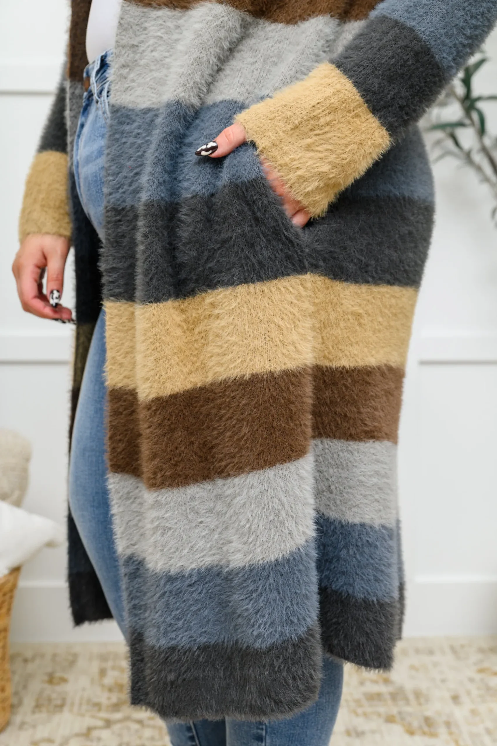 The Fuzzy Longline Cardigan In Blue & Cocoa features a fuzzy medium-weight knit that shapes long sleeves, with an open front, midi length hem, and side pockets. Tones of blue and tan create a cute color block design.