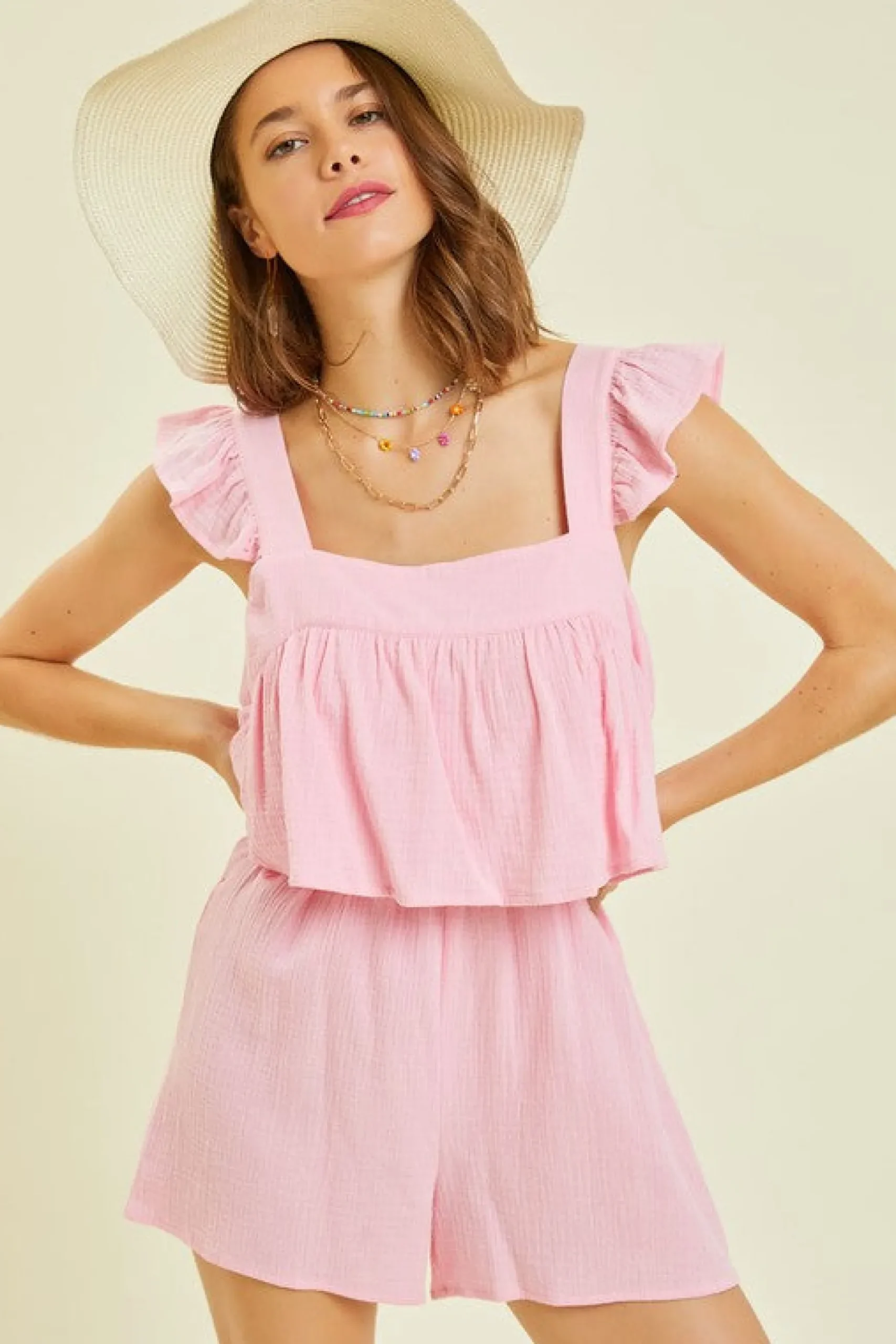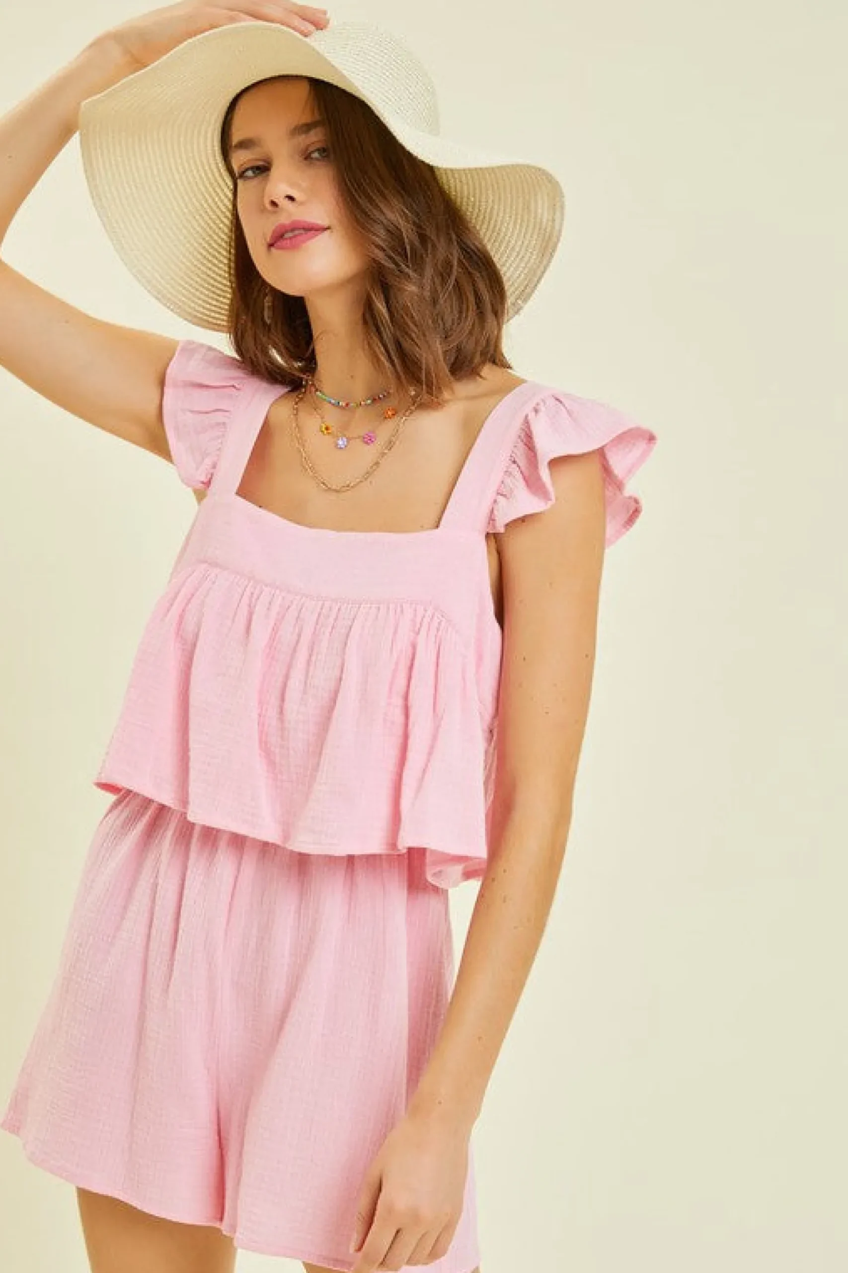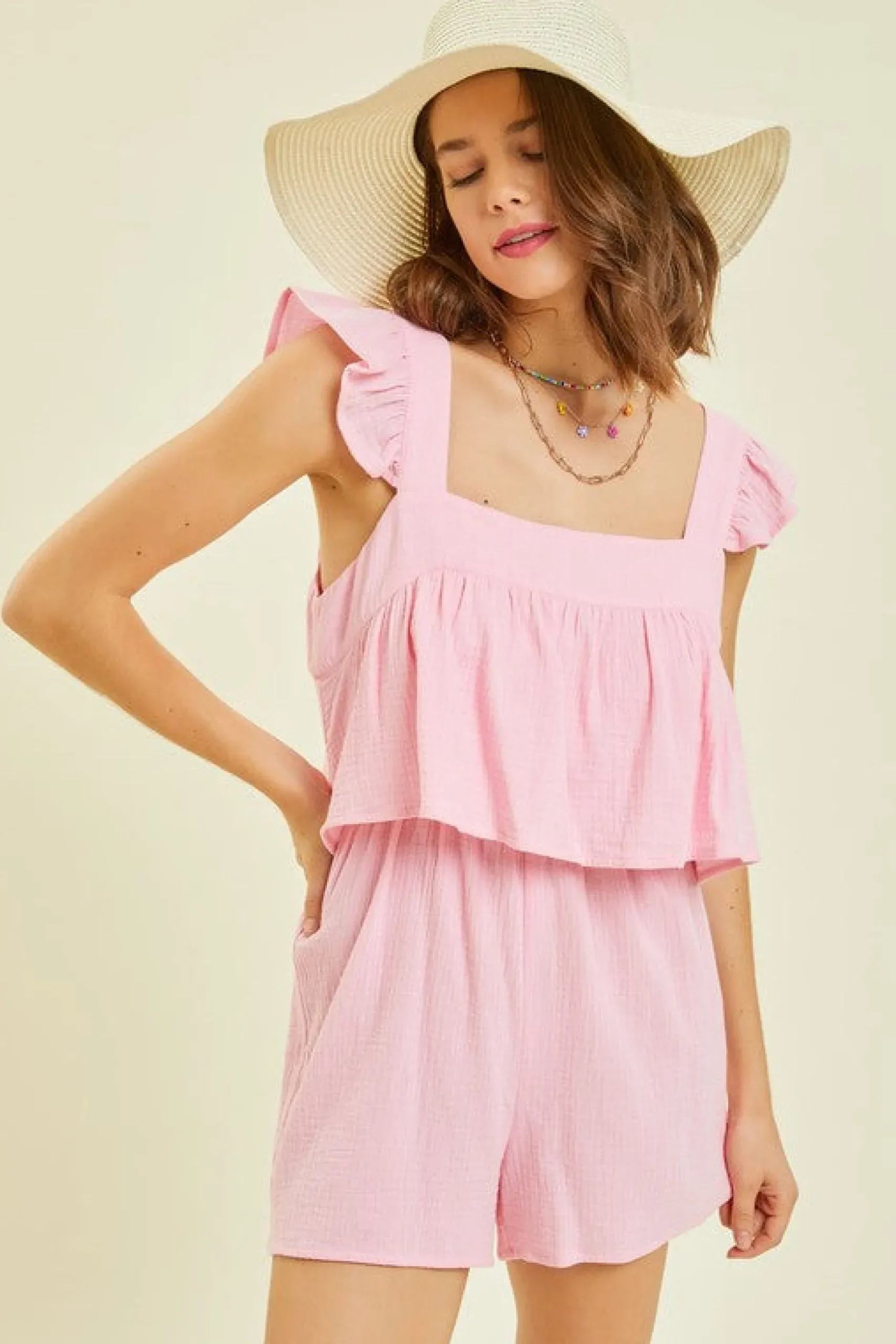 Gauze Square Neck Romper with Mini Ruffles on the Shoulder in Pink