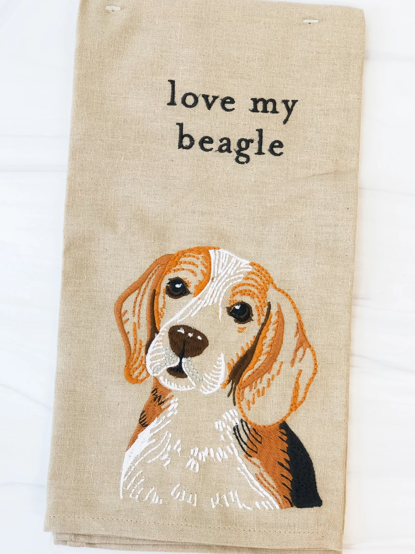 A cotton linen blend dish towel lending a “Love My Beagle” sentiment with fully embroidered beagle portrait design. Machine-washable. Complements well with other pieces in collection to create a cohesive display!