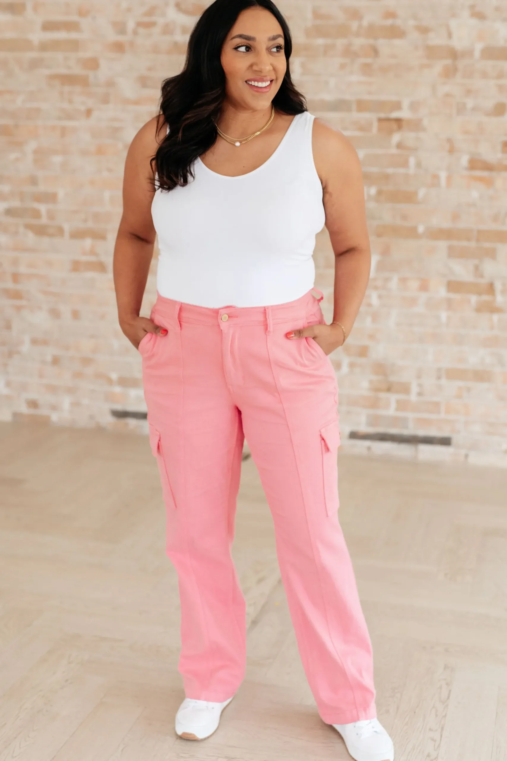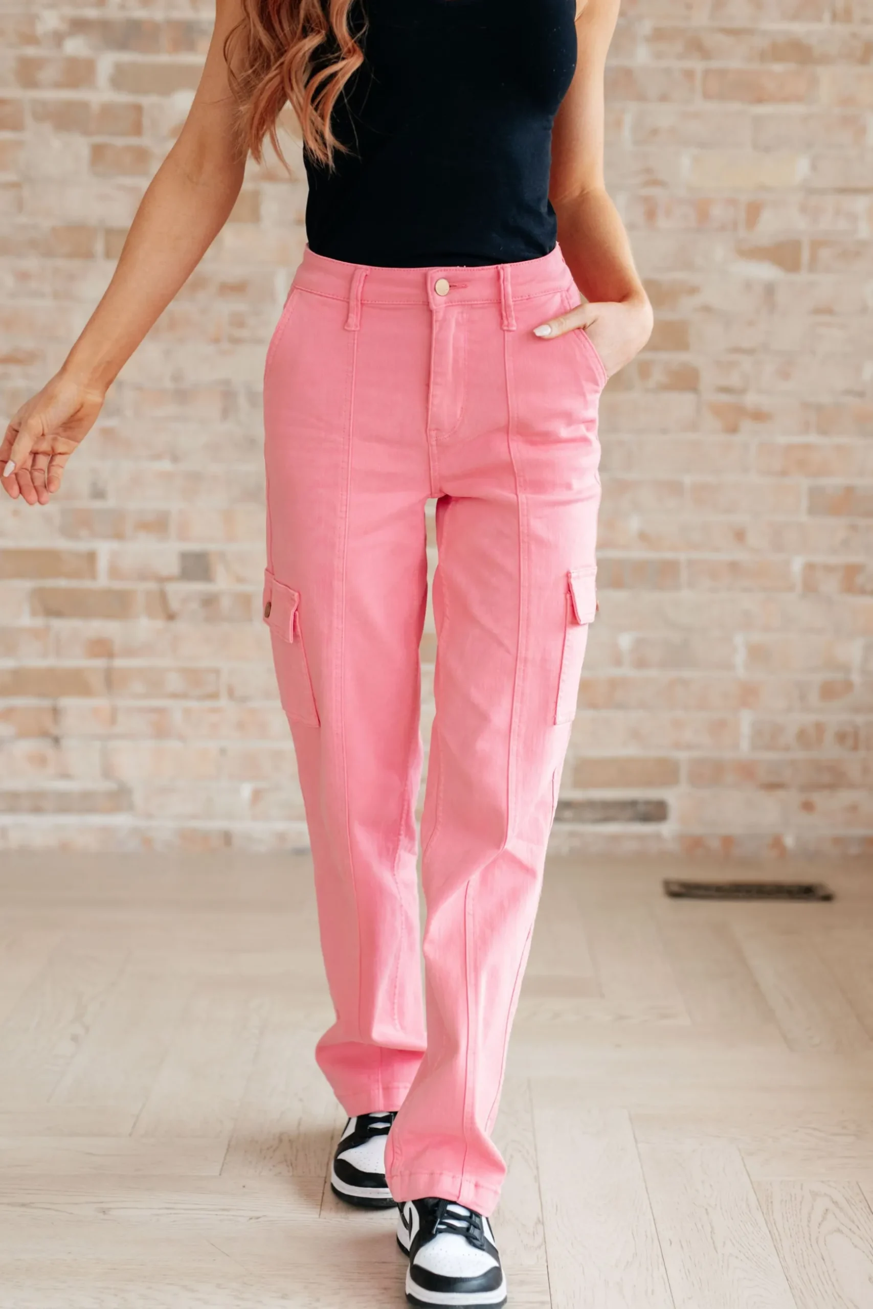 Add a pop of color to your wardrobe with our Peggy High Rise Cargo Straight Jeans from Judy Blue! Not only do they feature a trendy high rise and cargo style pockets, this garment dyed pink jeans also offer 4-way stretch for a comfortable fit. Get ready to turn heads with these playful and quirky pants.