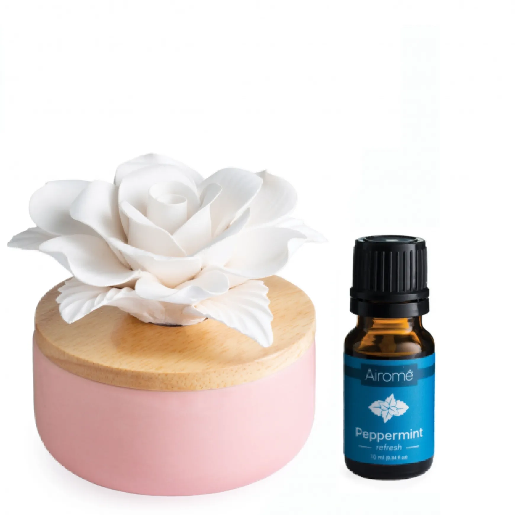 Airome Passive Porcelain Essential Oil Diffusers can be filled with 100% pure essential oils, fragrance oil, or water and oil to diffuse fragrance that lasts for up to 2 weeks. A porcelain botanical rests on a ceramic base to bring natural beauty to your space as you enjoy the aromatherapy benefits of 100% pure essential oils. Once your oil is completely diffused, simply let flower dry out before switching fragrances or diffuse only water to clean out between fragrances. Includes a 10 mL bottle of pure peppermint essential oil, but can be used with any essential or fragrance oil.