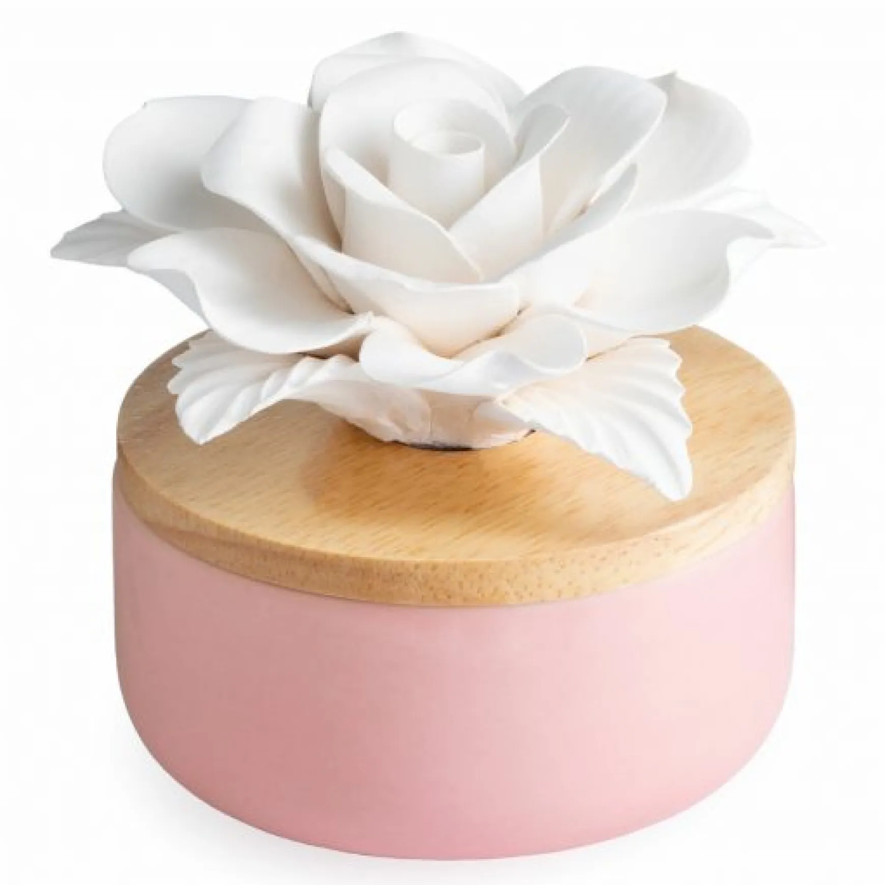 - DESIGN: A delicate porcelain rose blooms from a wooden lid and blush pink porcelain vessel. Includes 3 pieces: Porcelain botanical with rope, Wooden vessel lid, Vessel.