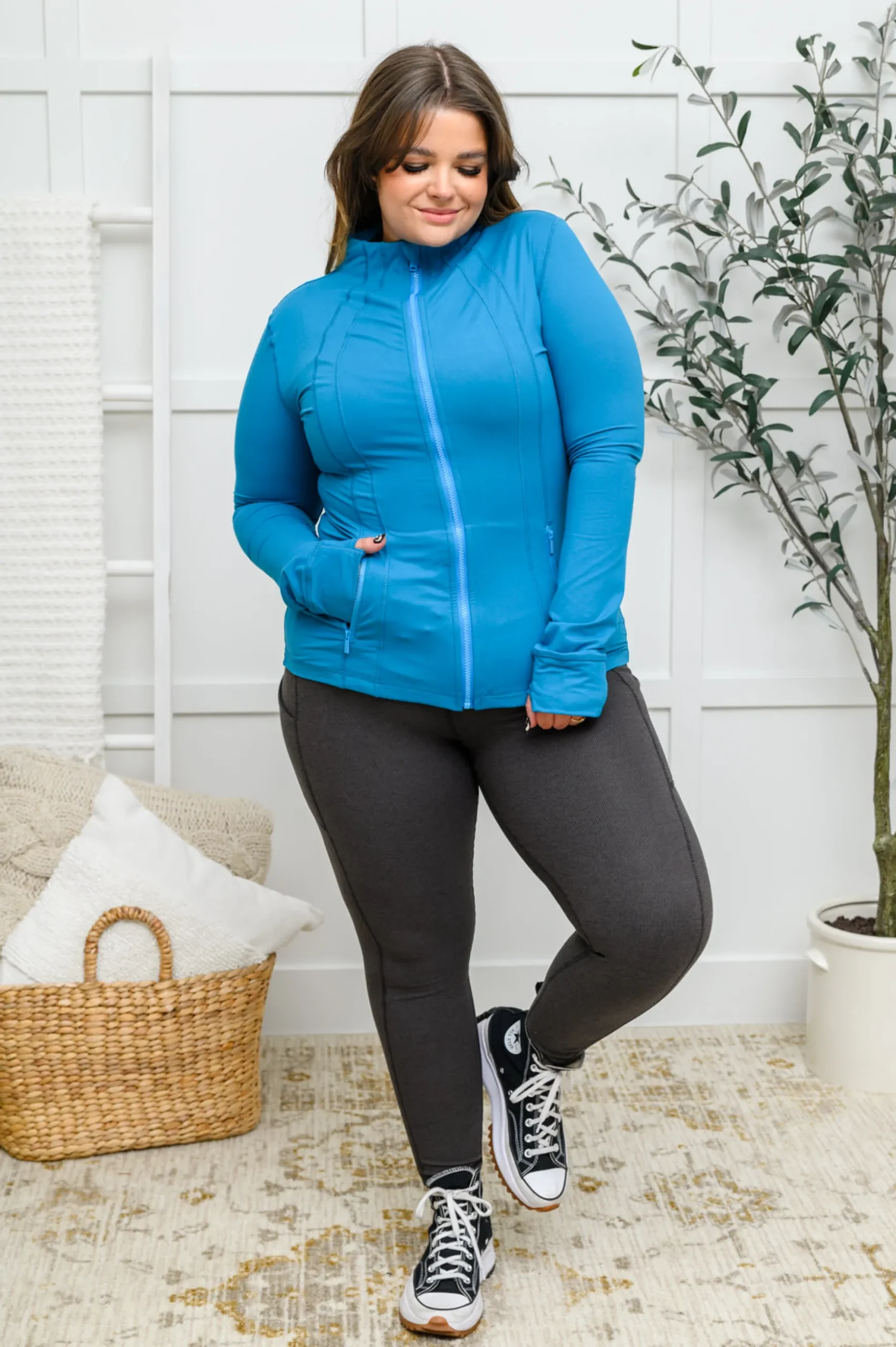 Look forward to your next workout in the Staying Swift Activewear Jacket in Black! This cute yet functional jacket features a zipper front with a high neckline, long sleeves with thumb holes, side zipper pockets, venting at the back, and decorative seams throughout. Pair with black leggings and sneakers for a clean and stylish workout look!