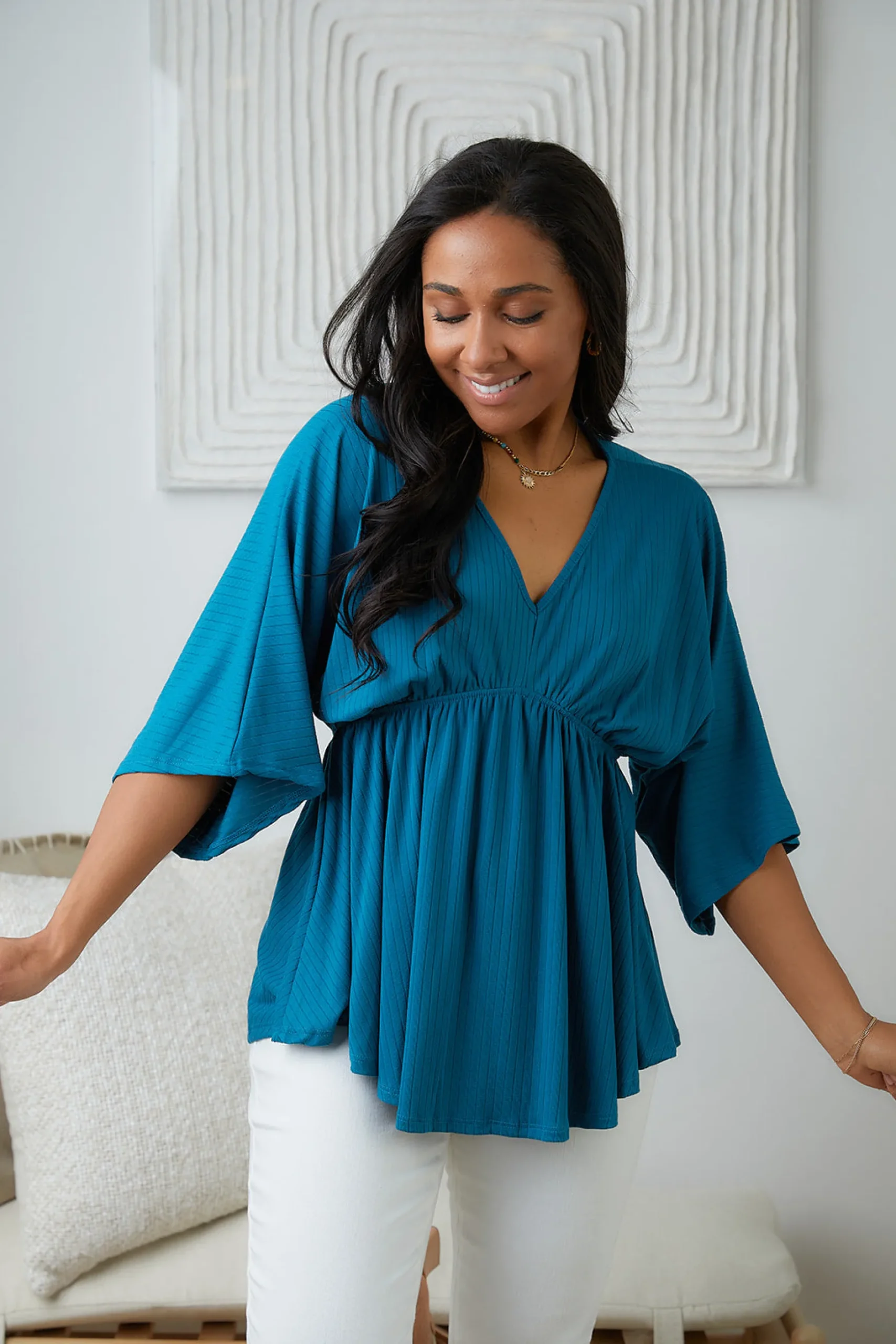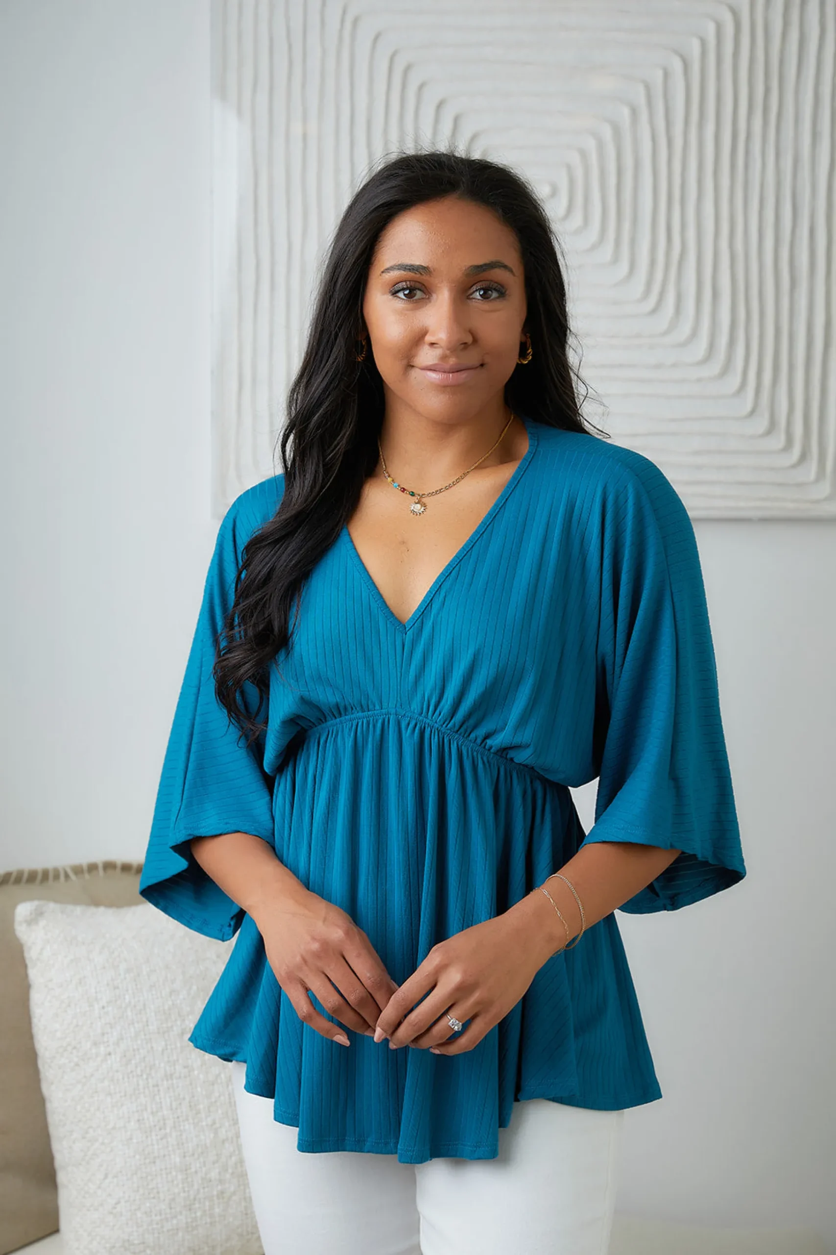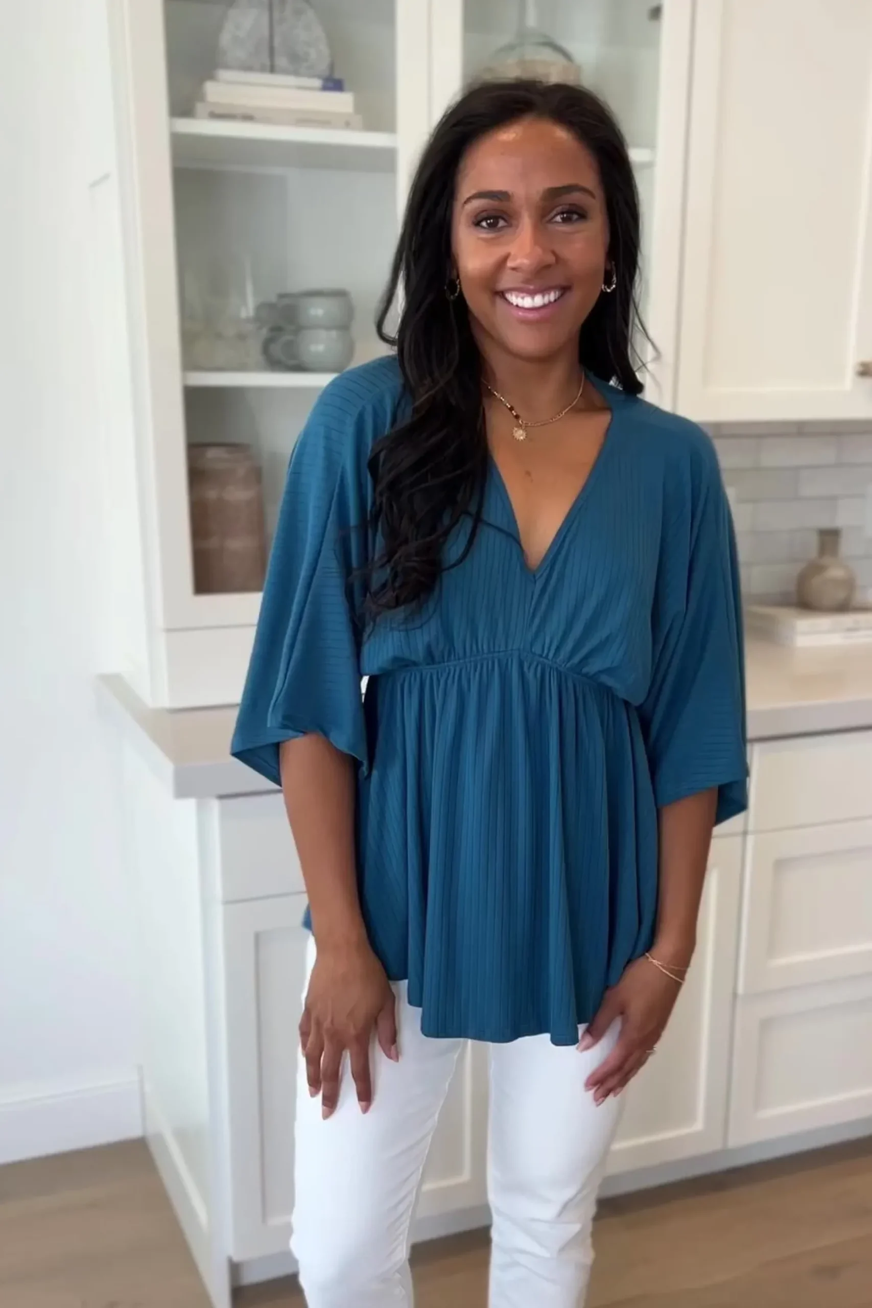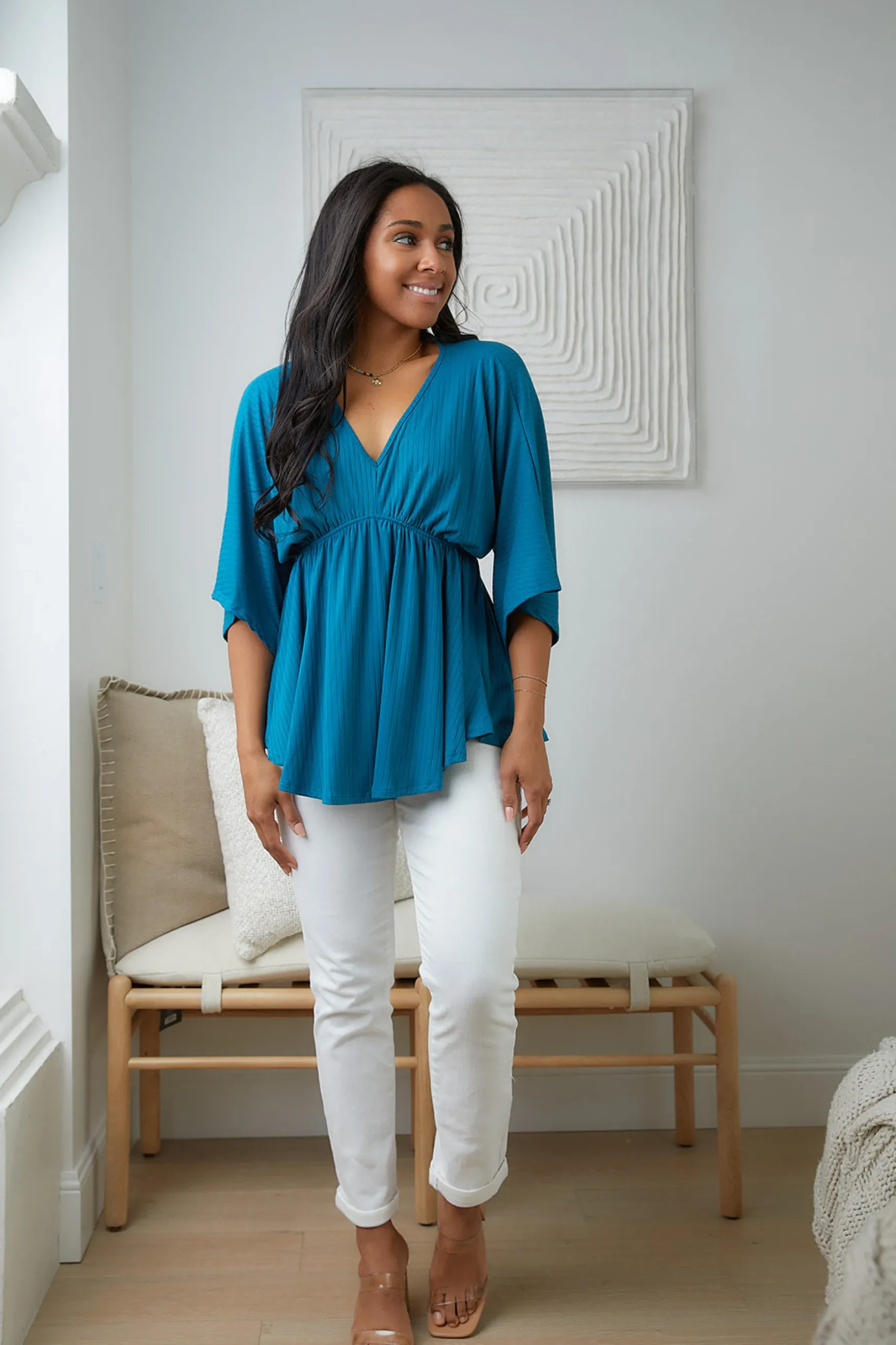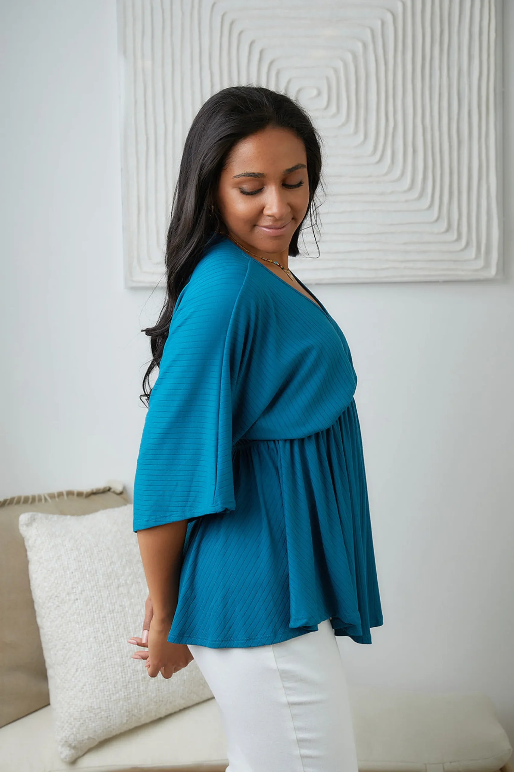 Experience timeless fashion with the Storied Moments Draped Peplum Top! This classic V-neck top is crafted from a jersey knit and features an elastic waistband and draped half sleeves that flatter all figures. The subtle peplum adds just the right amount of femininity. Enjoy effortless style every time you slip it on!