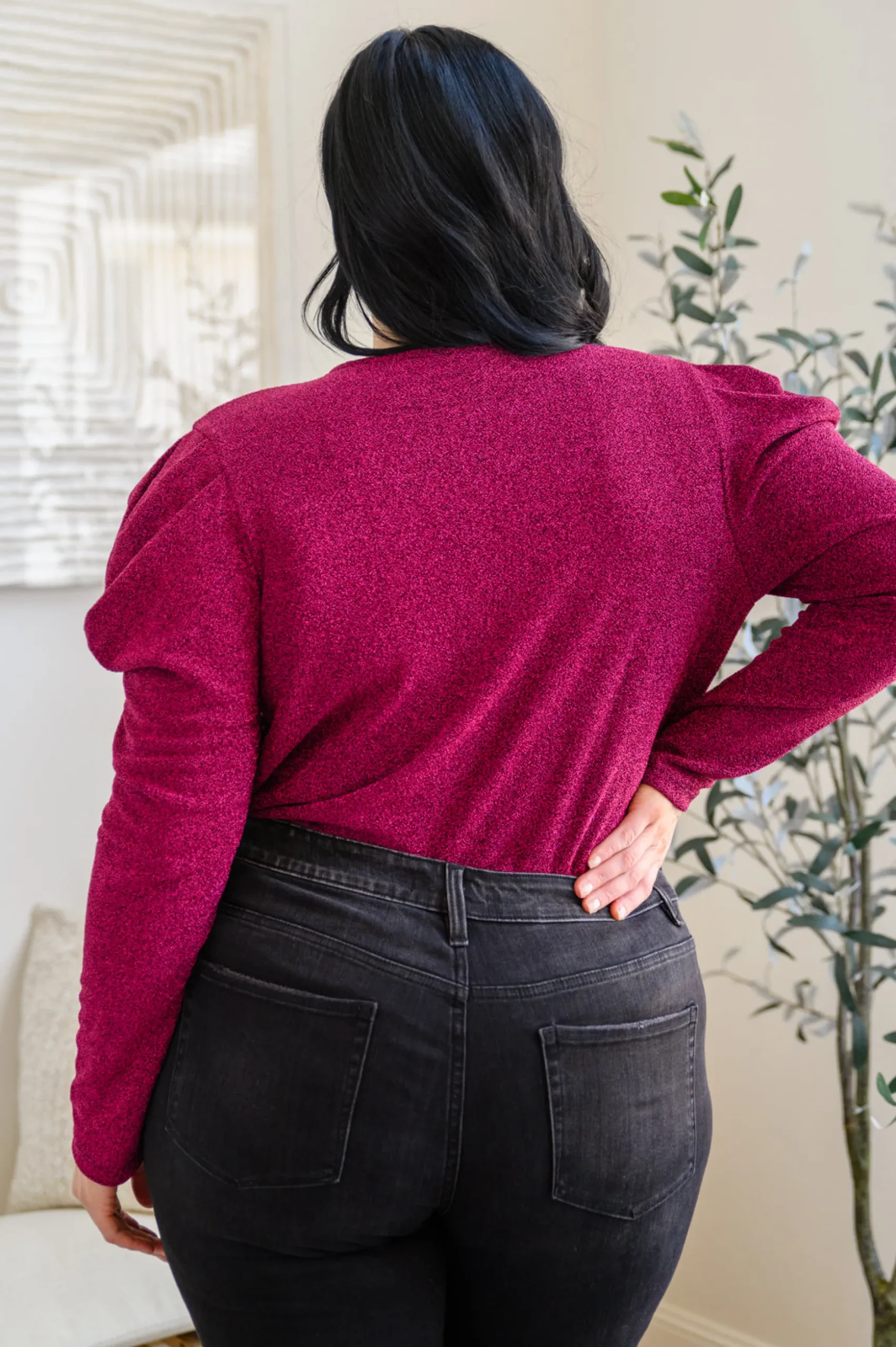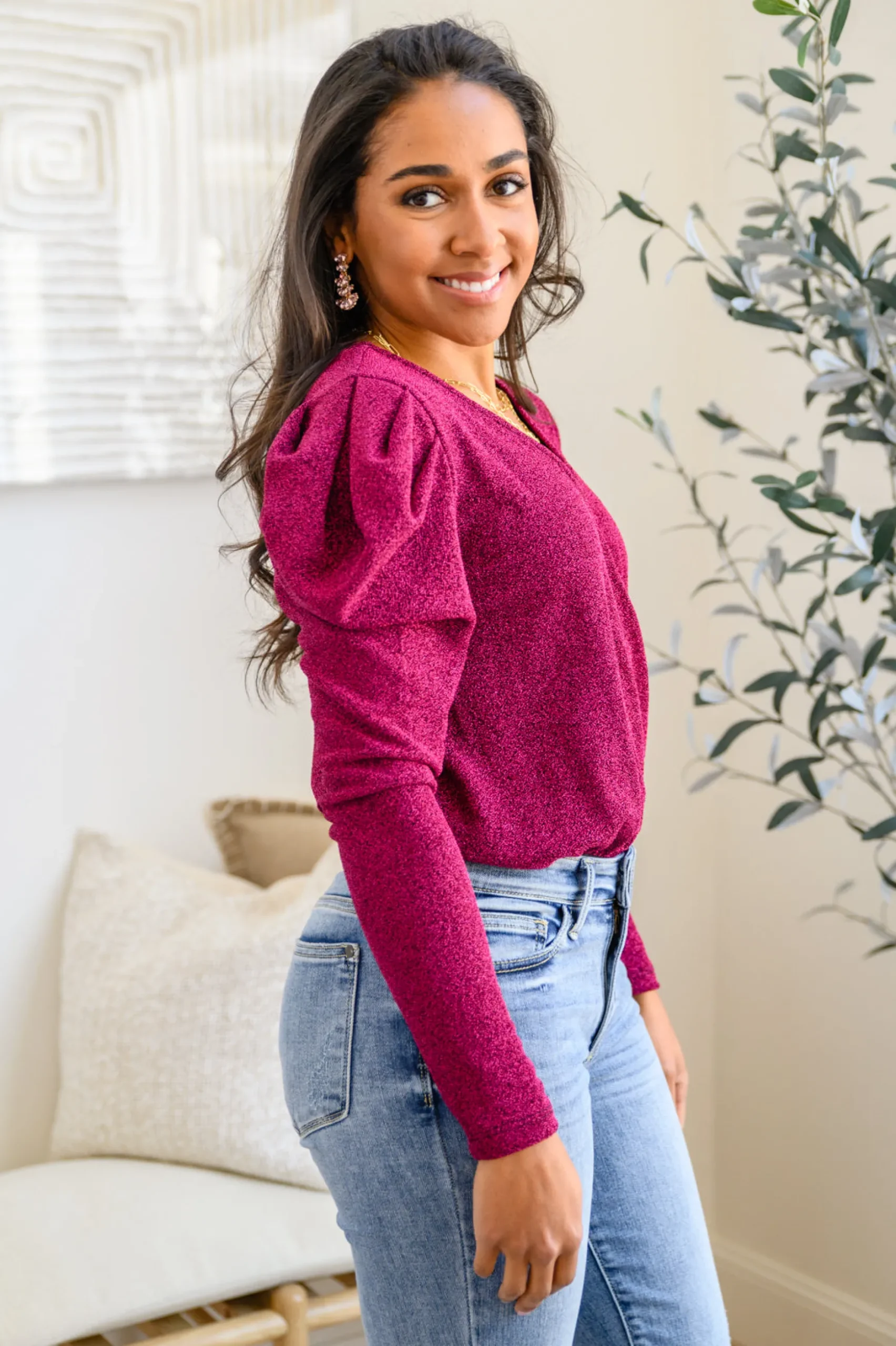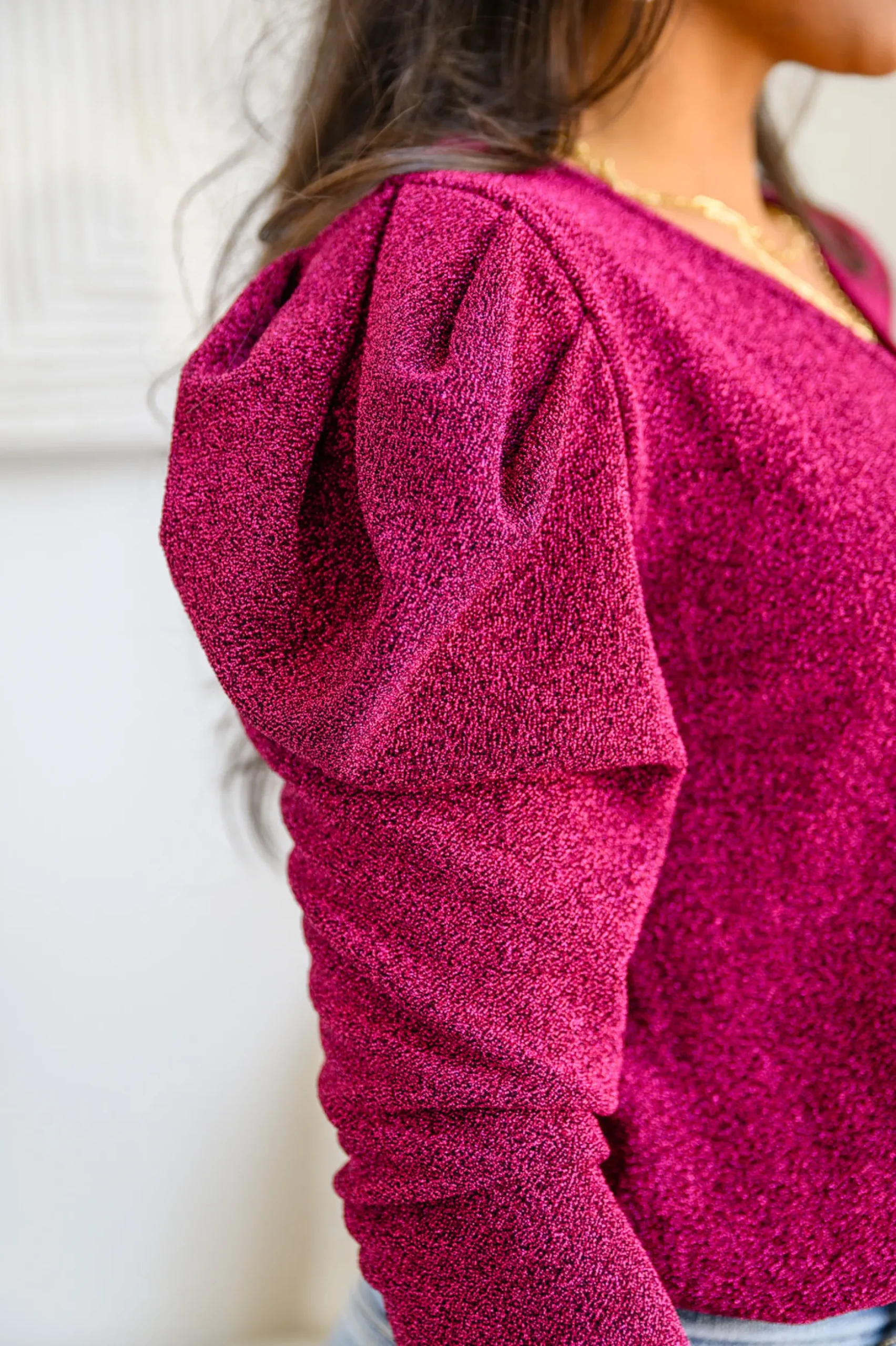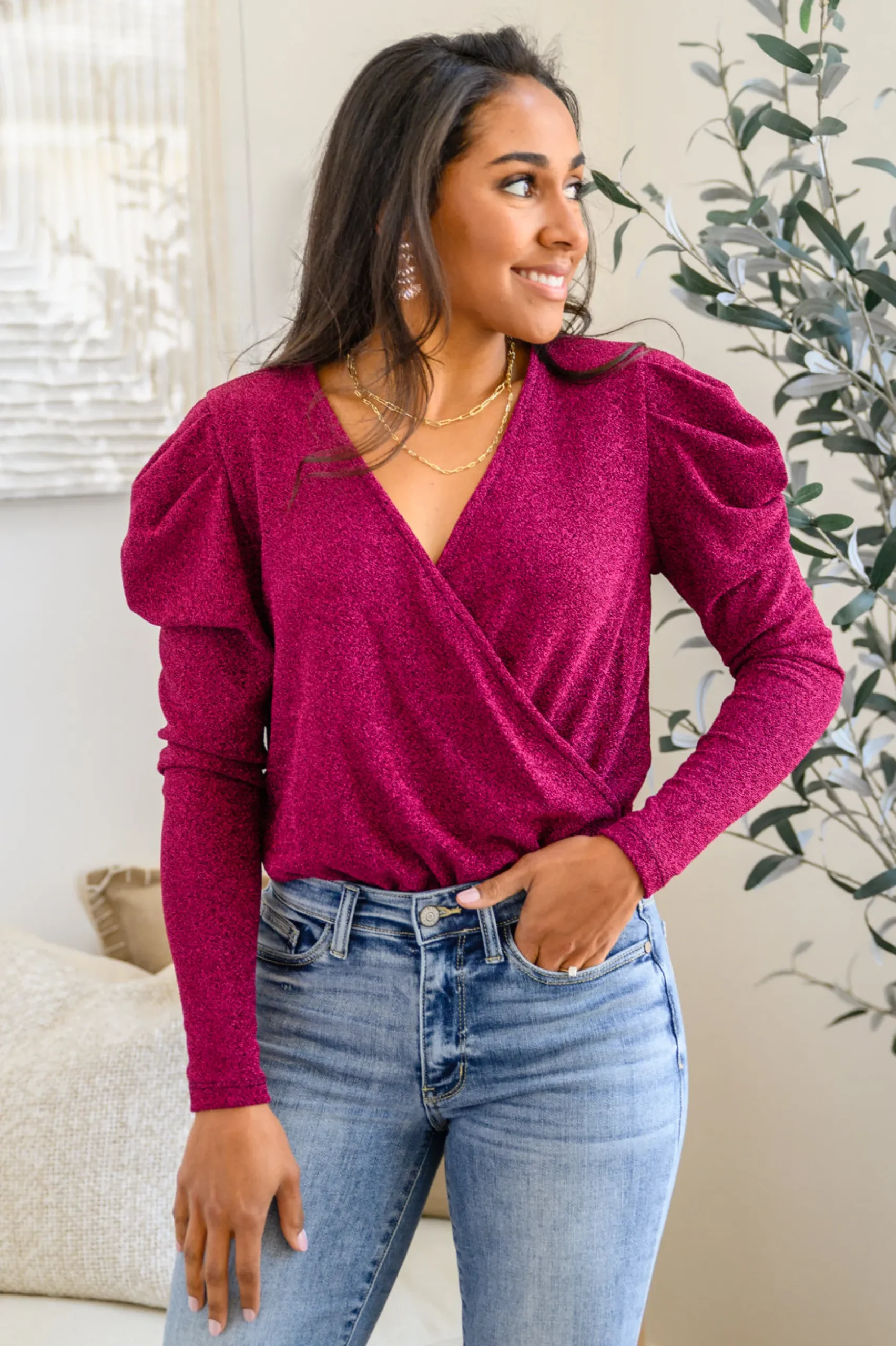Your shine can never be dulled in the Take Me Out Faux Wrap Bodysuit In Magenta! An array of glitter spreads across a lightweight knit that shapes a surplice neckline and long puff sleeves. The flirty bodice continues down to attached knit full coverage bottoms that secure with a snap closure.