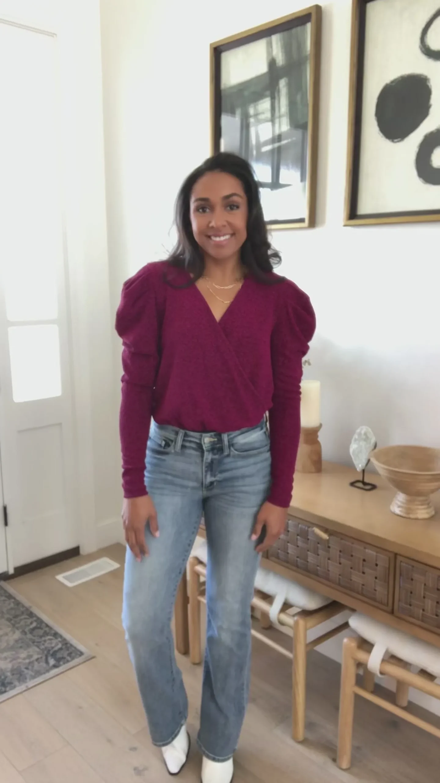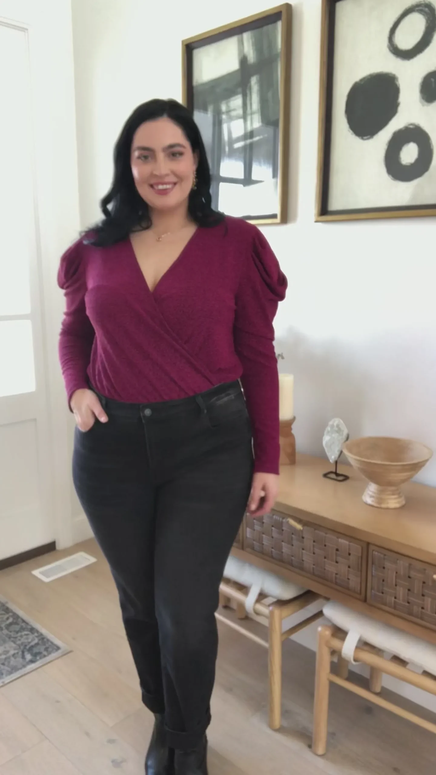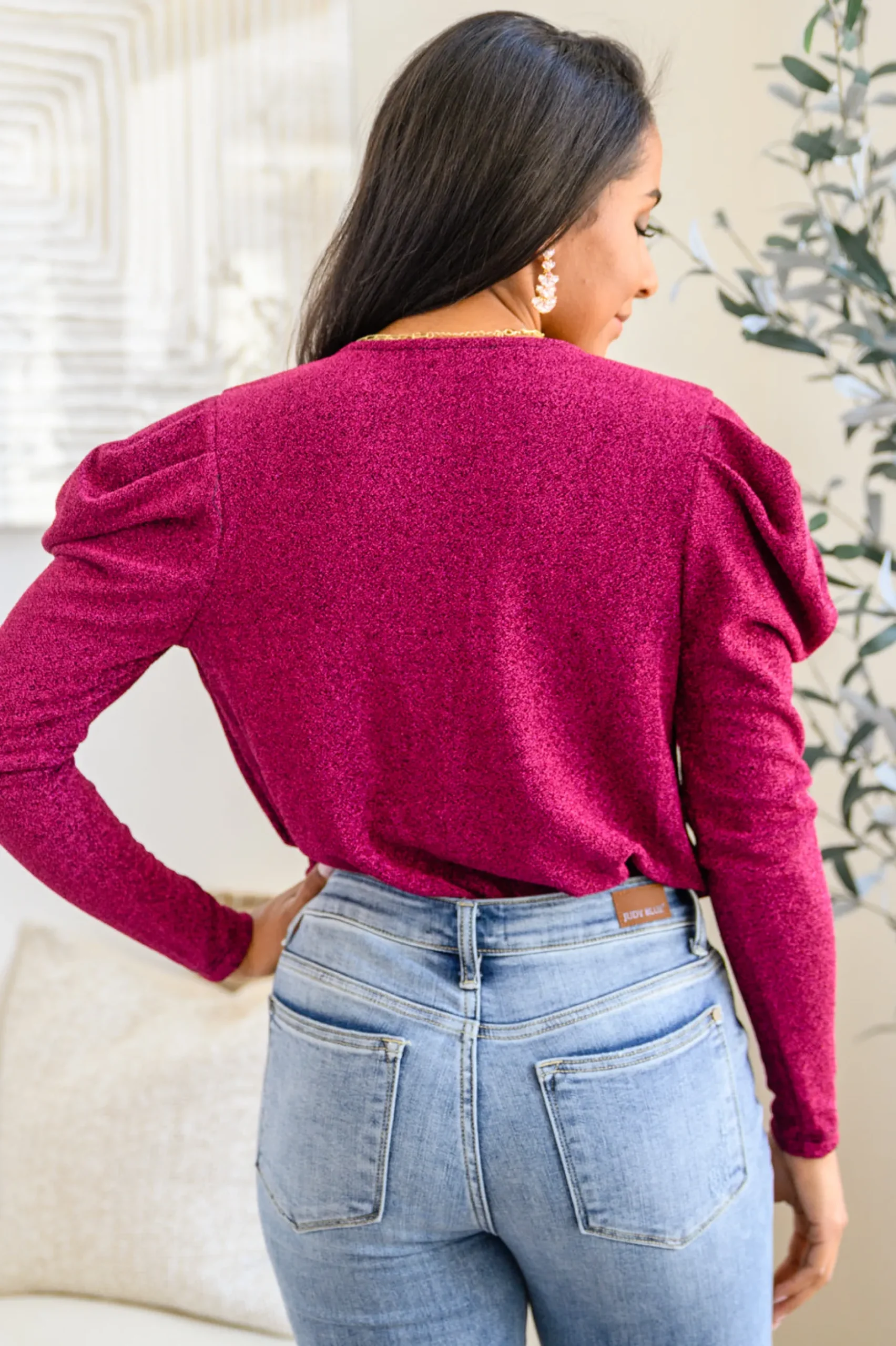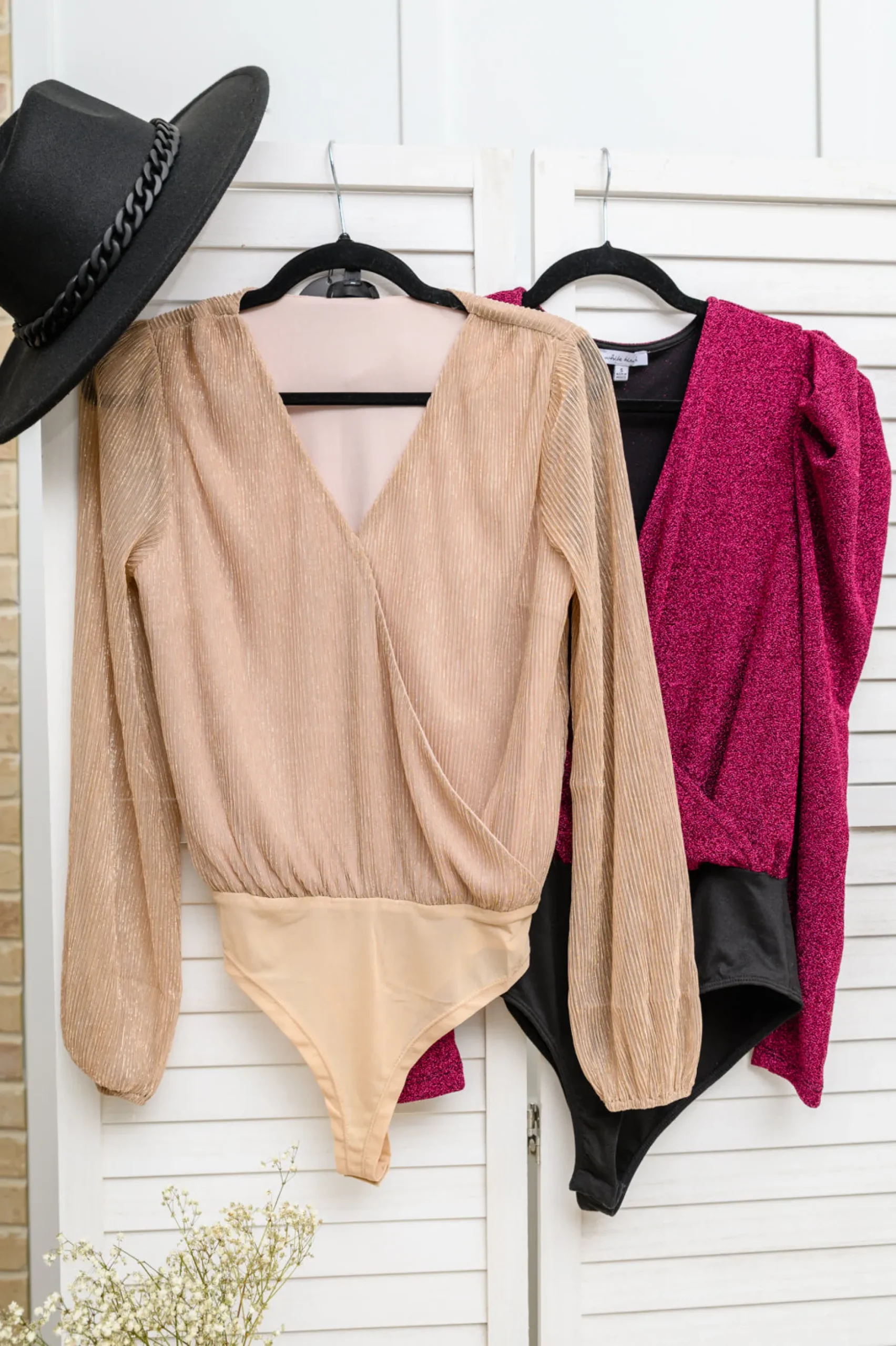 Your shine can never be dulled in the Take Me Out Faux Wrap Bodysuit In Magenta! An array of glitter spreads across a lightweight knit that shapes a surplice neckline and long puff sleeves. The flirty bodice continues down to attached knit full coverage bottoms that secure with a snap closure.