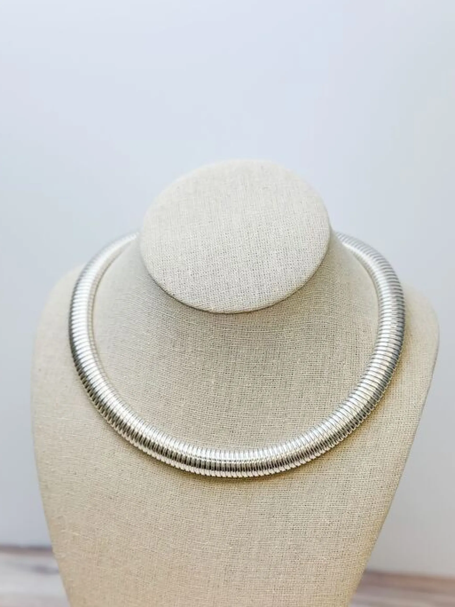 Elevate your look with our Textured Collar Necklace in vintage silver. This statement piece adds a touch of sophistication to any outfit, making it perfect for both casual and formal occasions.