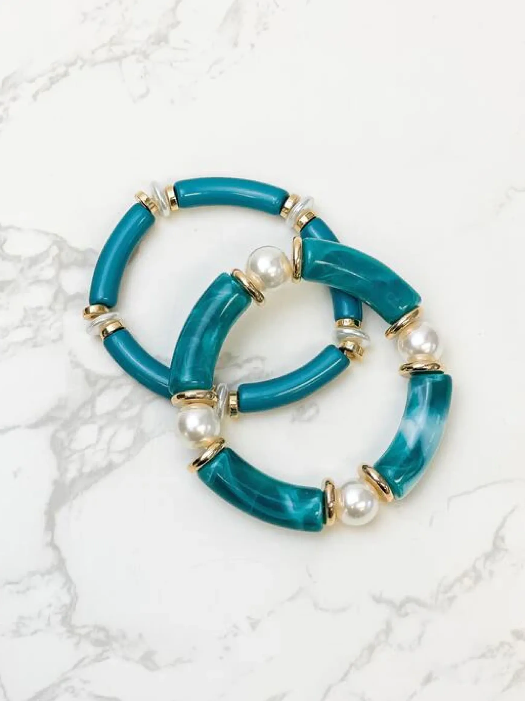 Be the first to review “Acrylic Pearl Tube Bracelet Set – Teal” Cancel reply