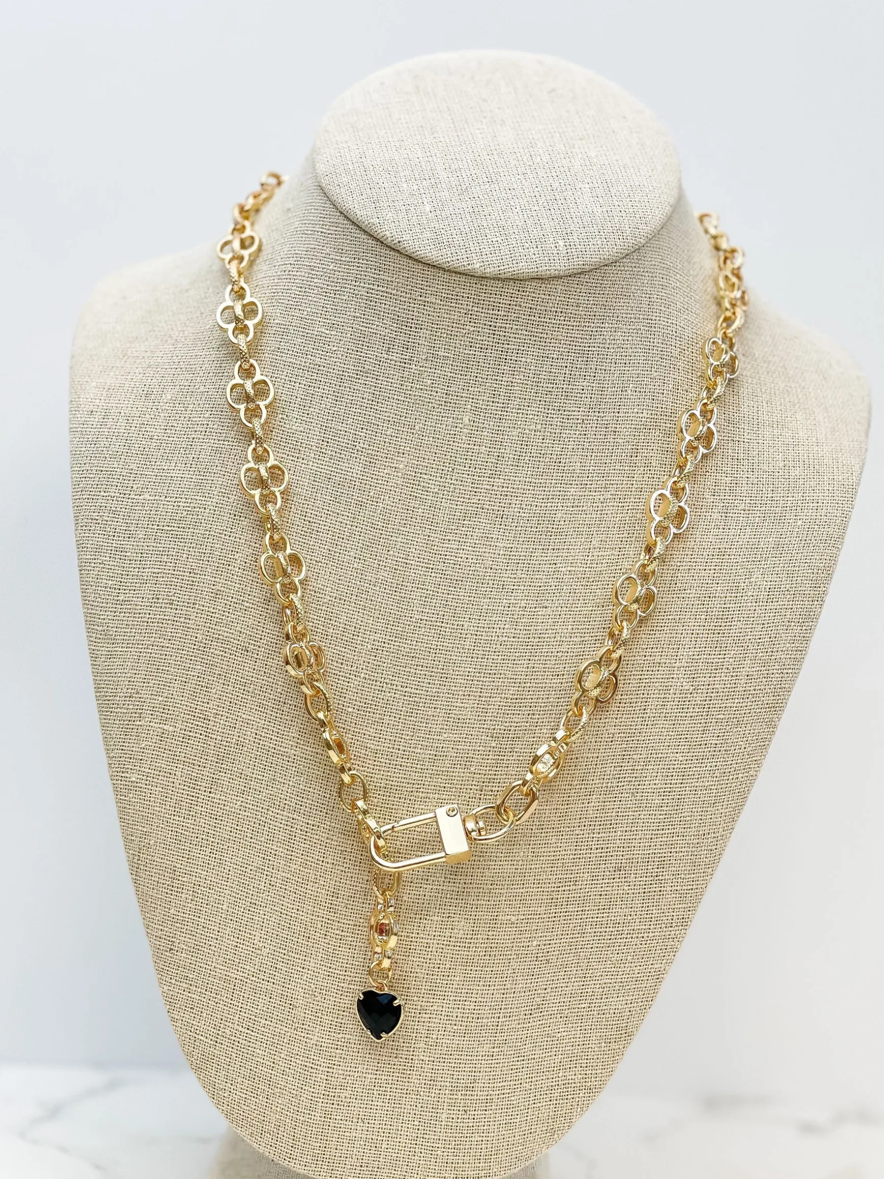 The heart pendant hangs at one end of the chain, and a clasp at the other end wraps around and can be hooked onto any link!
