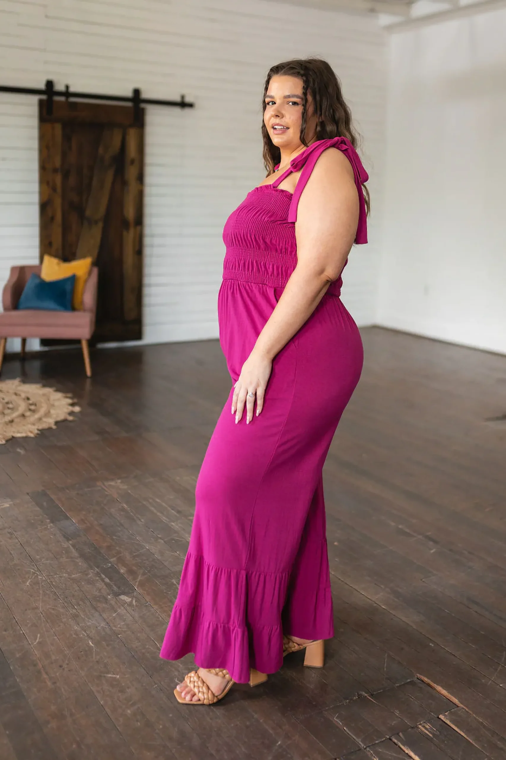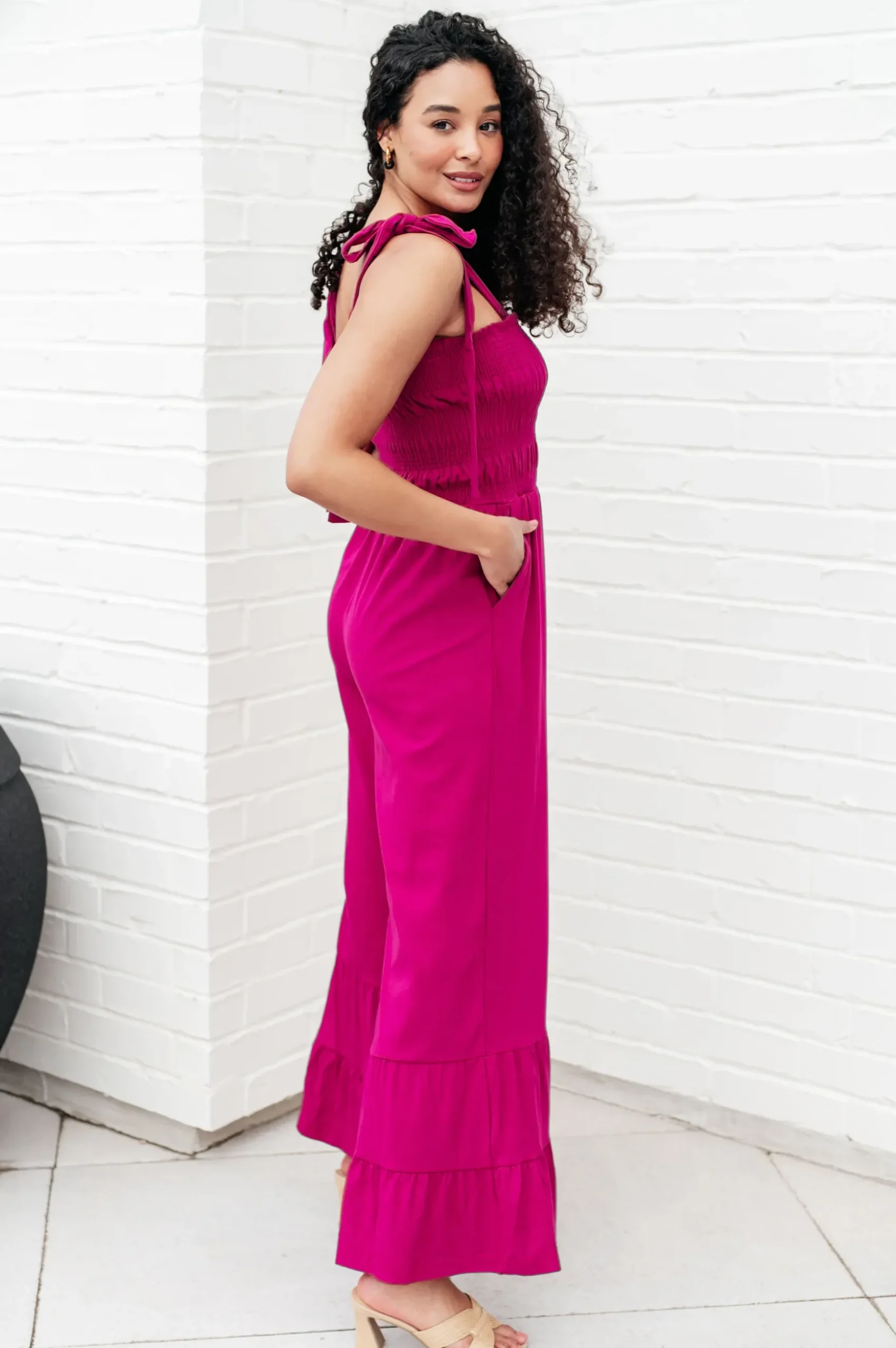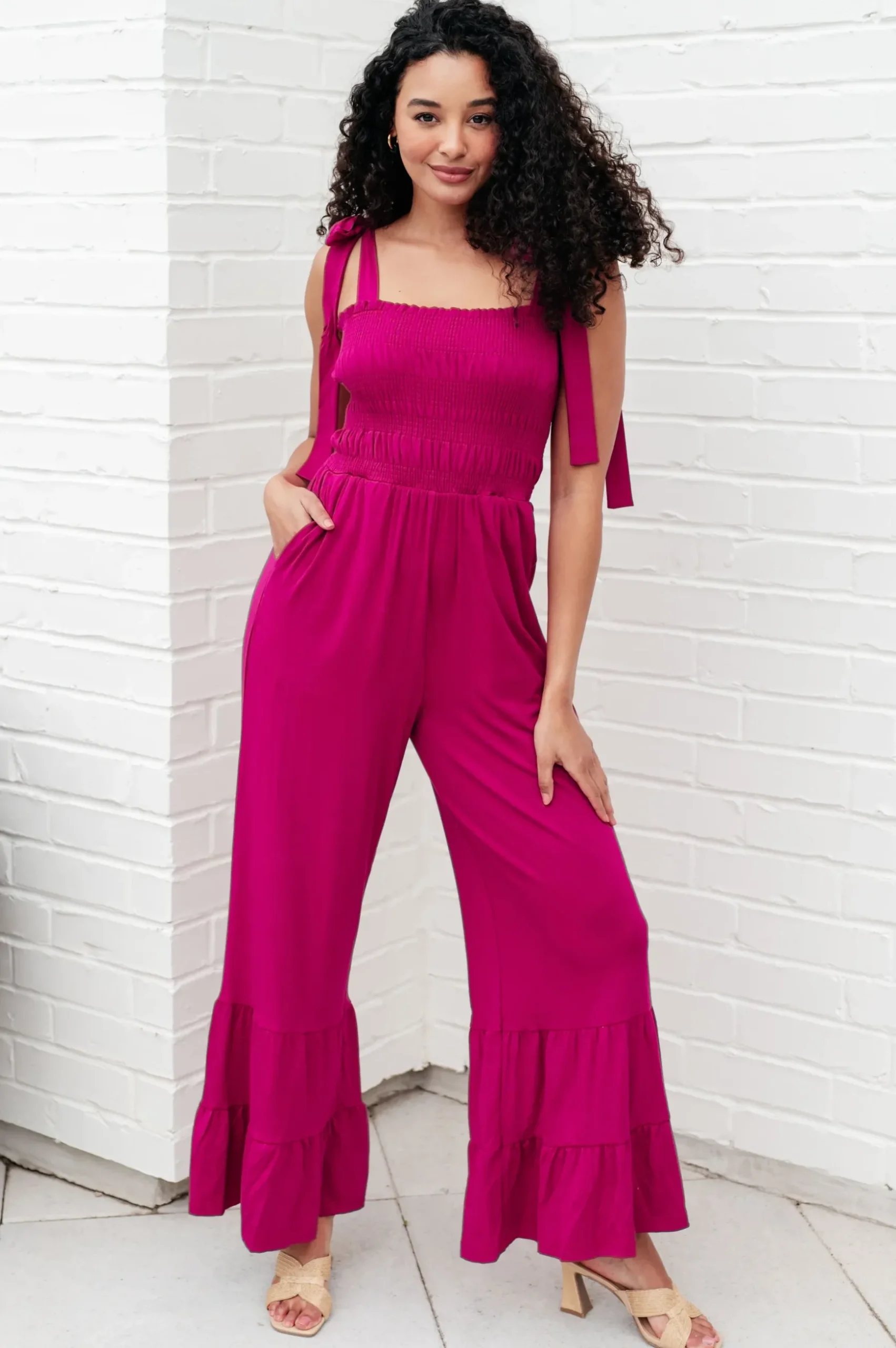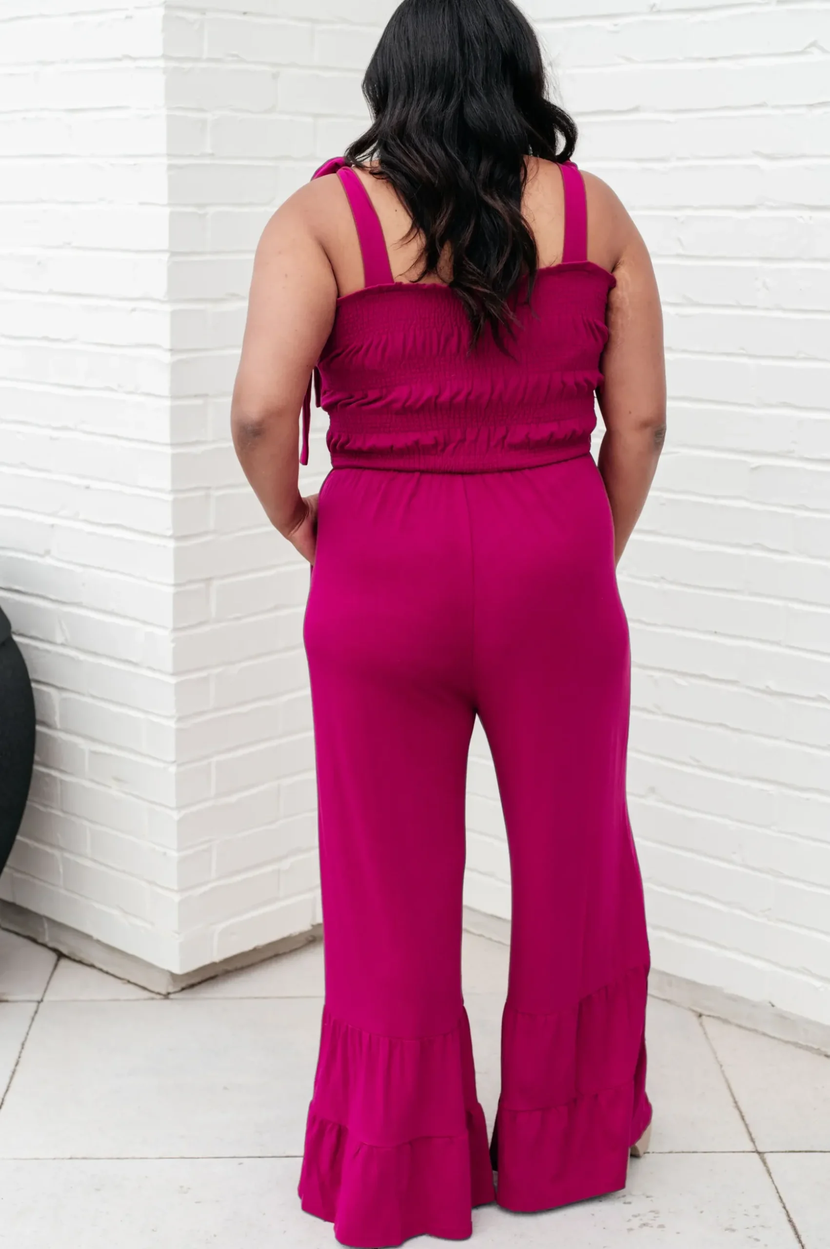 This Almost Available Flared Jumpsuit is perfect for every occasion. Crafted from thick jersey knit, this jumpsuit features smocking and adjustable straps for a comfortable fit. Plus, it has convenient pockets and a tiered, flared hemline for added style. Get the perfect fit for a fashionable look.