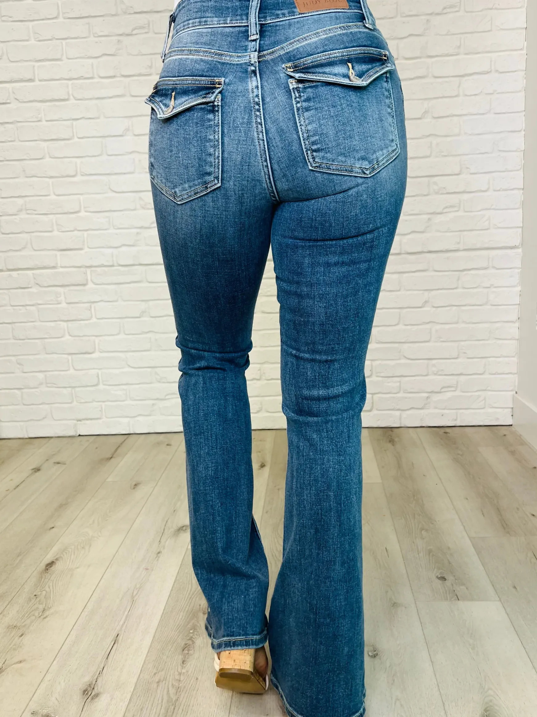 Step into the past with our Ariana High Rise Double Button Waistband Flare Jeans. Featuring a wide double button waistband and throwback vintage feel, these jeans will give you a flattering and comfortable fit. The flared silhouette and high rise and button closure flap back pockets add a touch of quirky style. And with non-distressed fabric and 4-way stretch, you’ll look and feel your best all day long. Time to make a statement in these playful and trendy jeans!