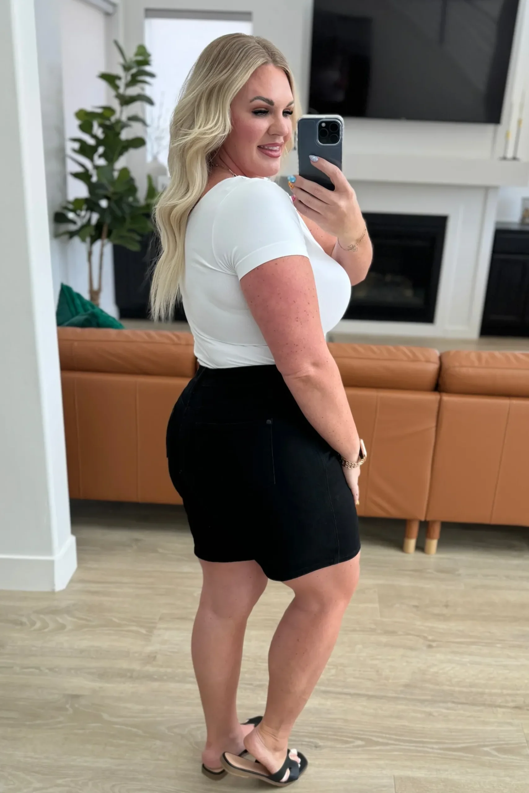 Introducing the Ava High Rise Control Top Cuffed Shorts in Black – the perfect blend of style and comfort. Featuring a high rise fit and tummy control technology, these shorts offer a flattering and slimming look. The optional rolled cuff adds versatility, while the garment dyed black color and black hardware give these shorts a sleek and modern feel. Upgrade your wardrobe with these must-have shorts.