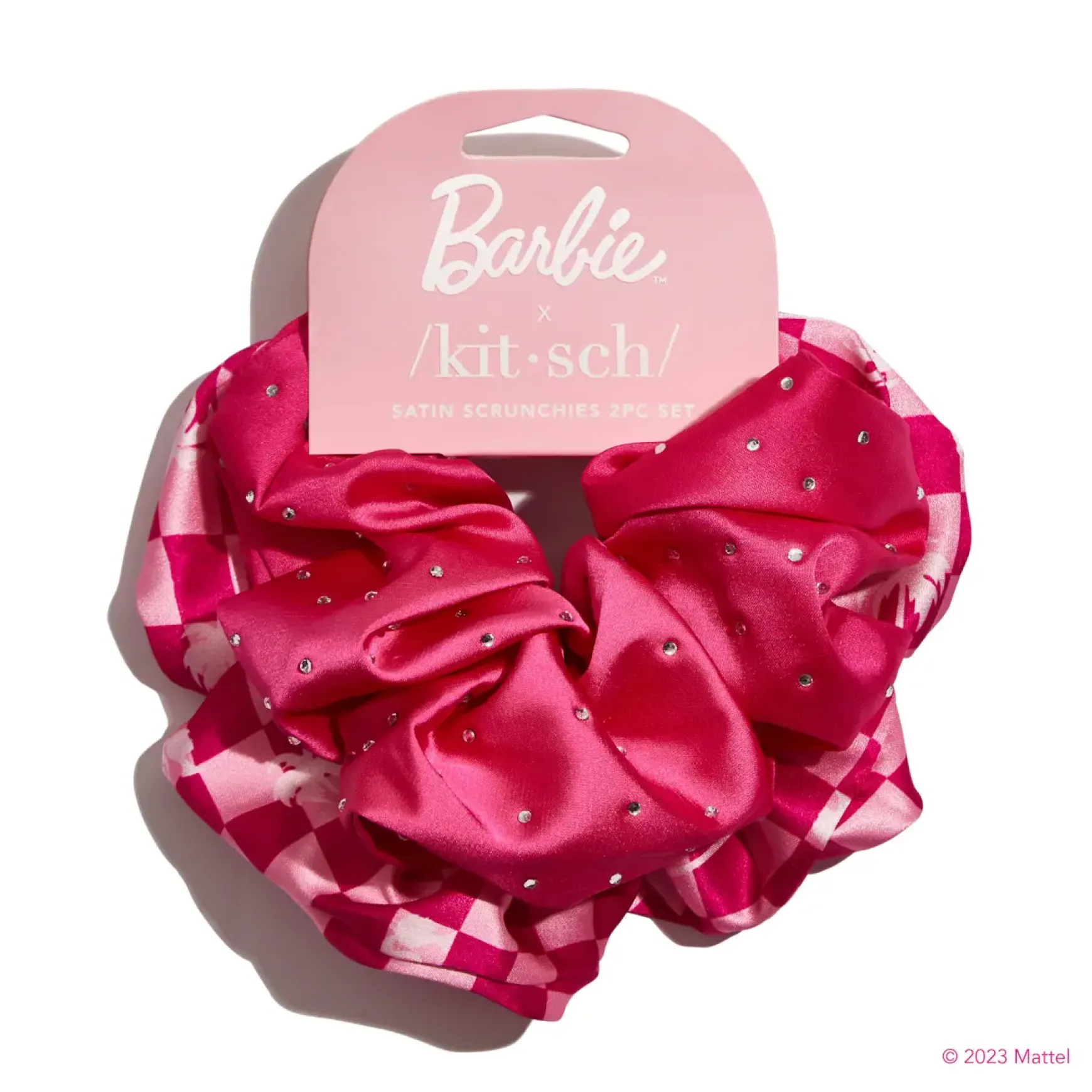 Set includes two fashionably fun scrunchies in shades of barbie pink