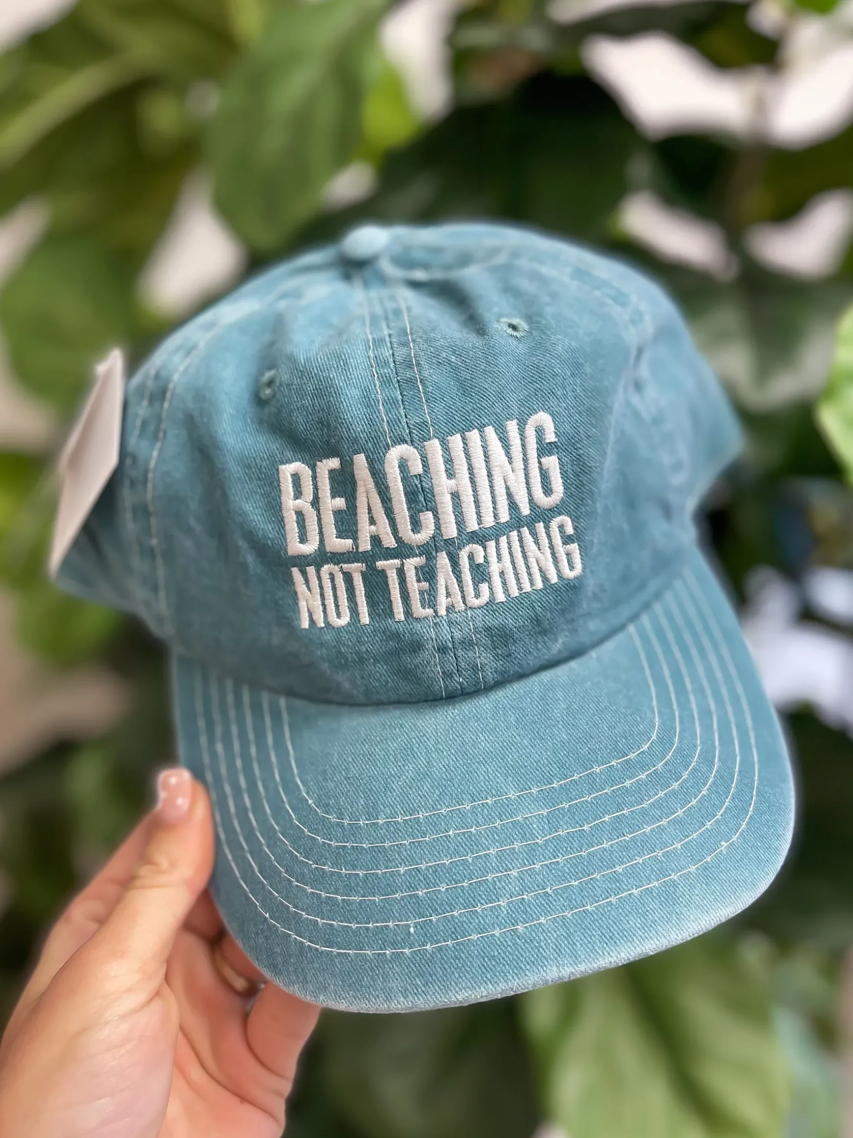 A cotton baseball cap with an adjustable brass closure on the back. Features box sign style “Beaching Not Teaching” sentiment embroidered in cream onto a weathered light blue base.