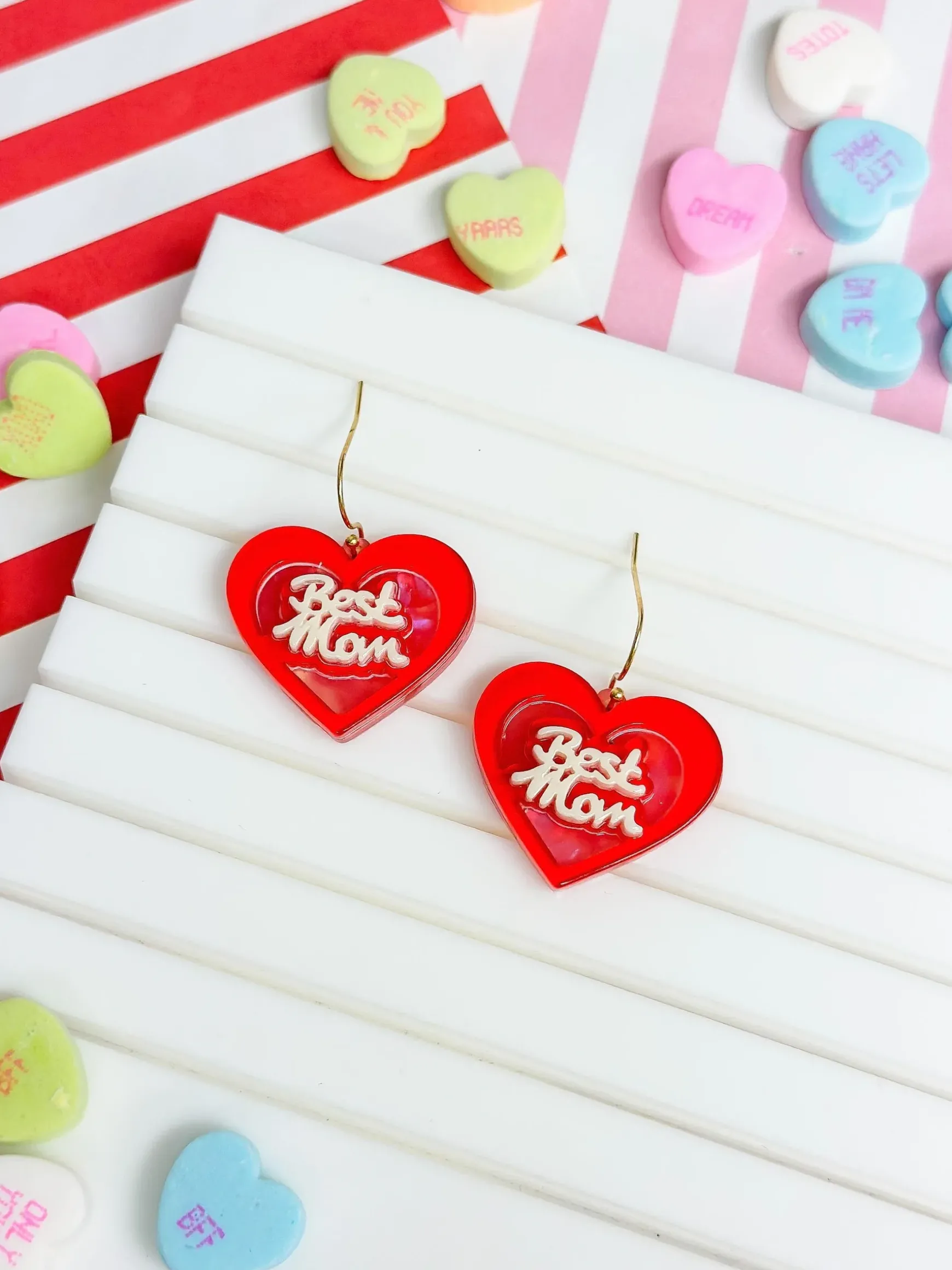 Celebrate the “Best Mom” in your life with these gorgeous Acrylic Heart Dangle Earrings.