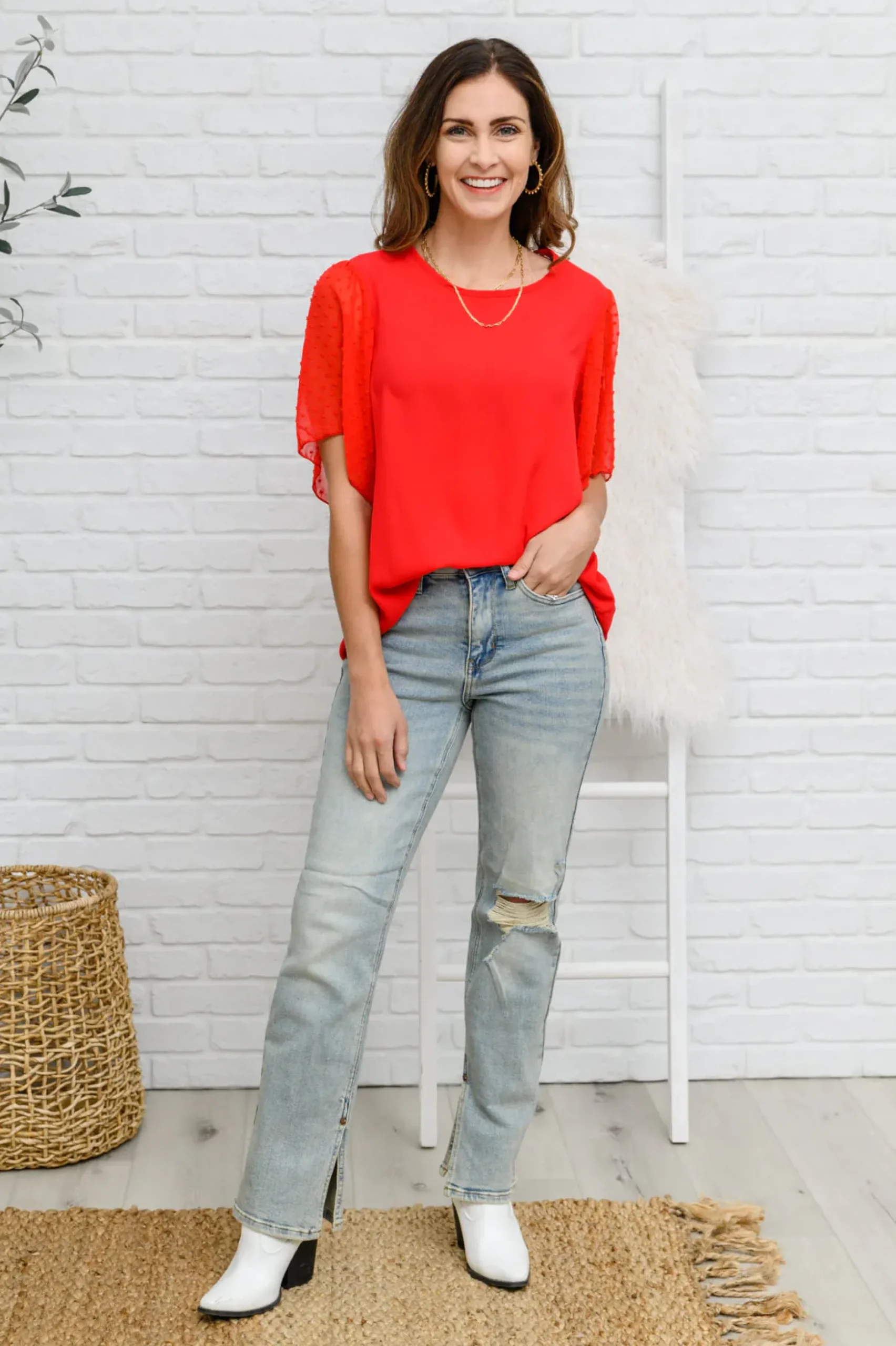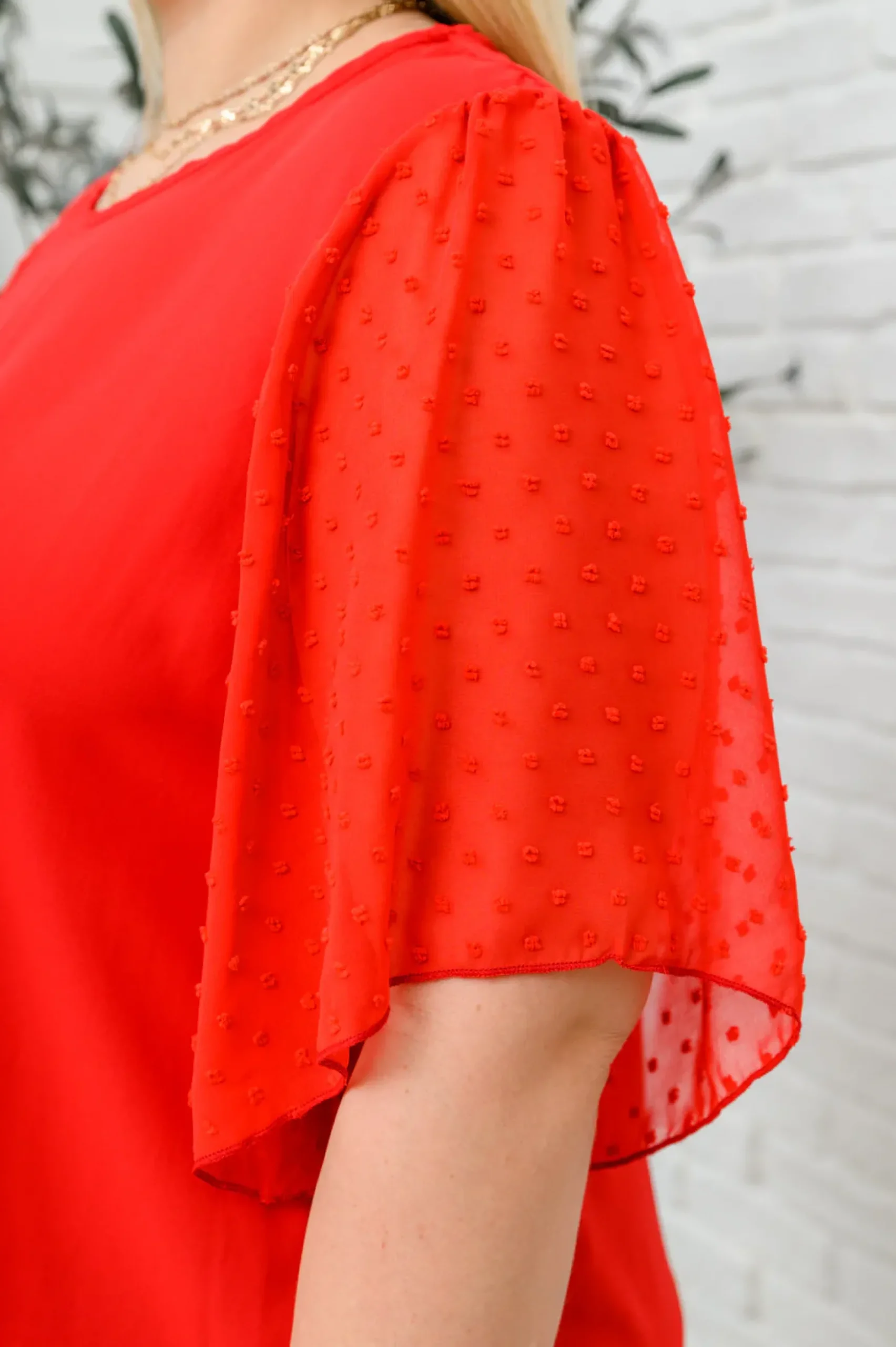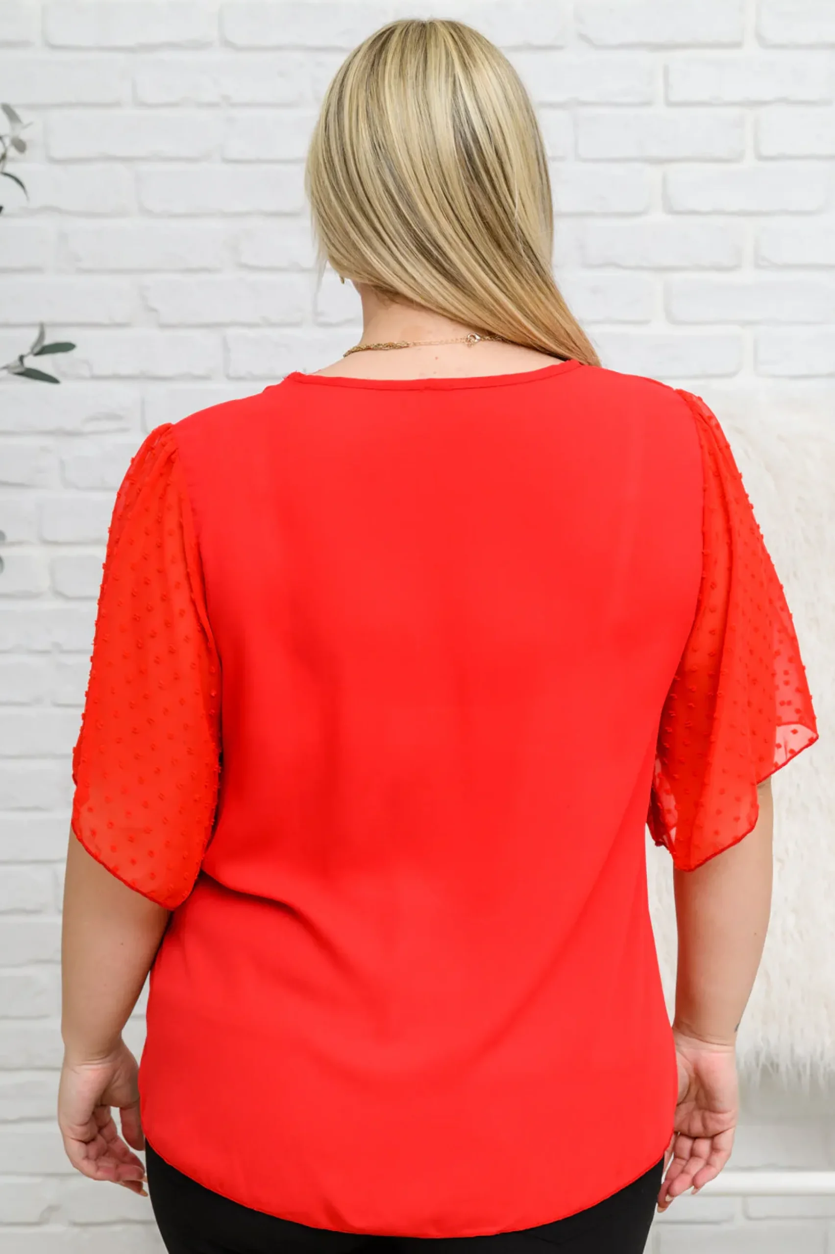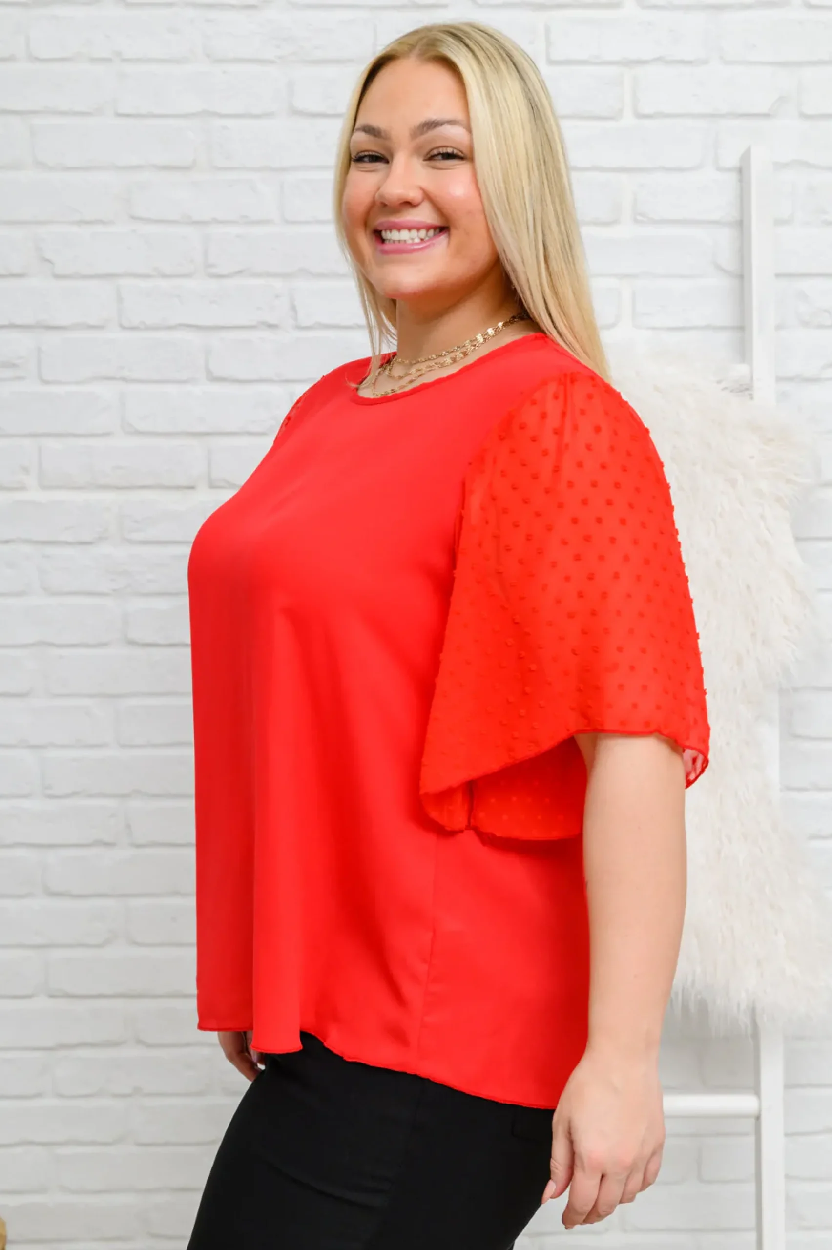 Your next date night should involve the Best of My Love Short Sleeve Blouse in Red! This romantic top features a lightweight non-stretch fabric that shapes a round neckline with a loose fit bodice and contrasting, sheer polka dot short sleeves.