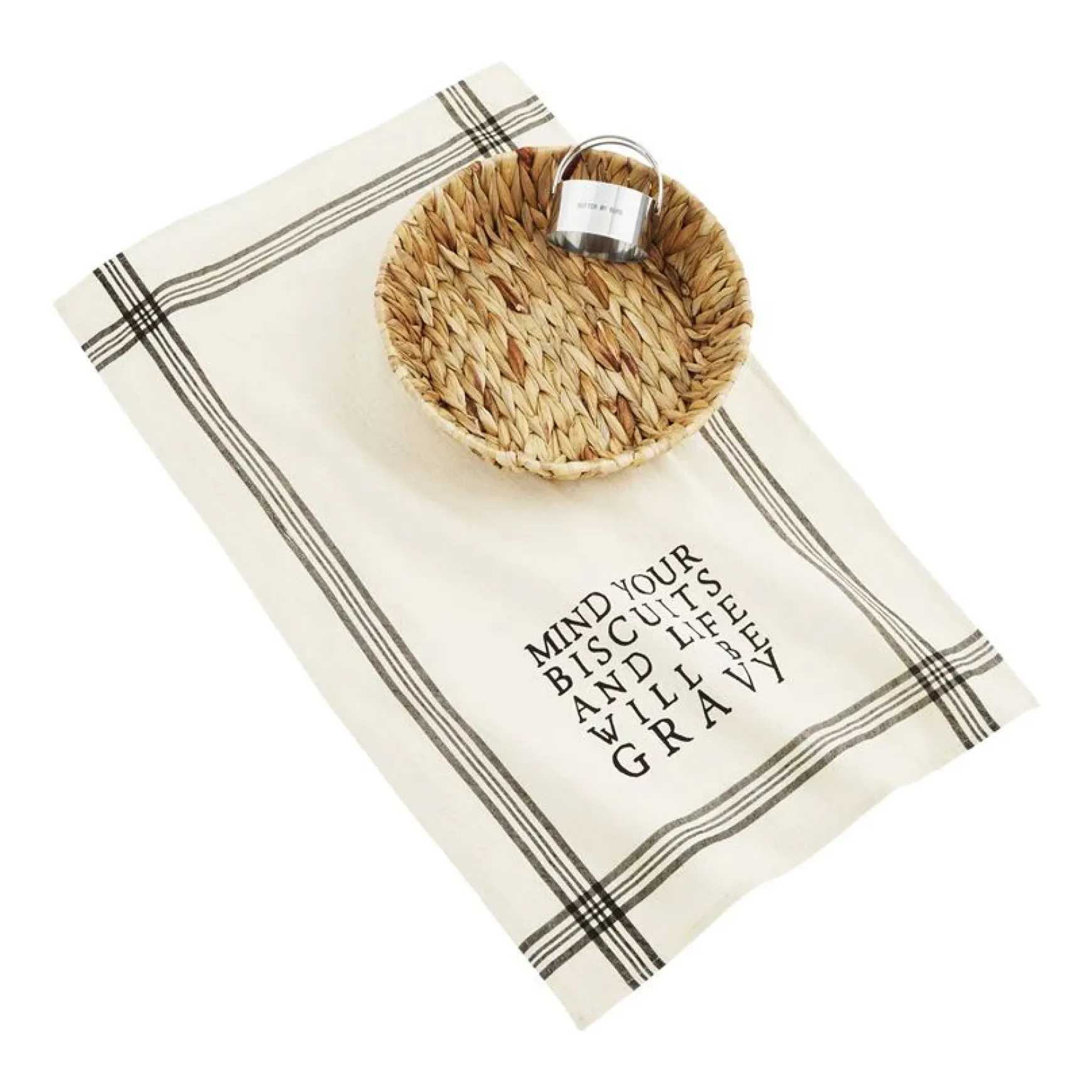“Mind your biscuits and life will be gravy!” 3-piece set. Water hyacinth basket comes with cotton hand towel and stainless steel biscuit cutter.