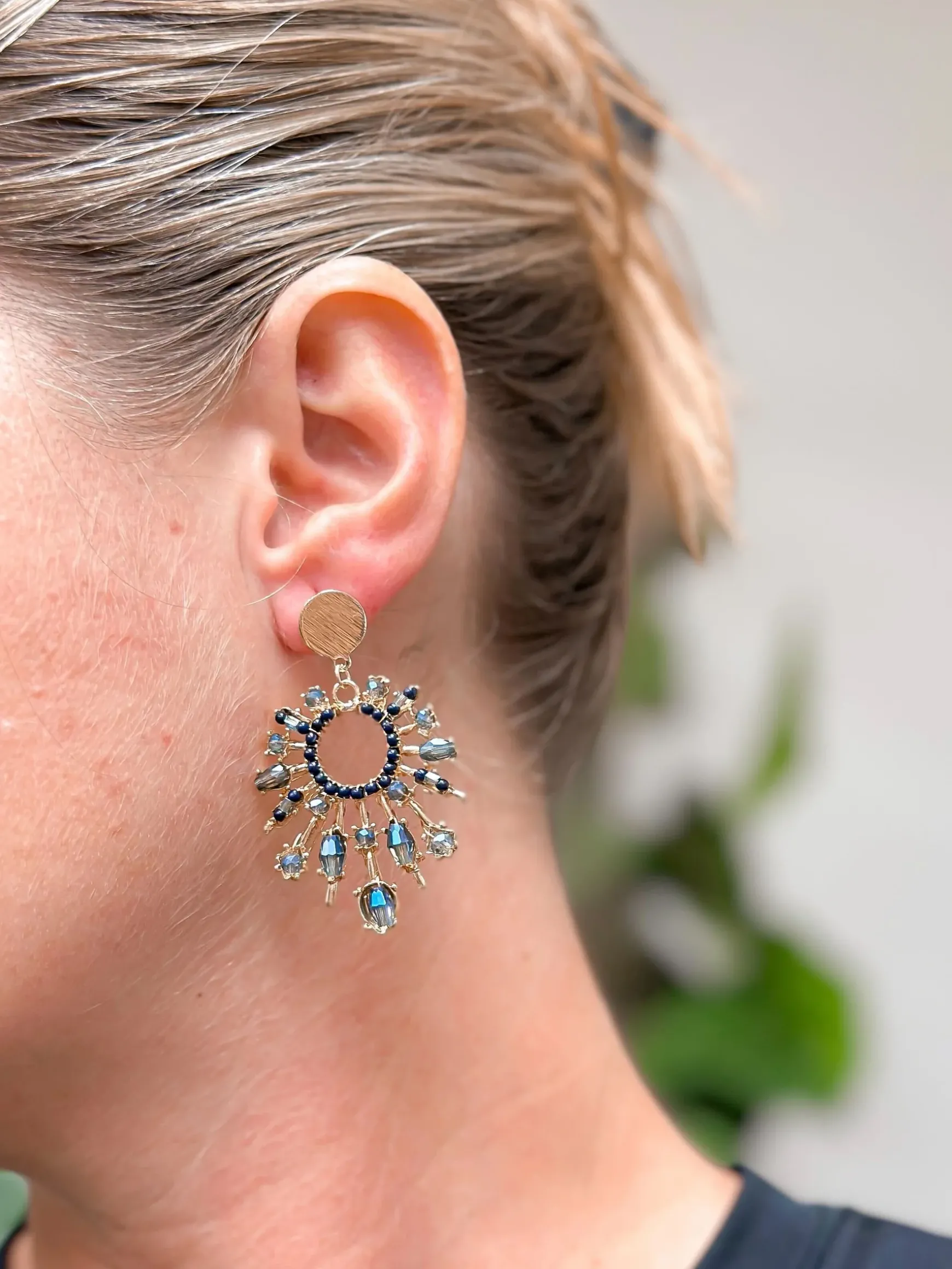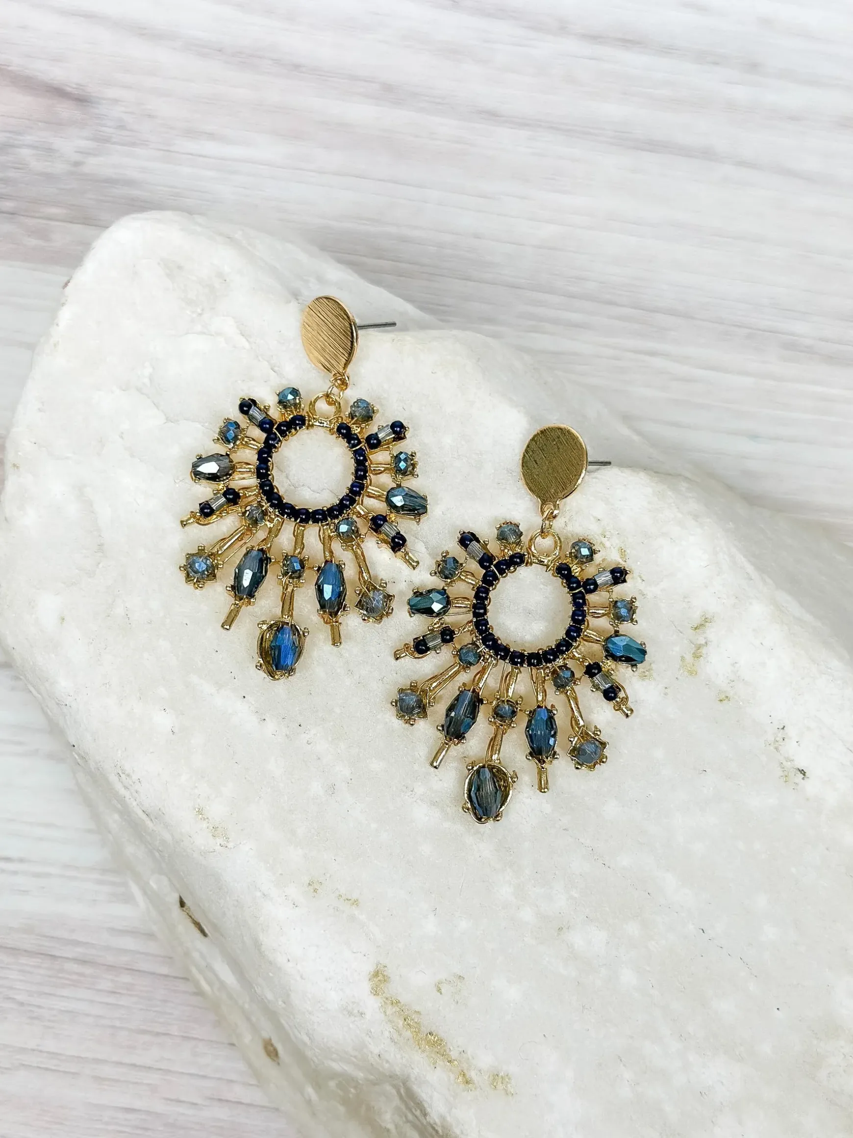 Make a statement with our Blue Beaded Burst Dangle Earrings! These gold and blue drop earrings add a touch of class and style to any outfit. Perfect for those who want to stand out and make a playful fashion statement.