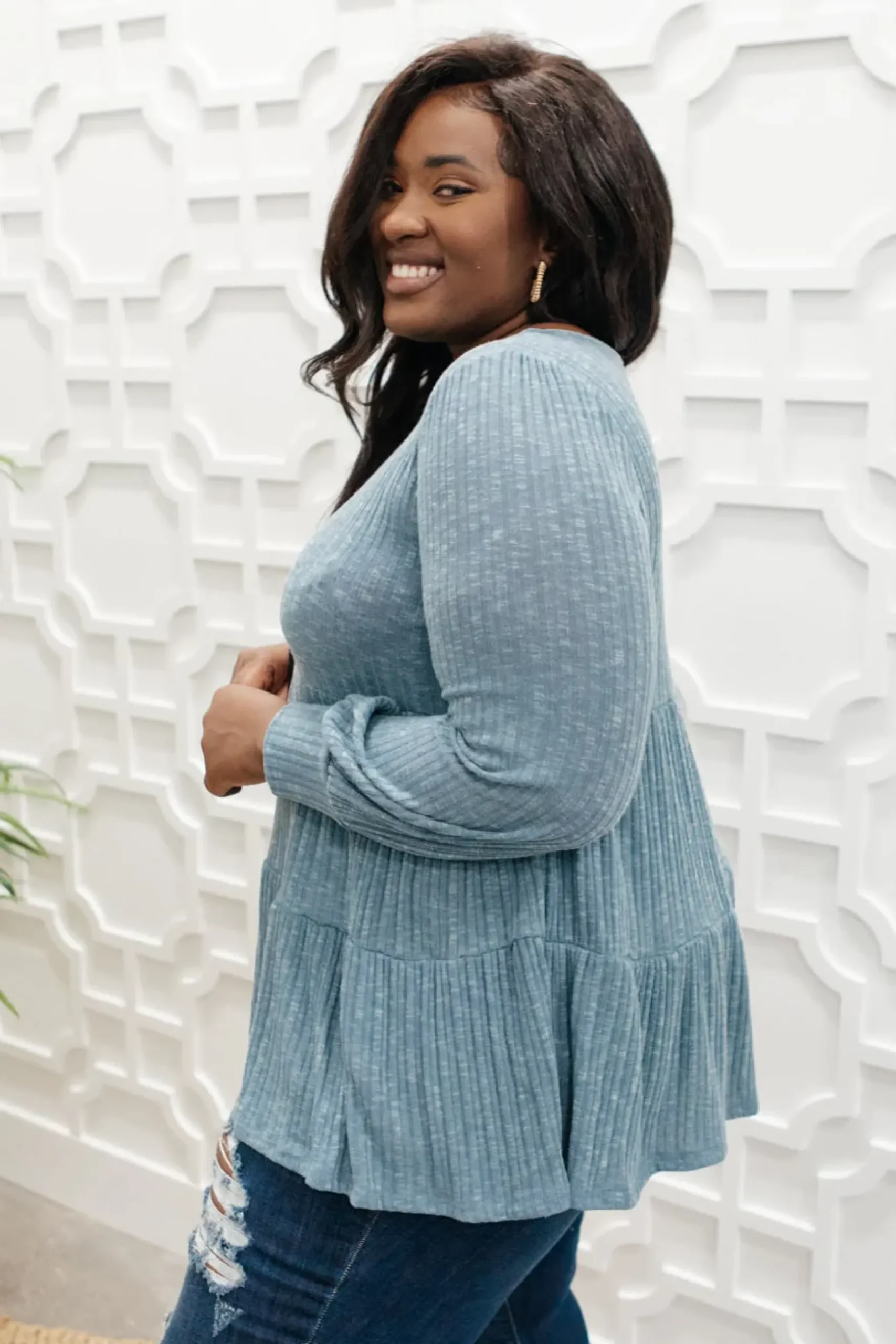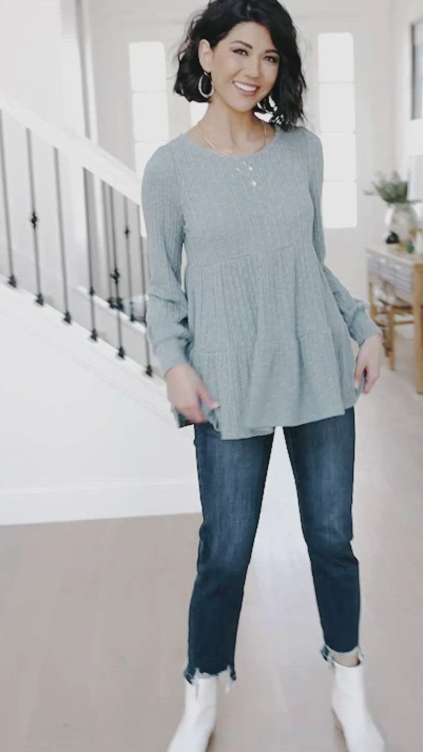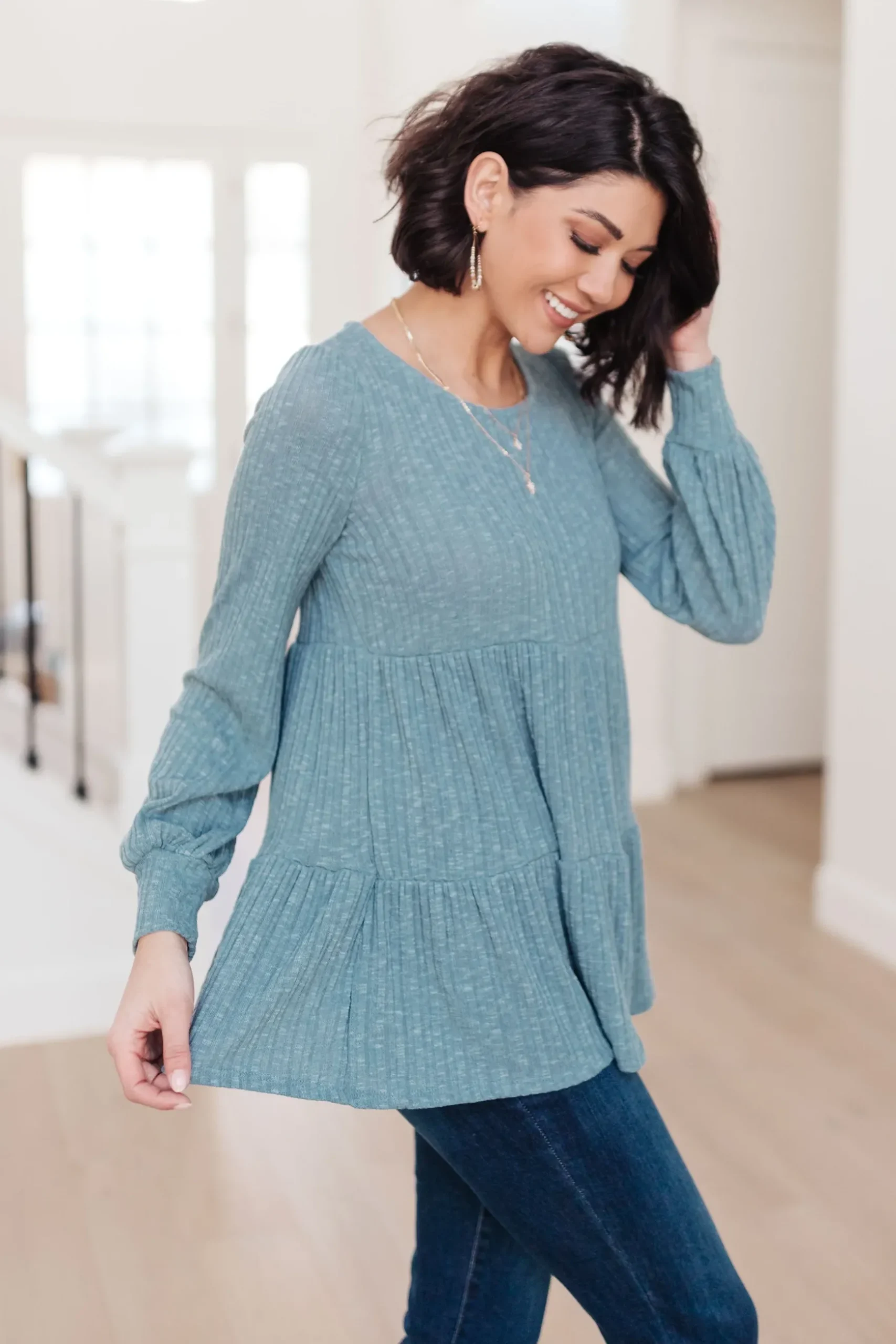 The Blue Pathways Top is made up of tiers of super soft fabric. This sweater has a beautiful flowy silhouette and balloon sleeves with a fitted cuff. Pair this romantic top with jeans and boots!