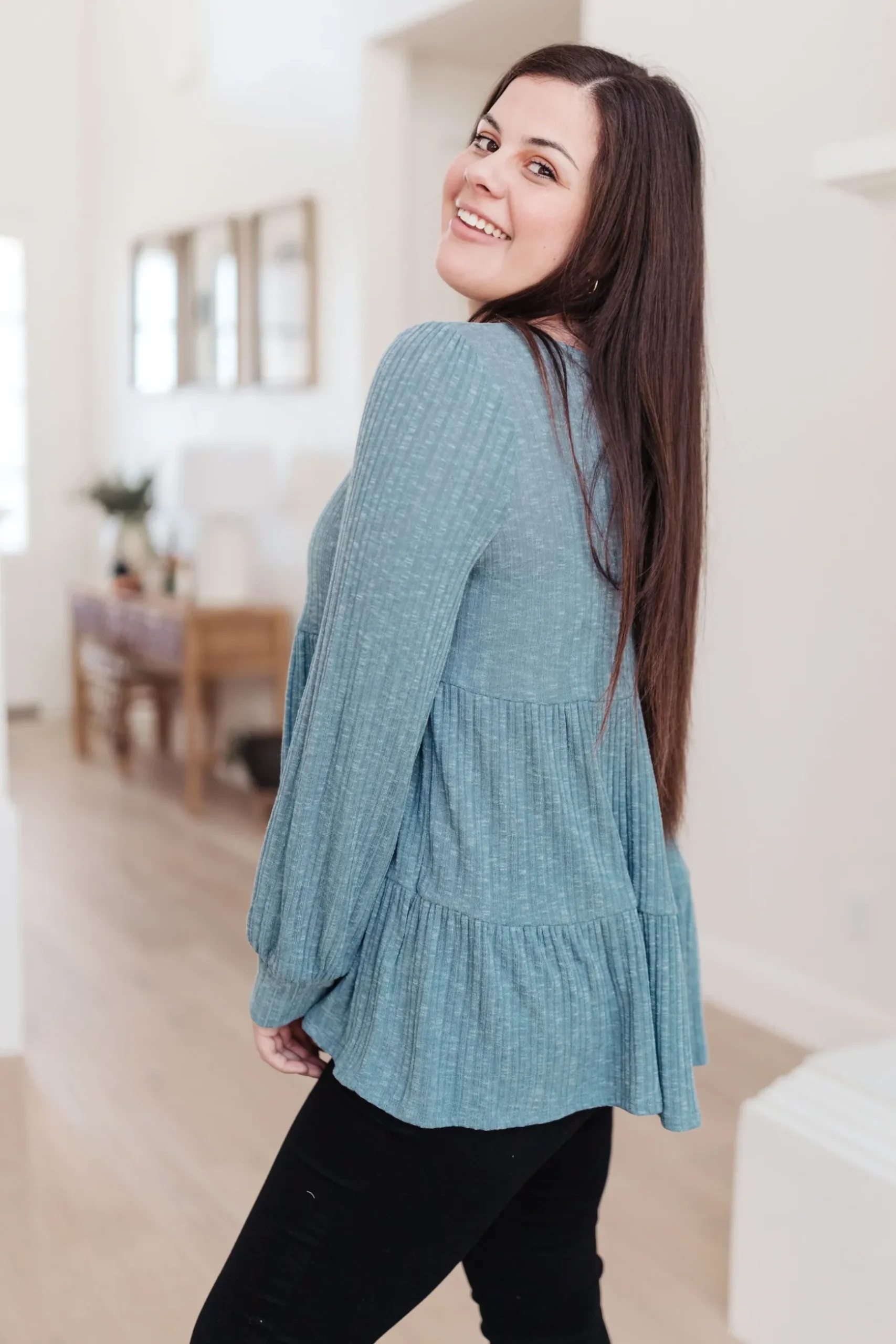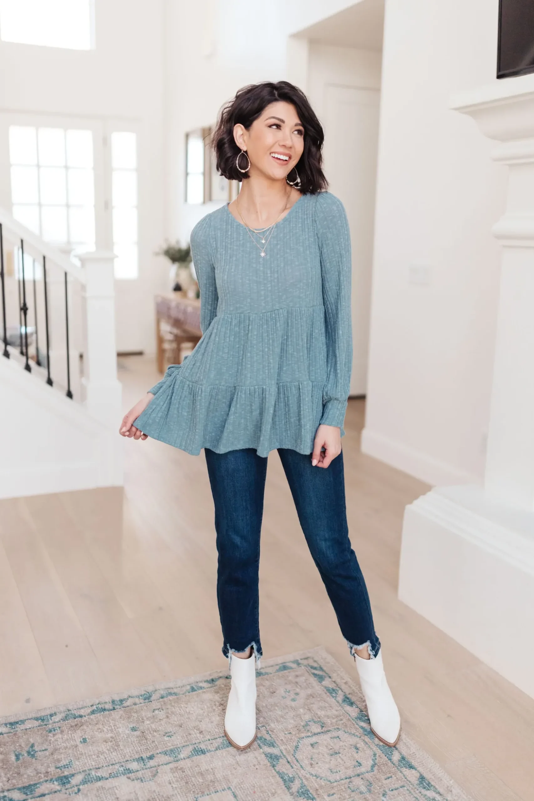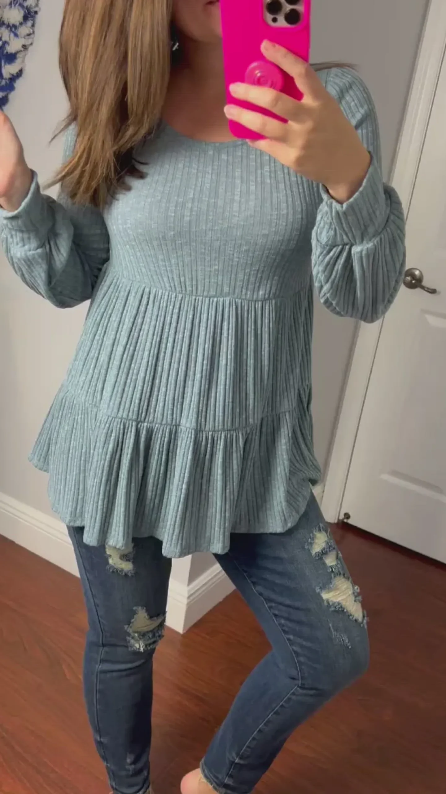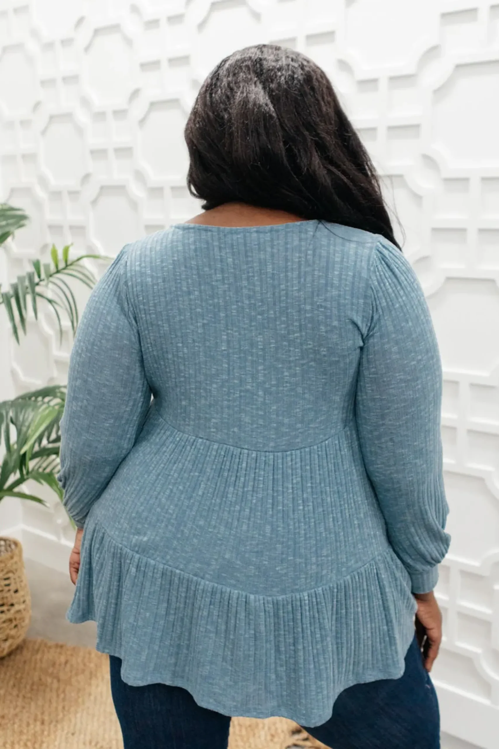 The Blue Pathways Top is made up of tiers of super soft fabric. This sweater has a beautiful flowy silhouette and balloon sleeves with a fitted cuff. Pair this romantic top with jeans and boots!