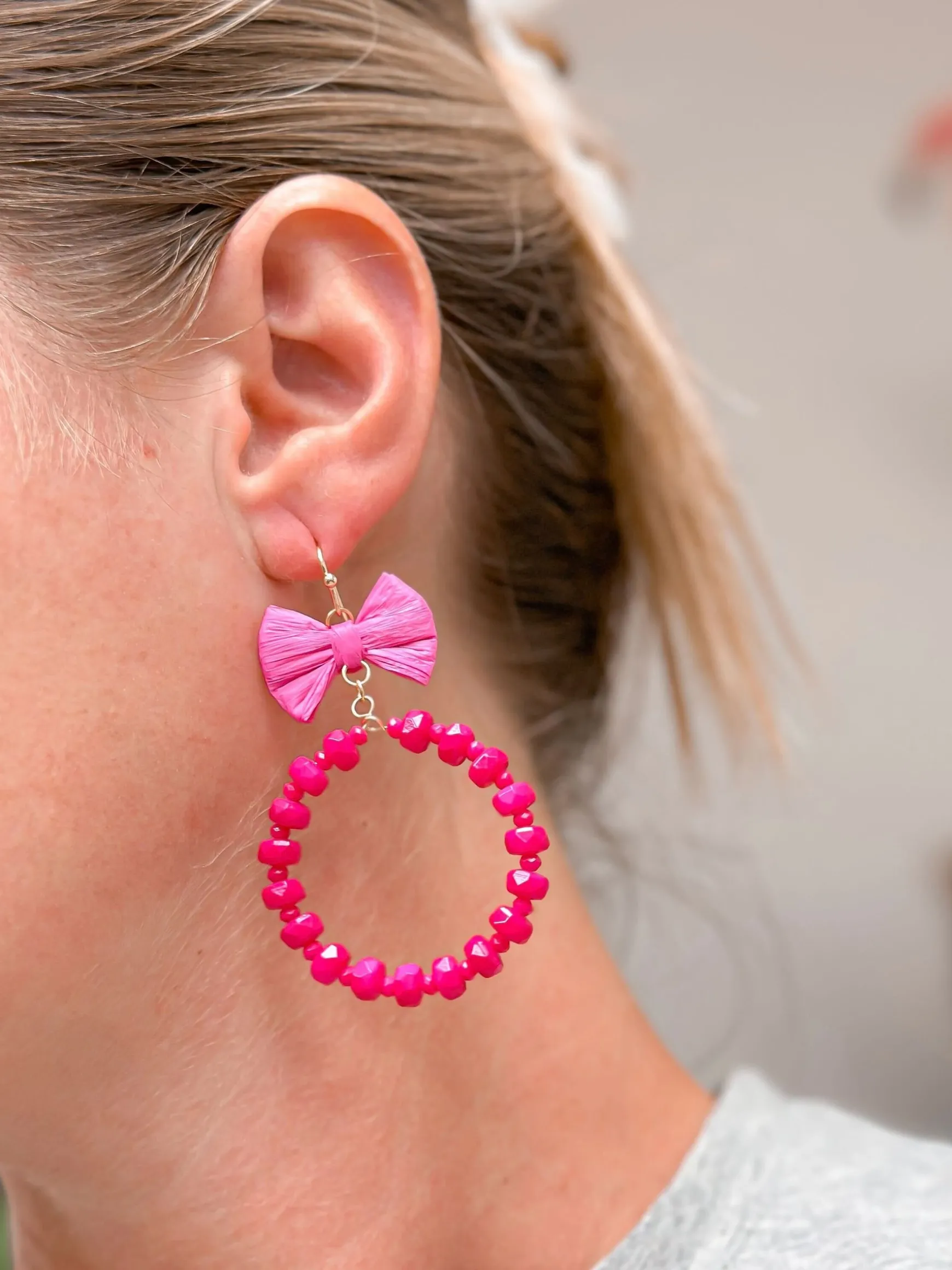 Introducing the latest fashion trend – bow post open dangle earrings in hot pink. With a unique bow design, these earrings will add a touch of elegance and playfulness to any outfit.