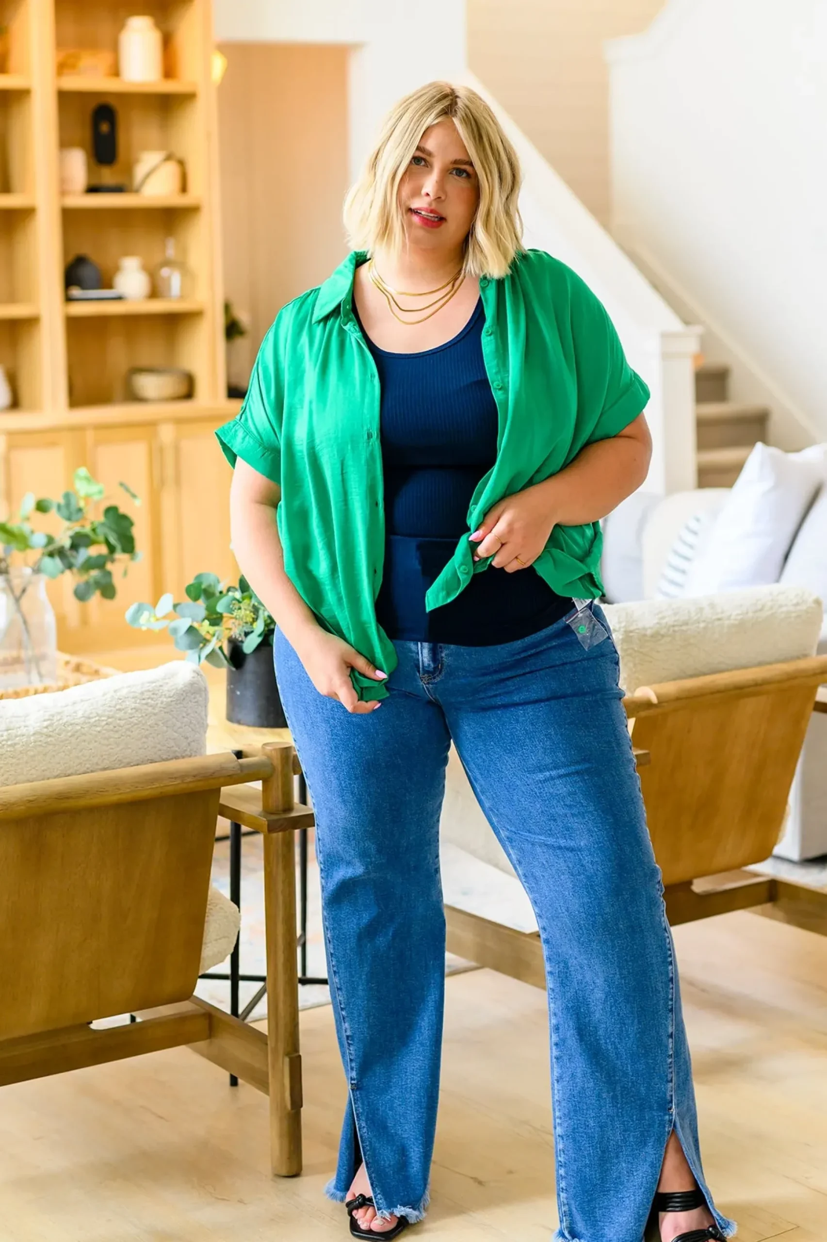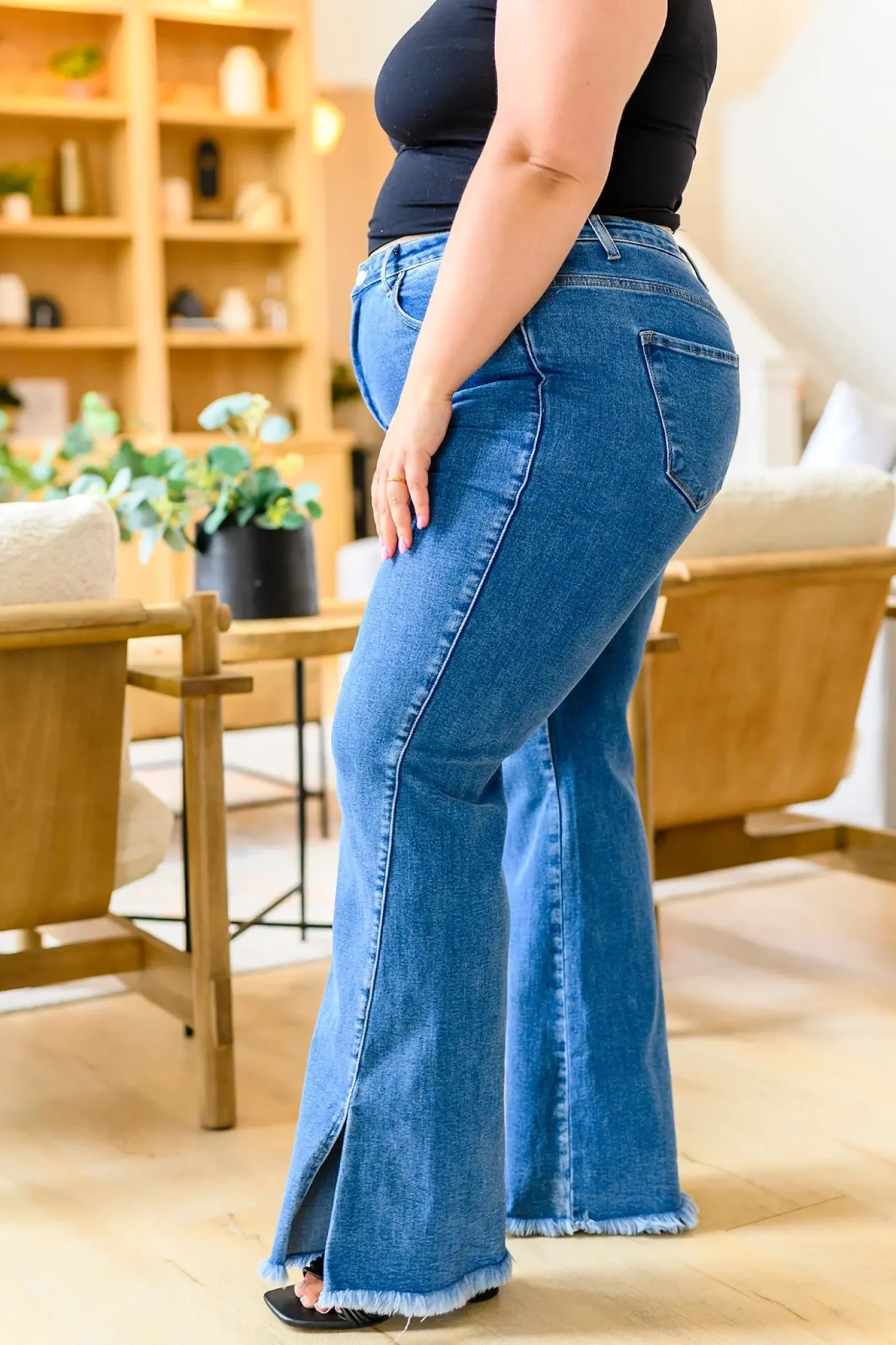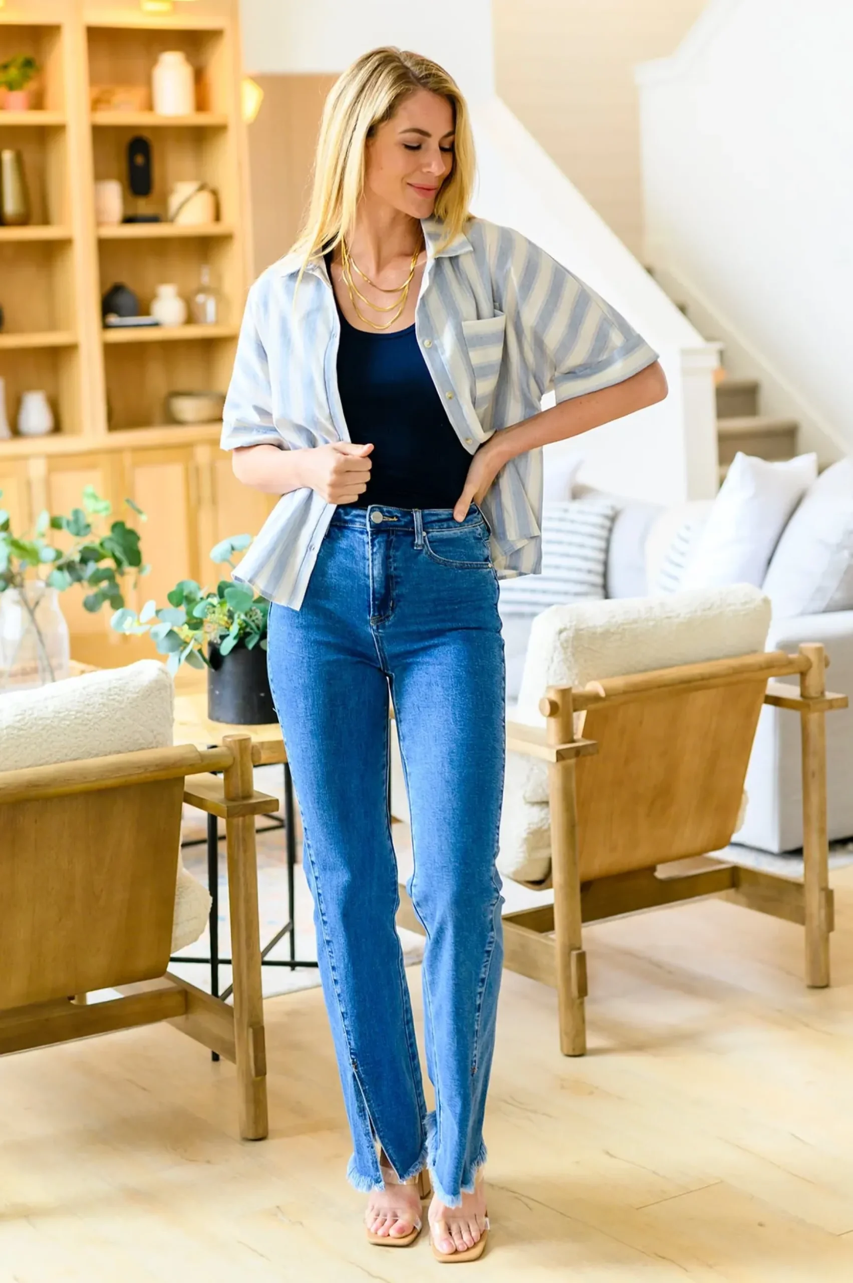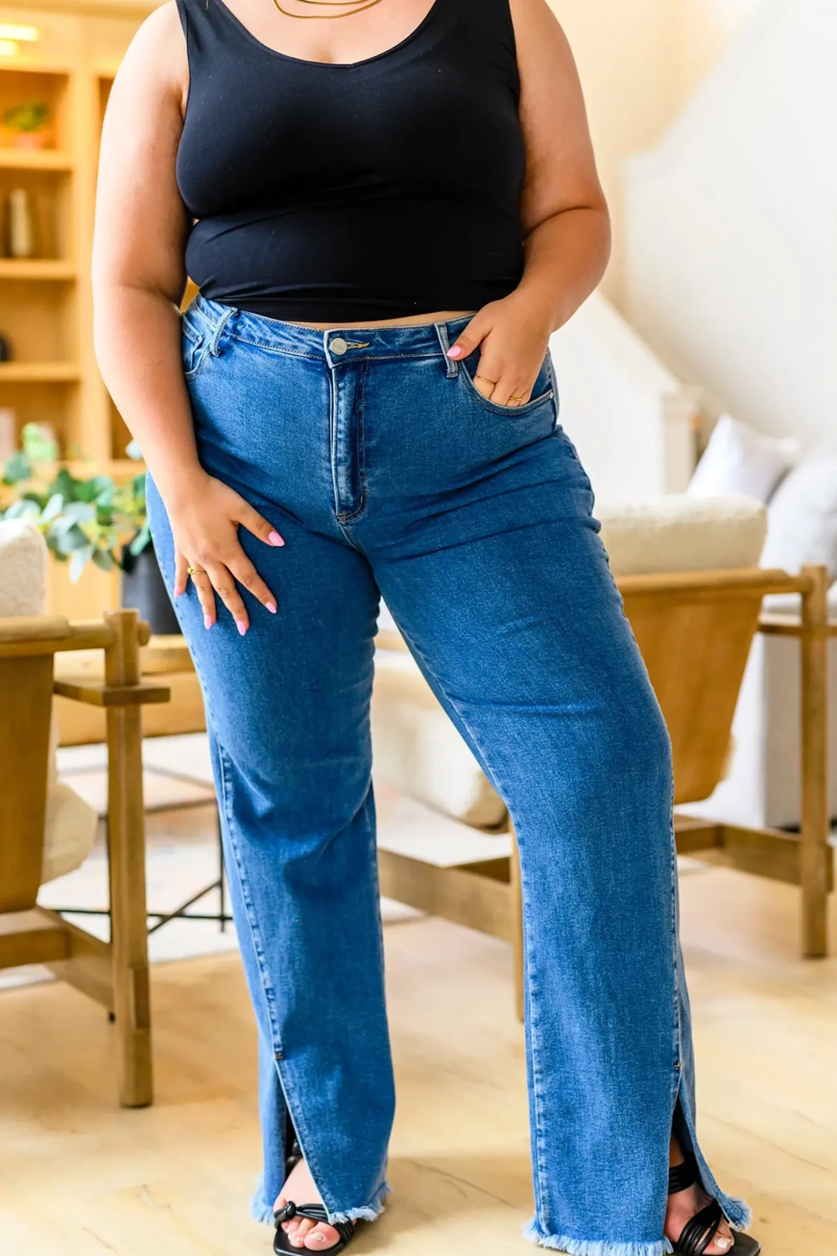 Introducing the Caitlin High Rise Split Hem Straight Jeans, our modern and stylish jeans with a vintage wash offering maximum comfort. Featuring a high rise, the relaxed straight cut design and front slits give a subtle bootcut flare ending in a raw hem. Look and feel amazing in these fashionable jeans!