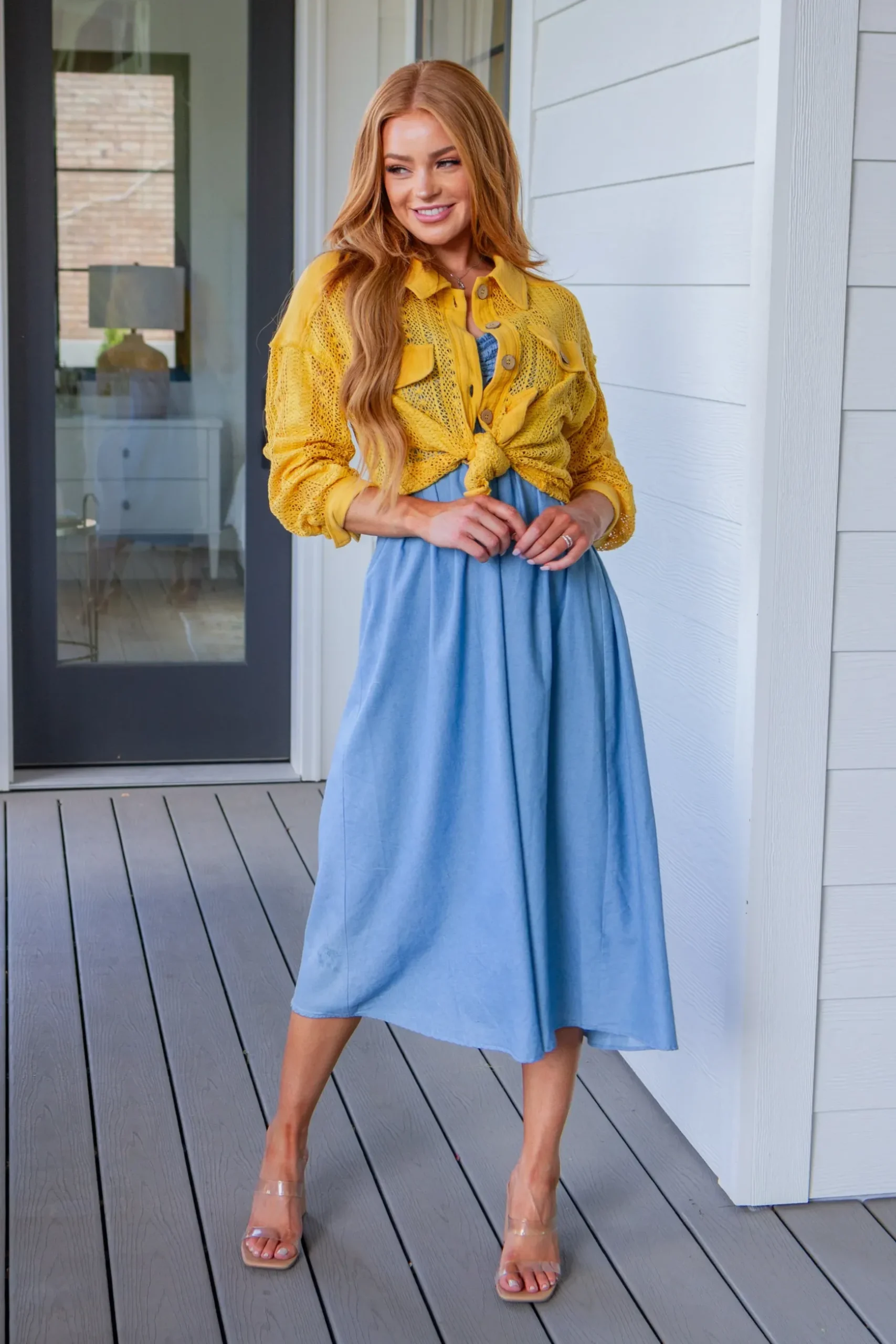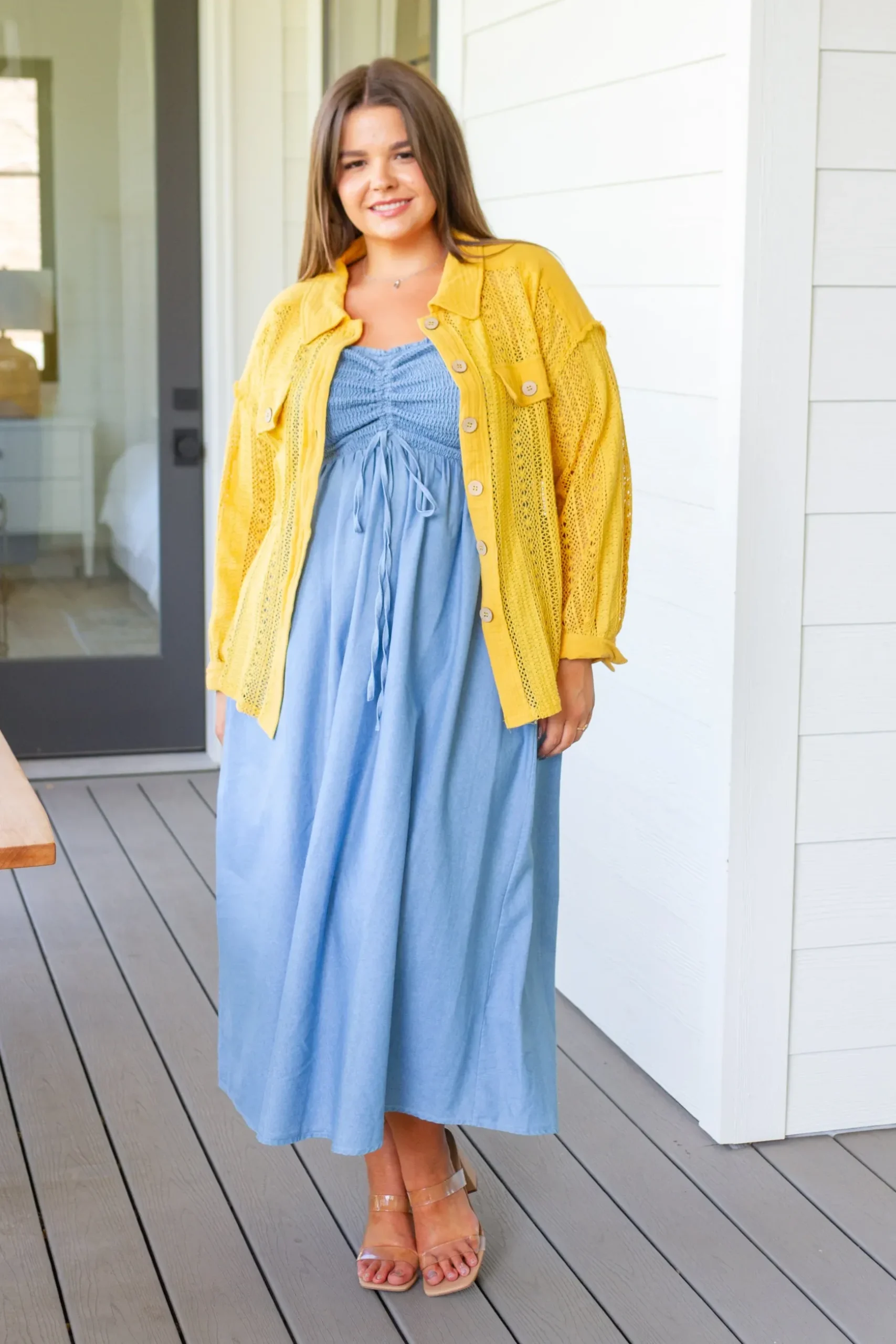 Feel the southern breeze in the Carolina in My Mind Maxi Dress! This lightweight denim dress features a smocked bustline with an adjustable cinch tie for comfort and a flattering A-line silhouette. With its midi length, you’ll look and feel relaxed and beautiful no matter the occasion. What are you waiting for? Get this dress and feel the sunshine!