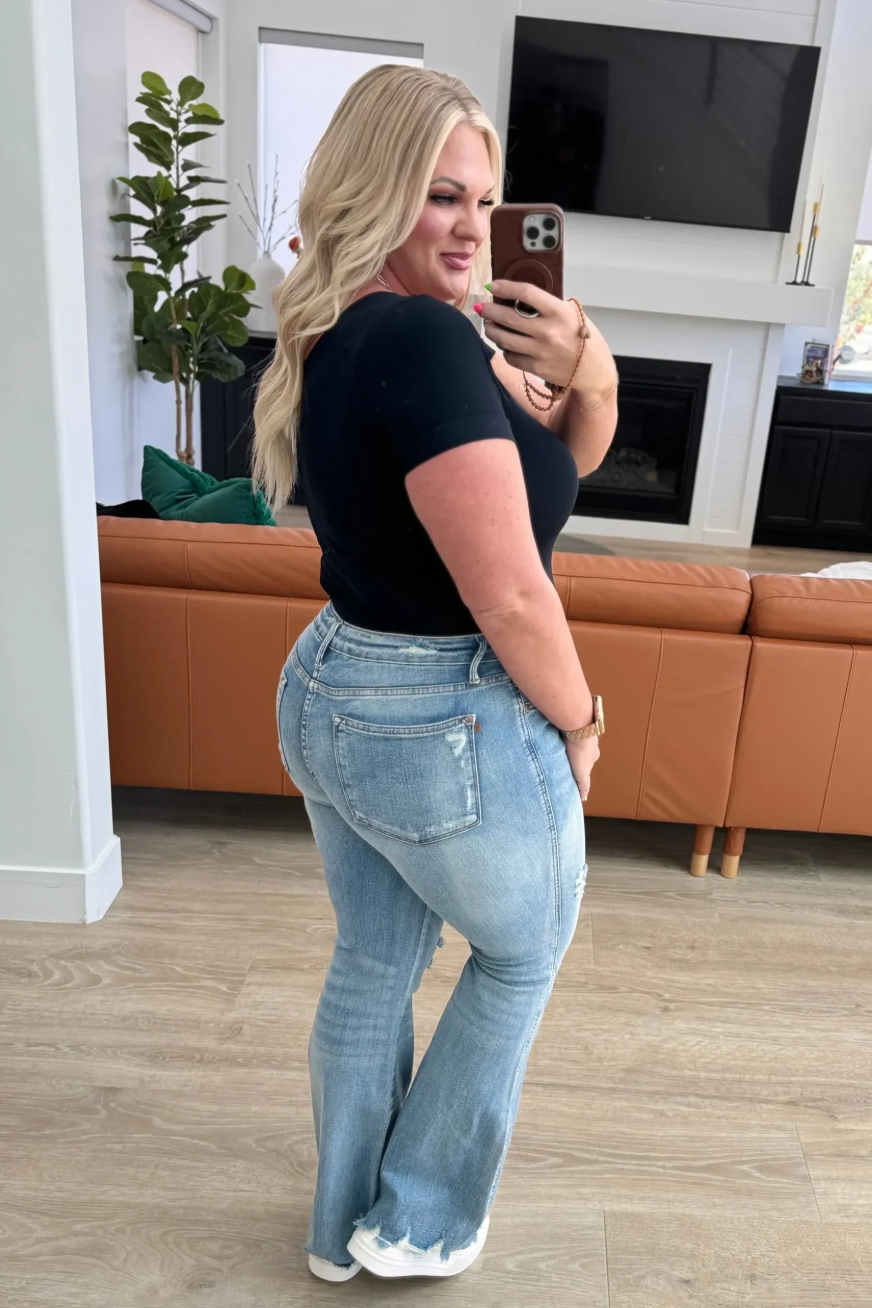 Introducing the Caroline Mid Rise Control Top Distressed Flare Jeans – the perfect combination of style and comfort! With its tummy control technology and 4-way stretch, these jeans will flatter your figure while providing all-day comfort. The light wash and distressed, chewed up hem add a touch of edginess to the classic flared silhouette. Elevate your denim game now!