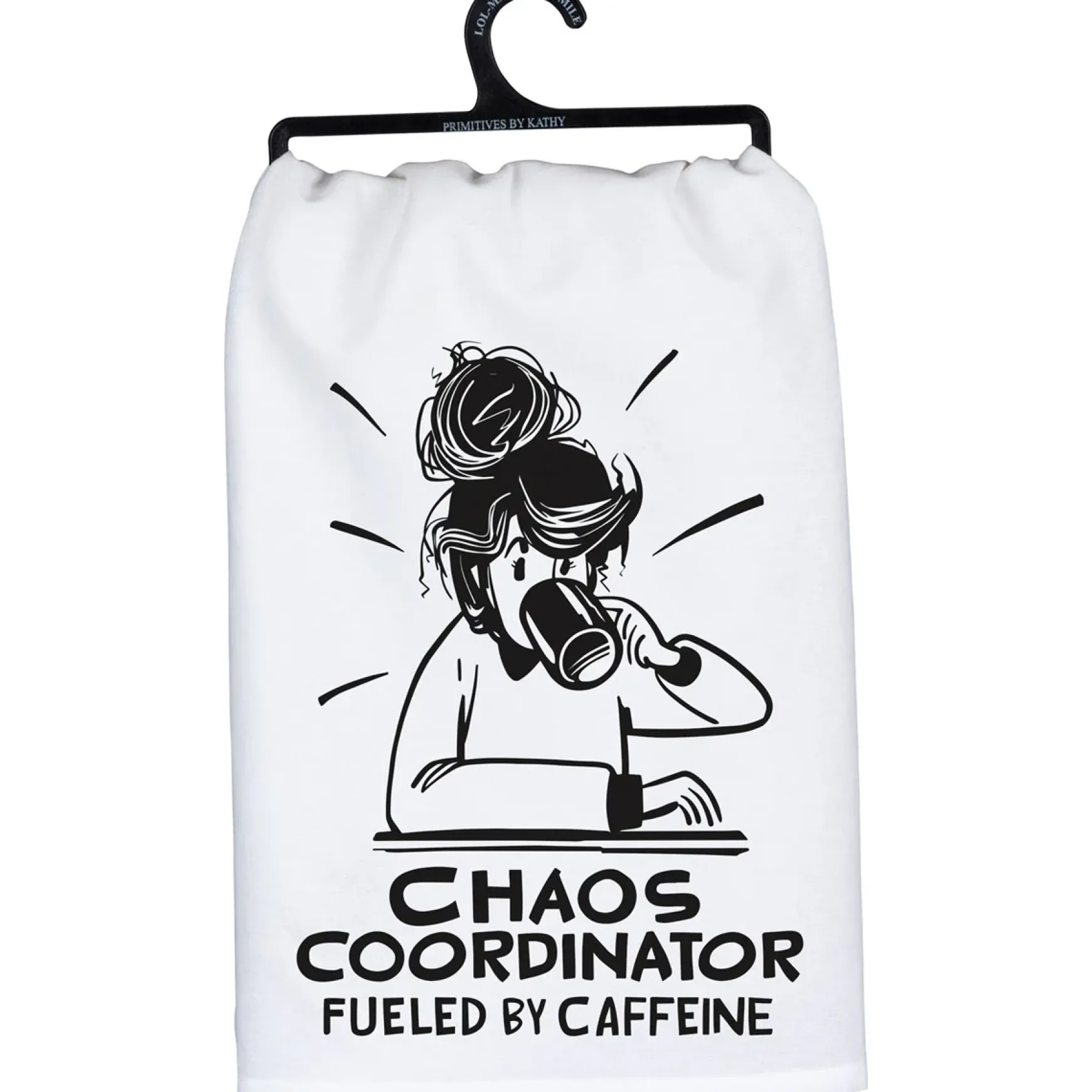 A black and white cotton kitchen towel displaying a hand illustrated design of a person drinking coffee with humorous “Chaos Coordinator Fueled By Caffeine” sentiment. Our Chaos Coordinator kitchen towel is machine-washable for convenient cleaning. A fun and functional everyday kitchen accent.