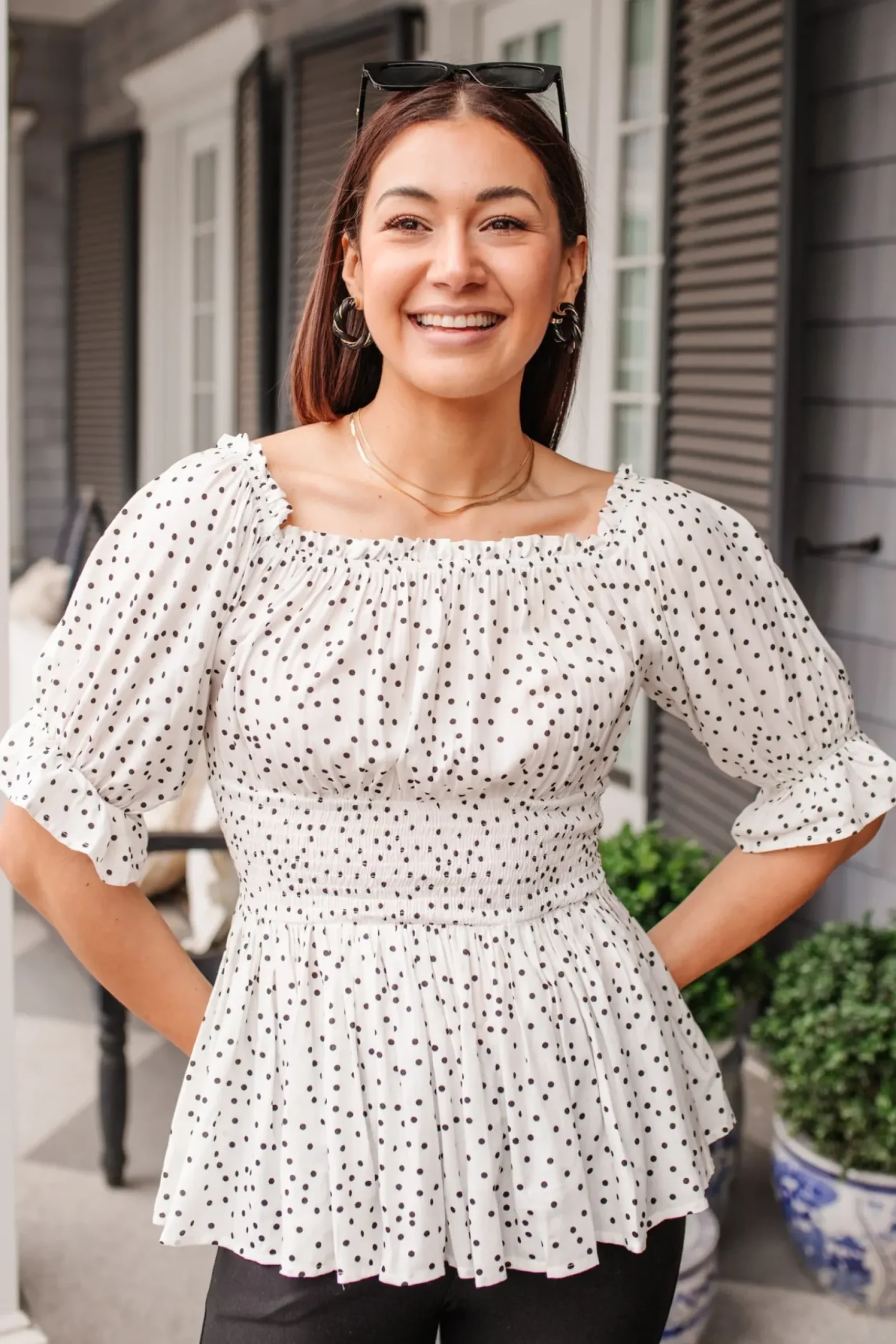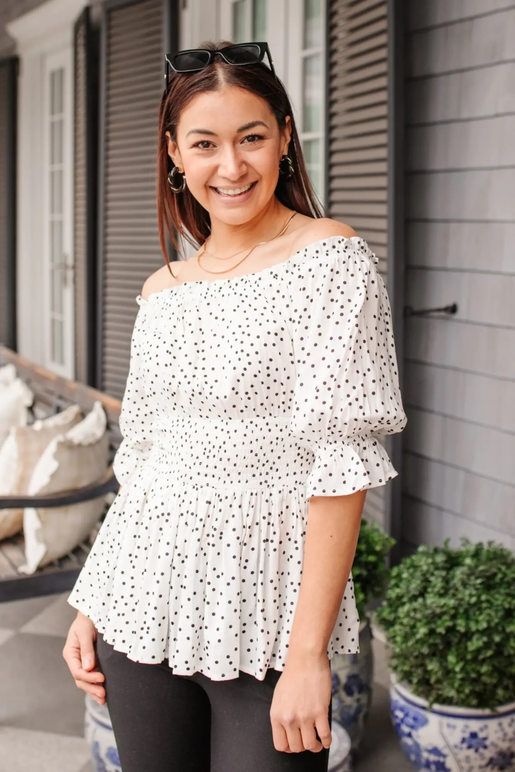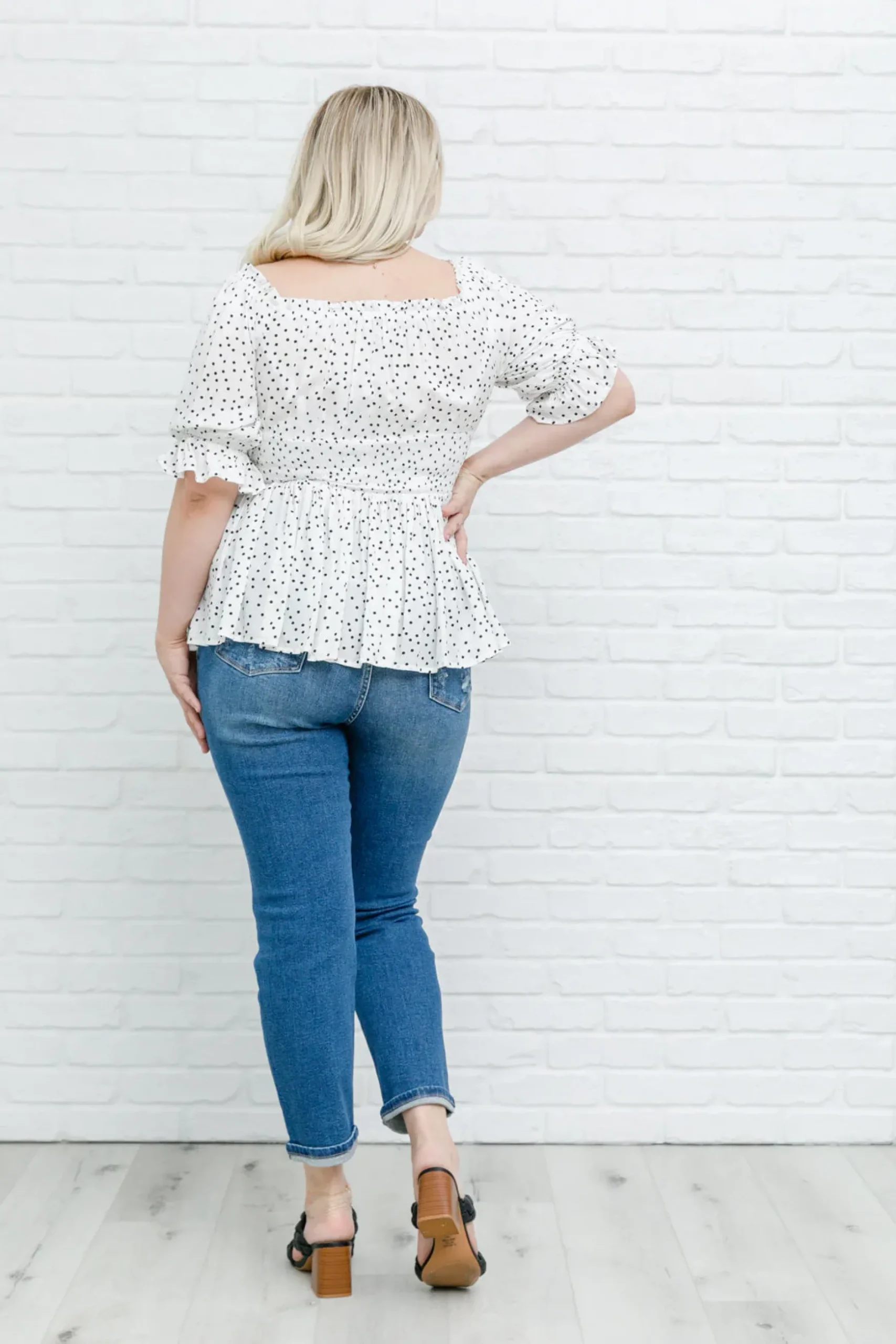 It’s all in the details with the Chose Me Dotted Top! Consisting of an elastic off-shoulder silhouette, detailed in a ruffle hem, that flows into three-quarter sleeves, with elastic ruffle cuffs, shirred waistline, and peplum style bodice. Keep it chic with black skinnies and heels or pair this with light wash distressed denim and sneakers for a casual cool-girl look!