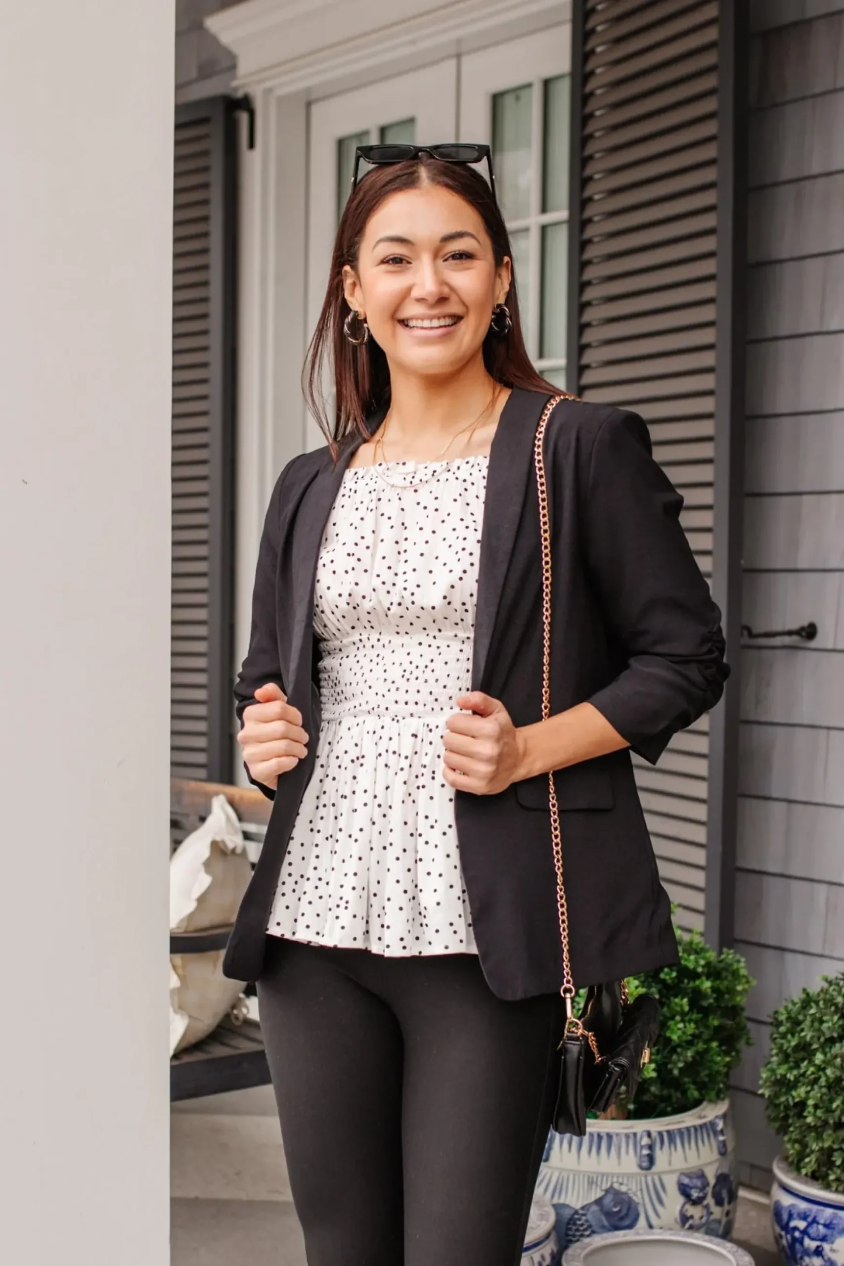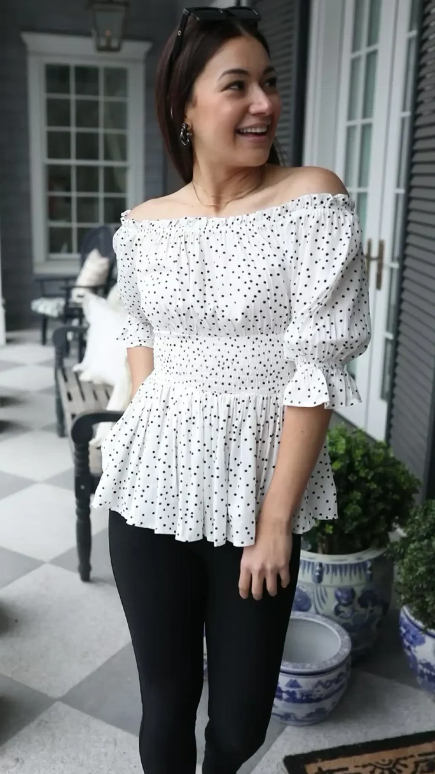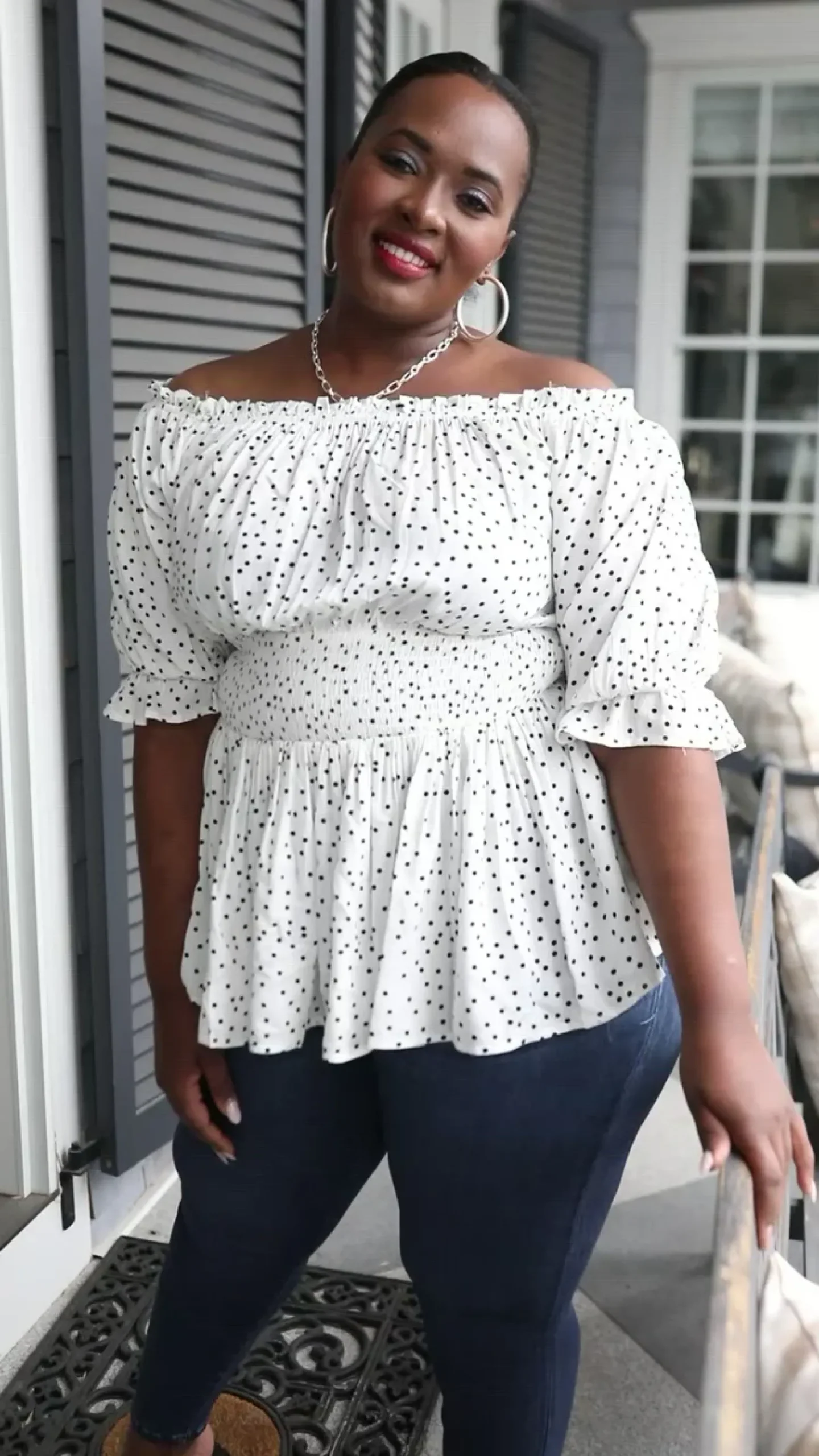 It’s all in the details with the Chose Me Dotted Top! Consisting of an elastic off-shoulder silhouette, detailed in a ruffle hem, that flows into three-quarter sleeves, with elastic ruffle cuffs, shirred waistline, and peplum style bodice. Keep it chic with black skinnies and heels or pair this with light wash distressed denim and sneakers for a casual cool-girl look!