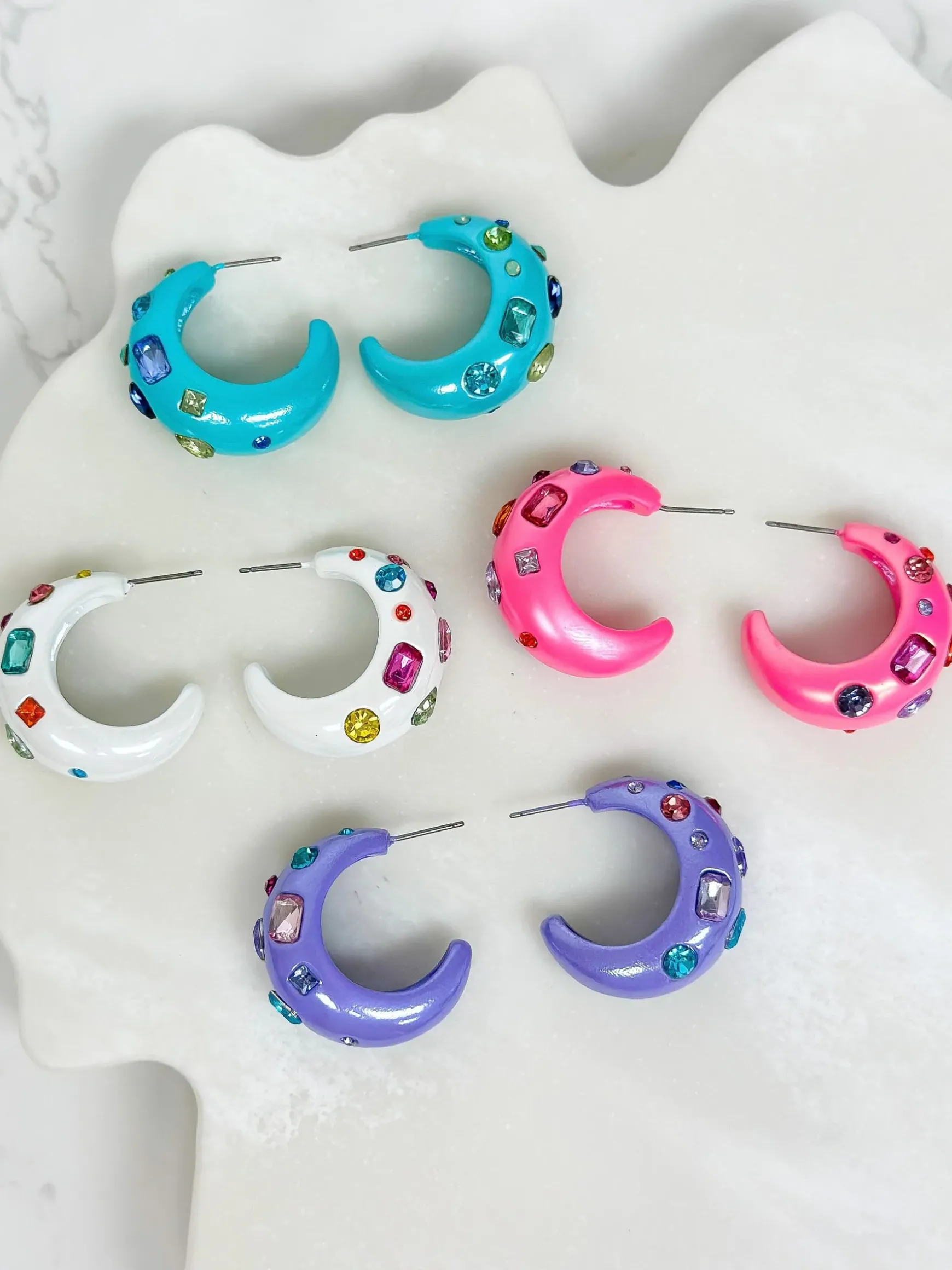 Add a pop of color to your summer wardrobe with these Chunky Rhinestone Bauble Hoop Earrings. The vibrant hue is perfect for bringing a fun and playful touch to any outfit. The chunky hoops add a bold statement, while the rhinestones provide a touch of sparkle. Perfect for adding some summer vibes to your look.