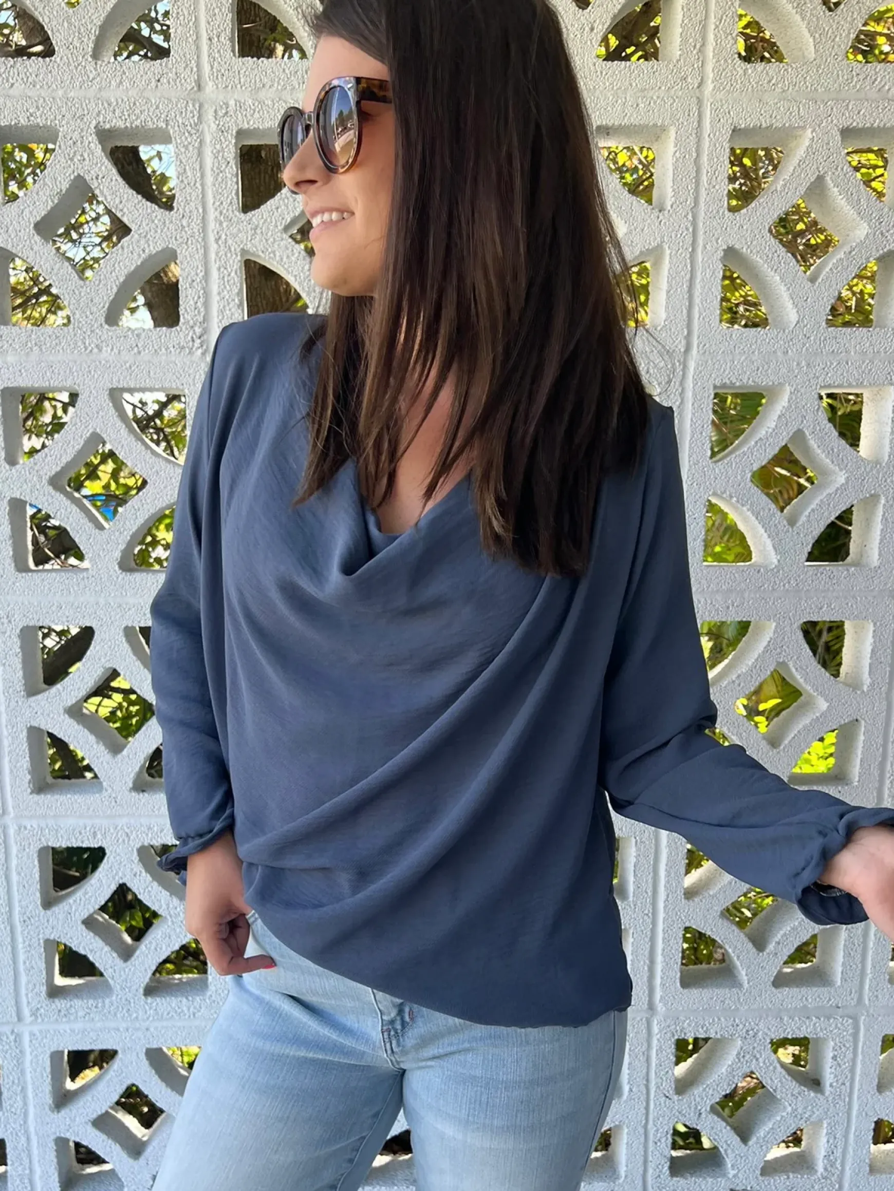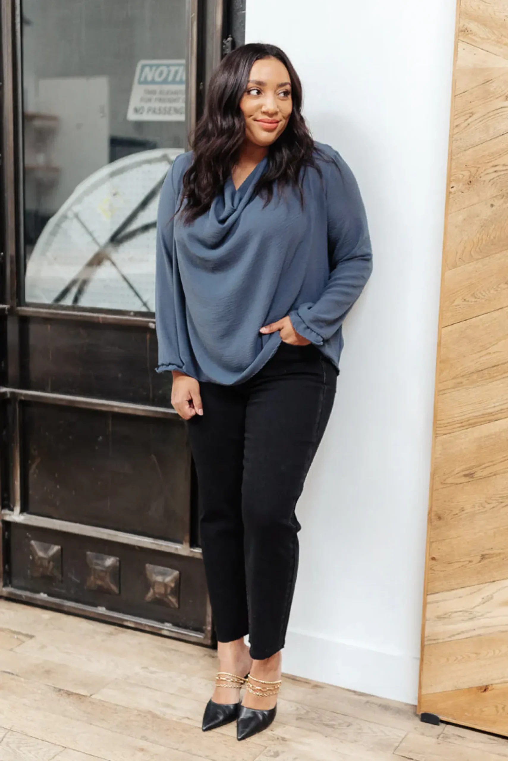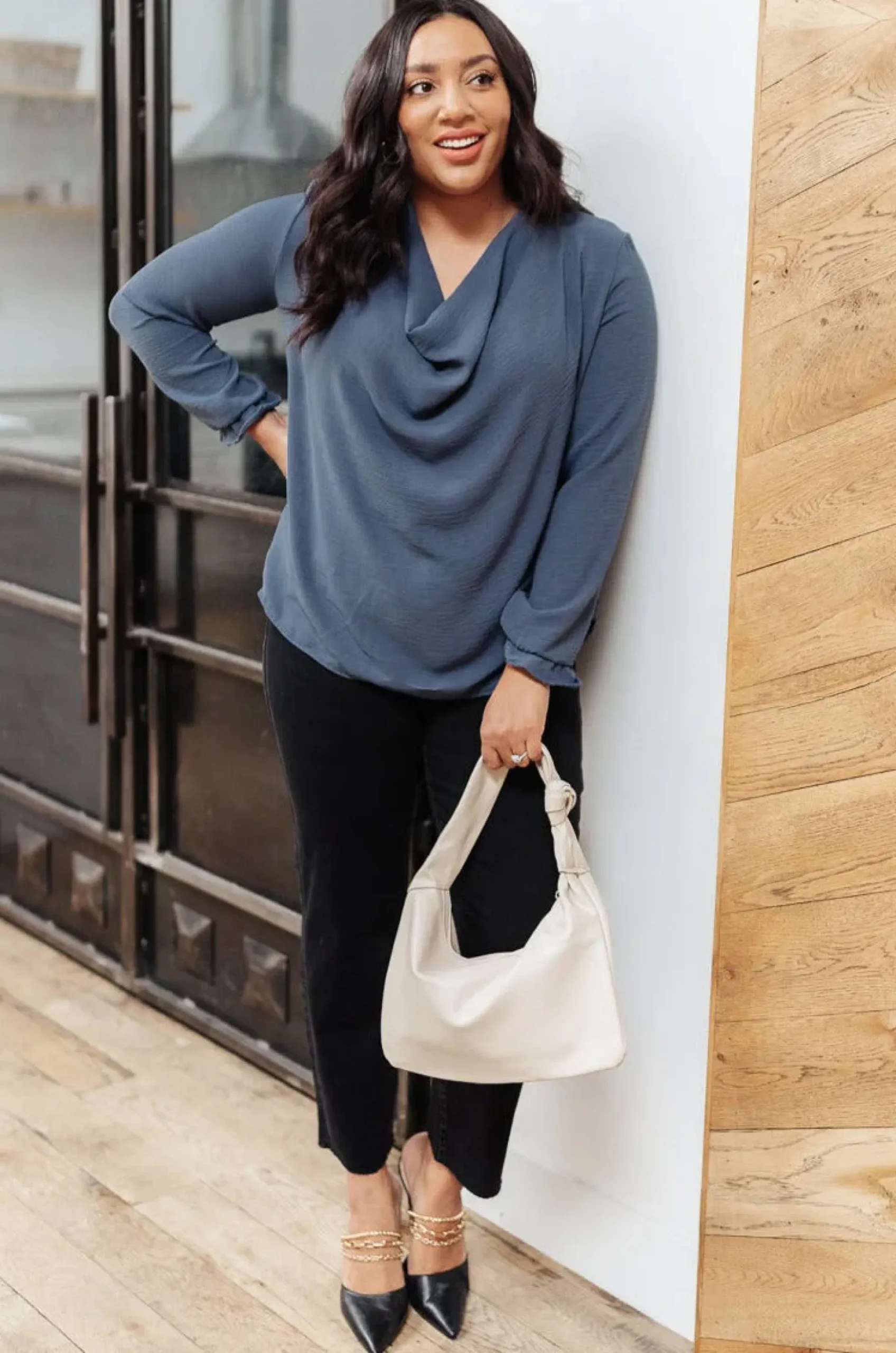 Let the City Girl Blouse complete your outfit! This chic top features a cowl neck and ruffle elastic sleeve cuffs, that shape a flowy silhouette. We are obsessed with the way this top looks with leather, whether it be pants or a skirt, we just can’t get enough!