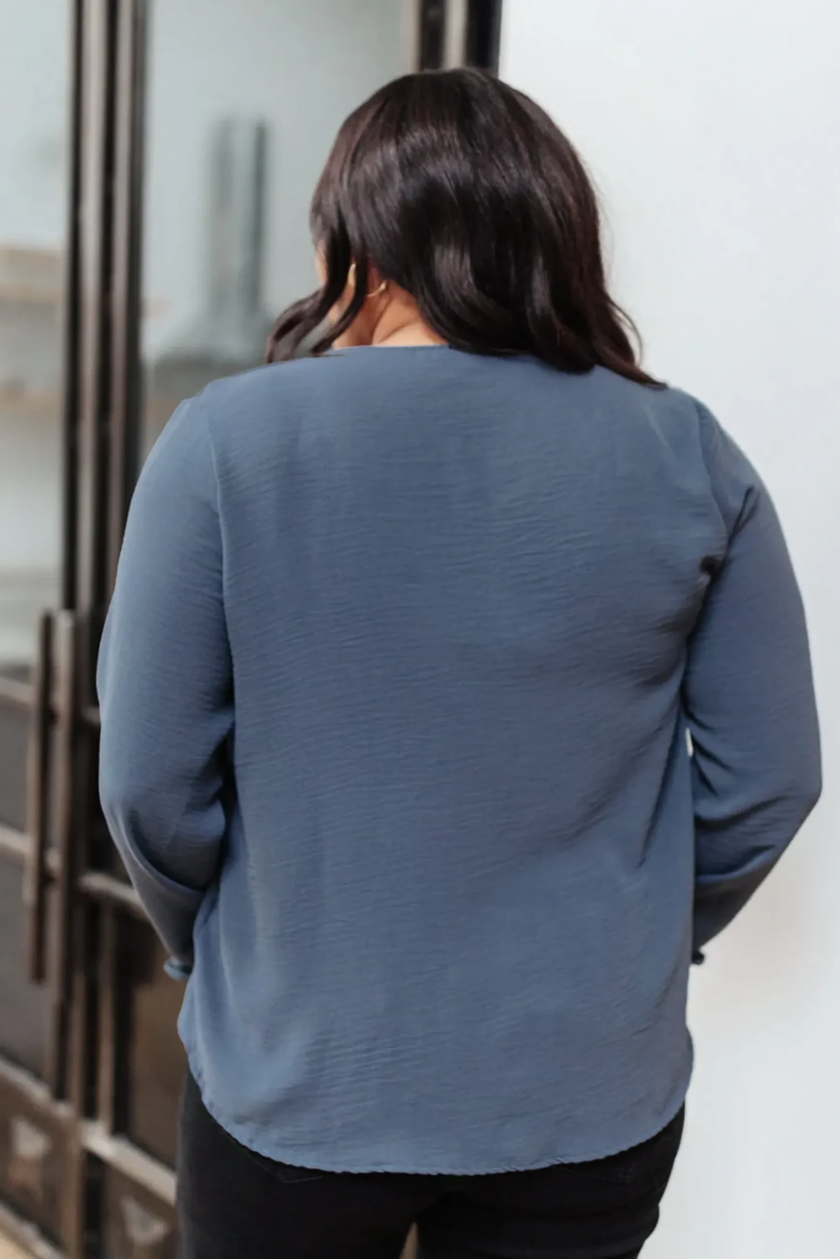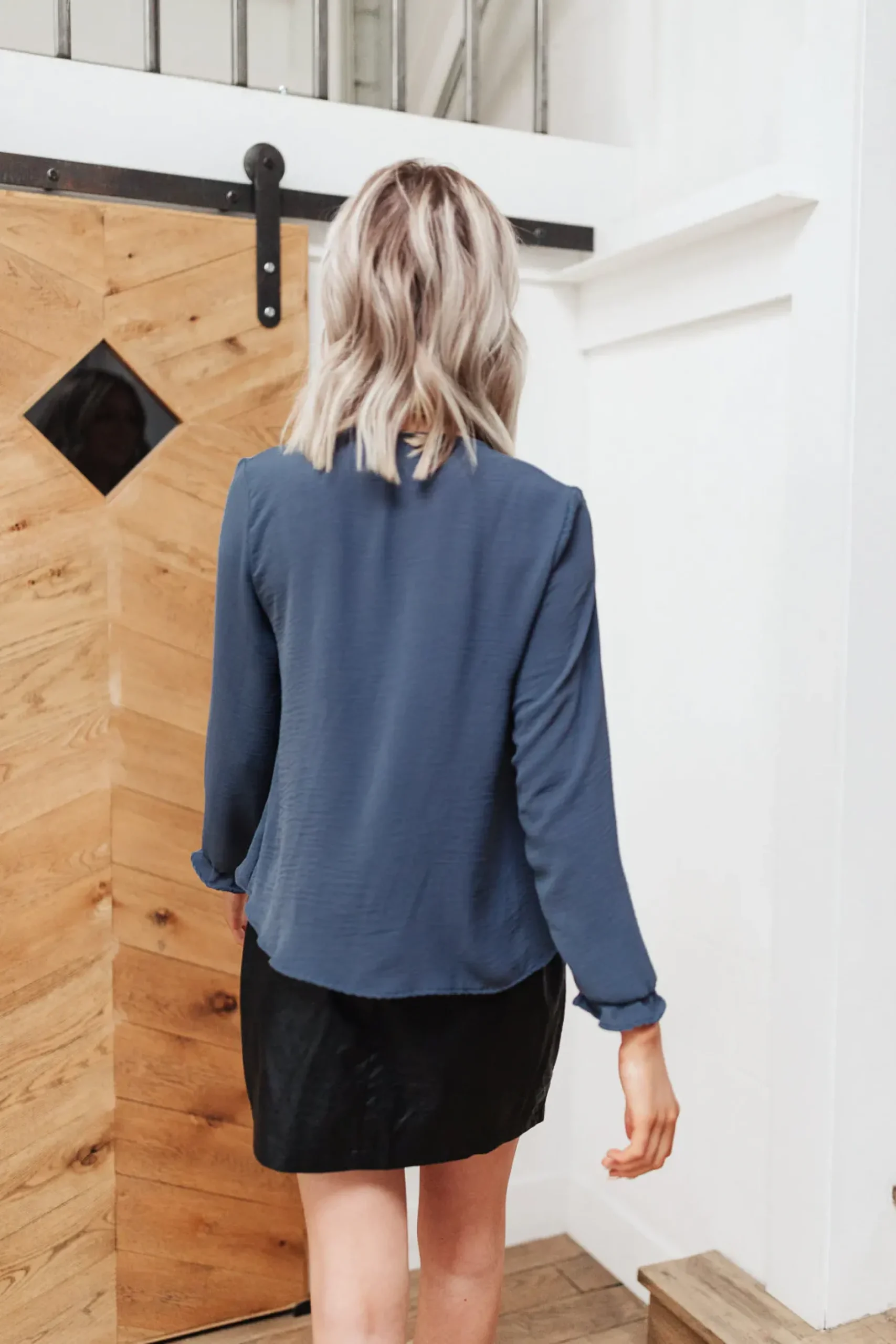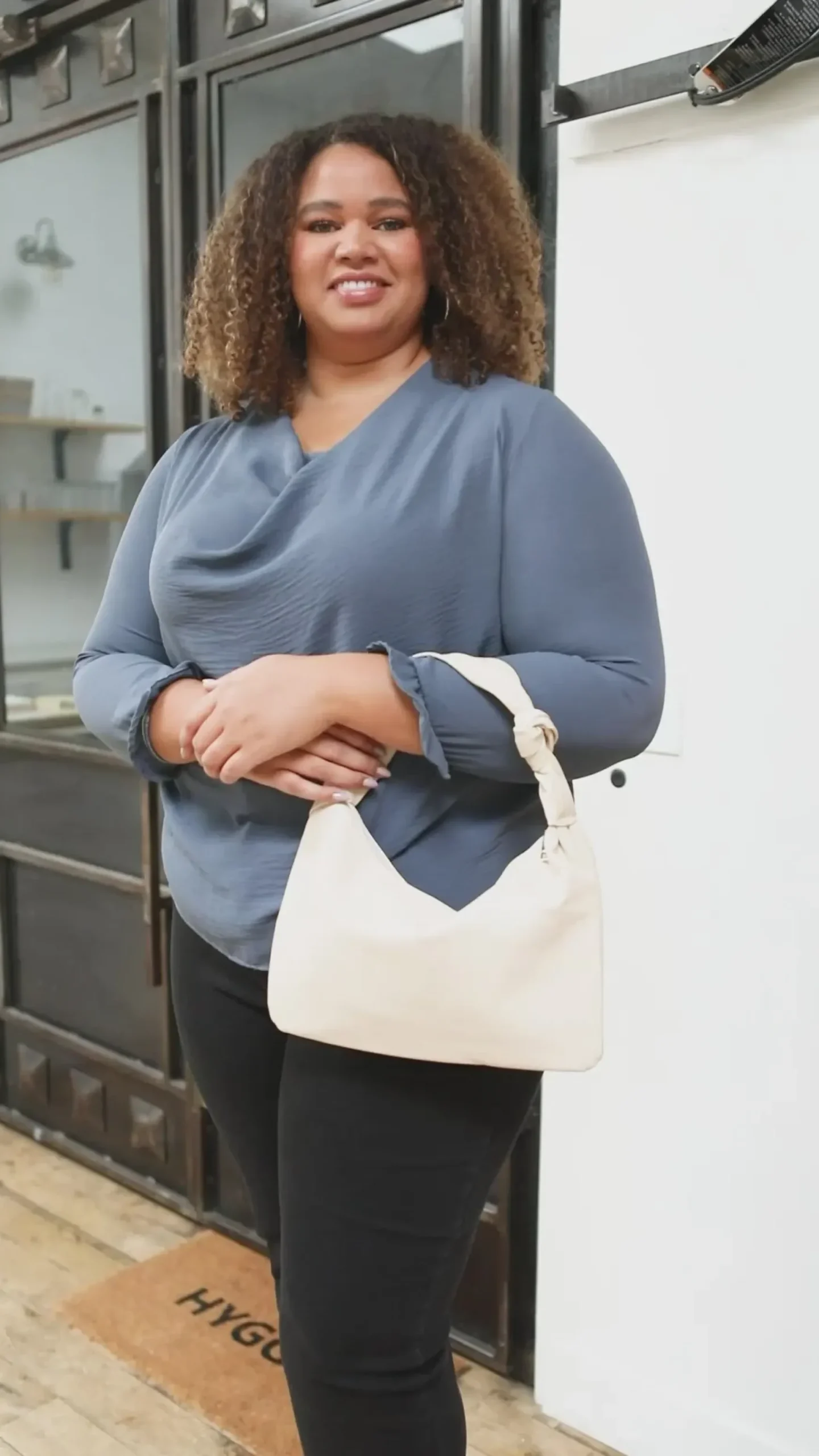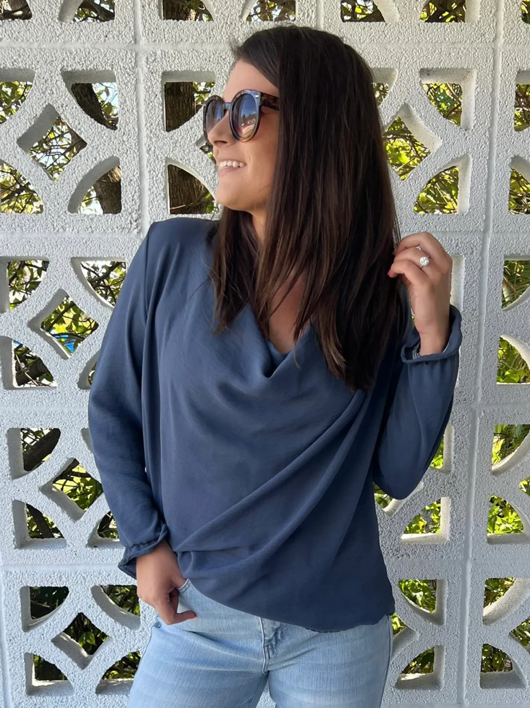 Let the City Girl Blouse complete your outfit! This chic top features a cowl neck and ruffle elastic sleeve cuffs, that shape a flowy silhouette. We are obsessed with the way this top looks with leather, whether it be pants or a skirt, we just can’t get enough!