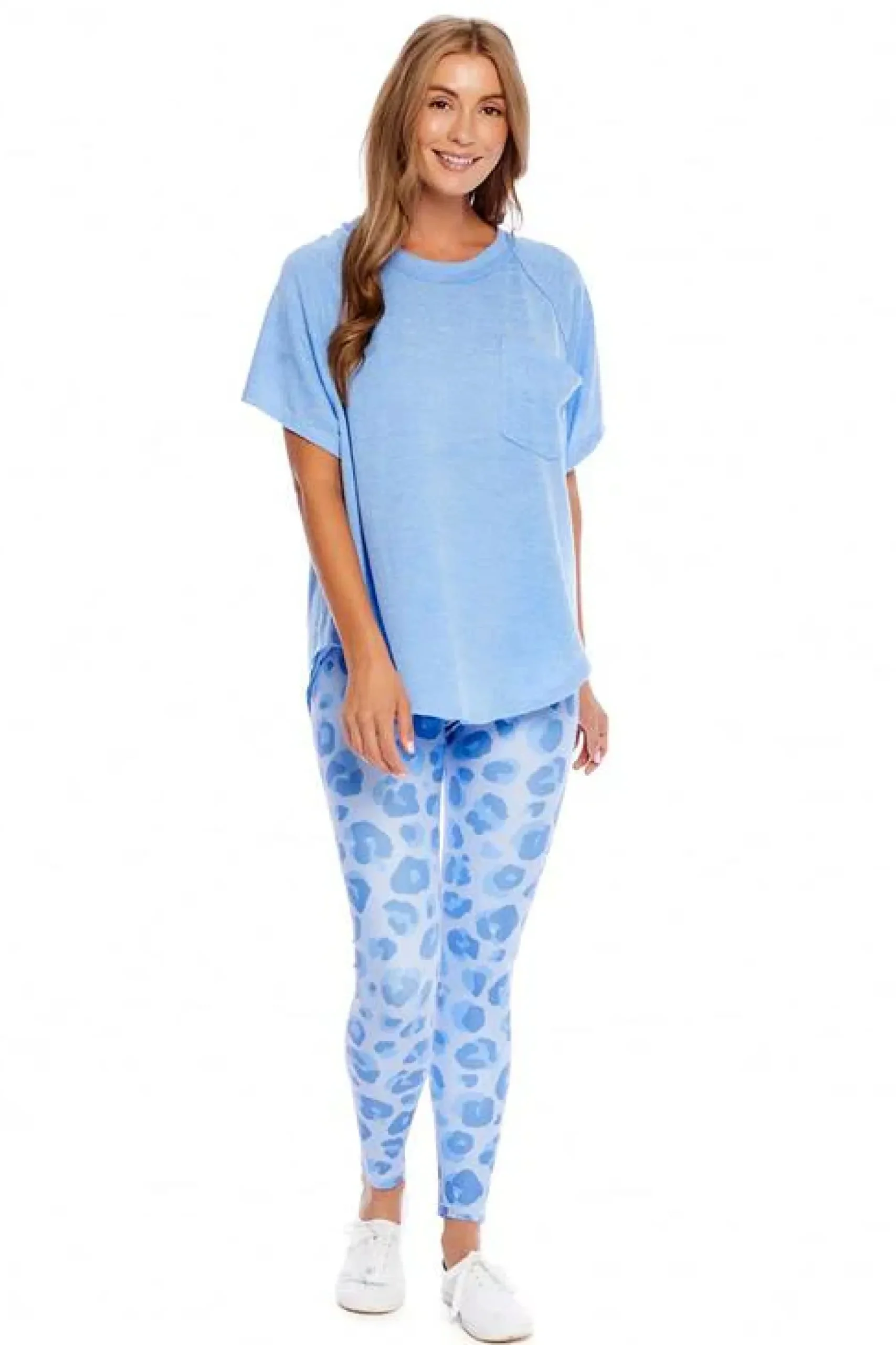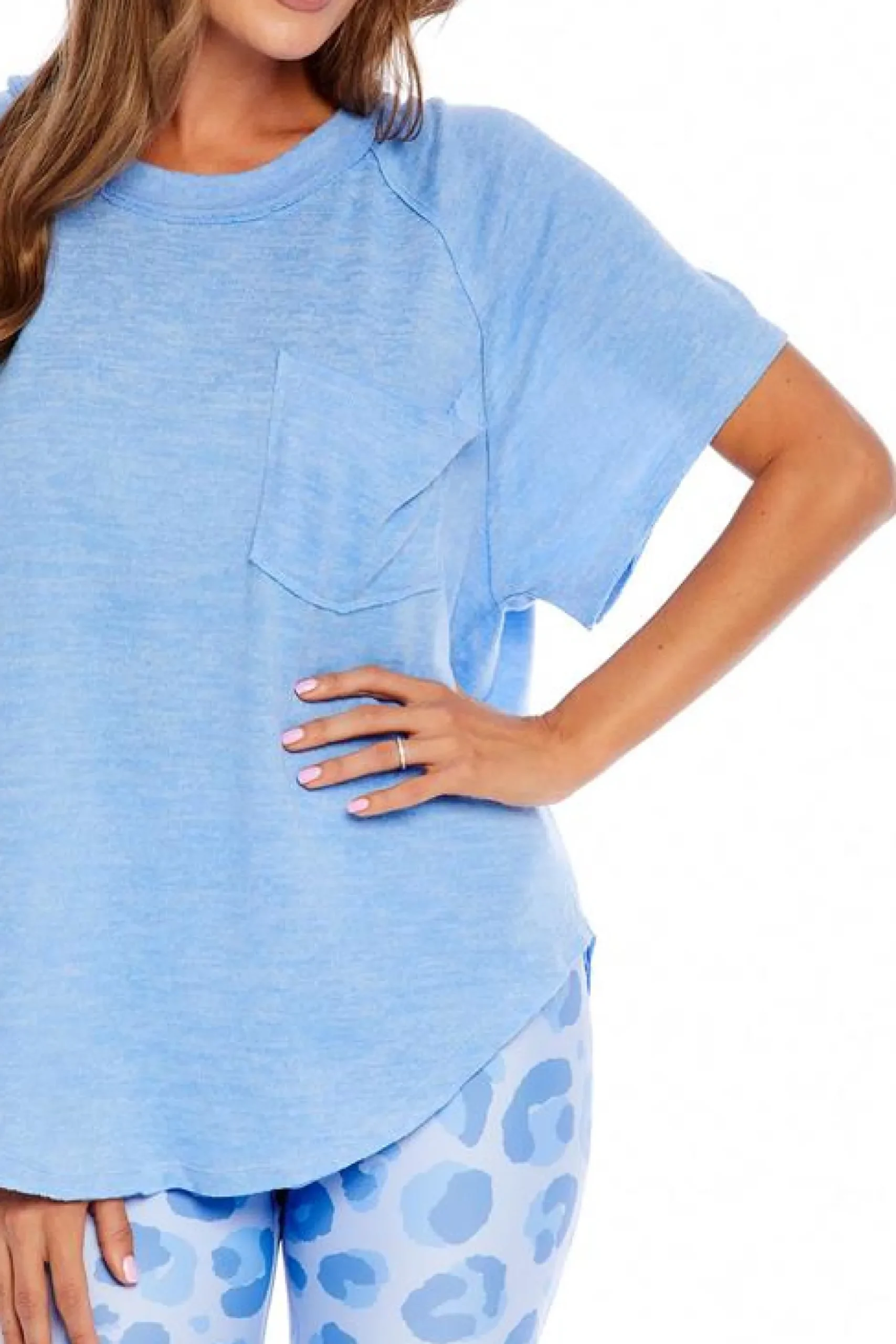 Knit short sleeve tee features slouchy fit, curved hem and front pocket.