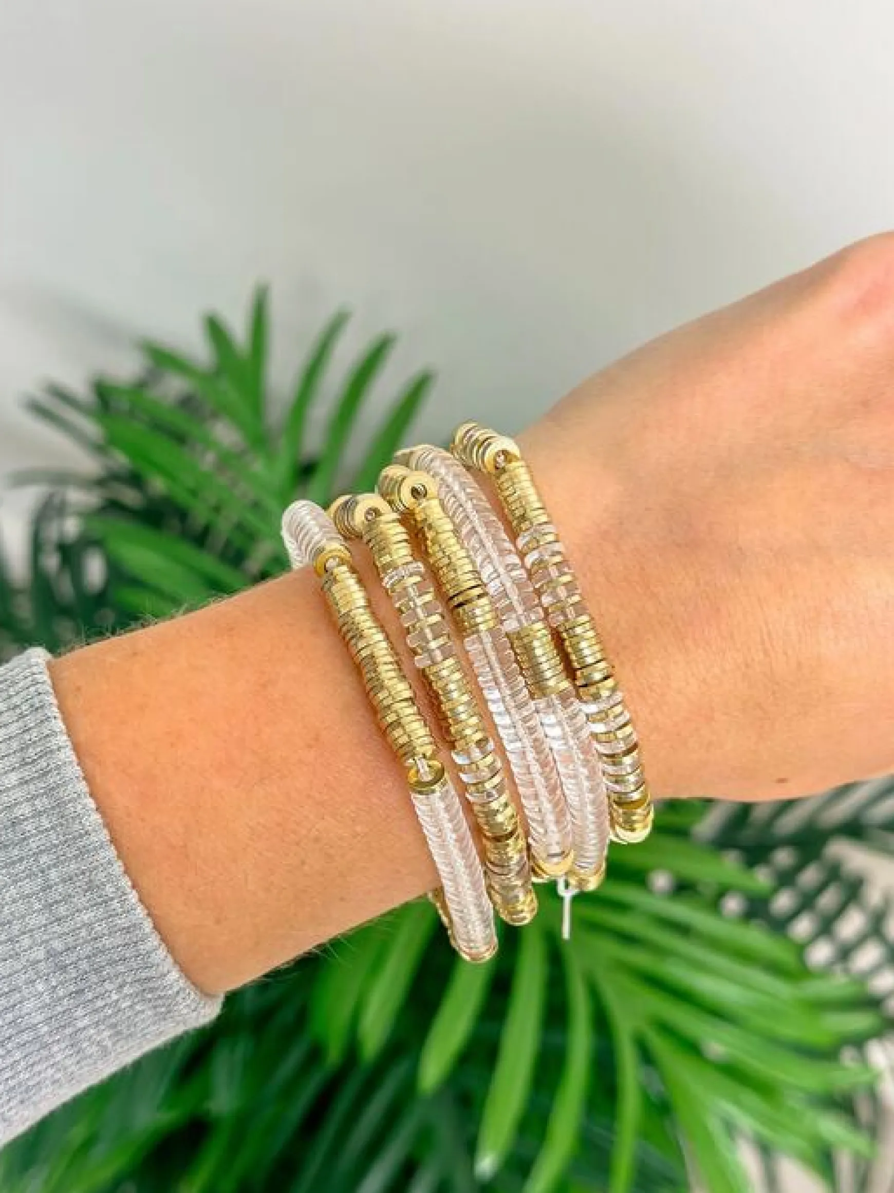 Crafted with high-quality clear resin, this set of 5 stretch bracelets is perfect for adding a touch of elegance to any outfit. The stretch design ensures a comfortable fit for all wrist sizes. Versatile and stylish, these bracelets are a must-have for any jewelry collection.