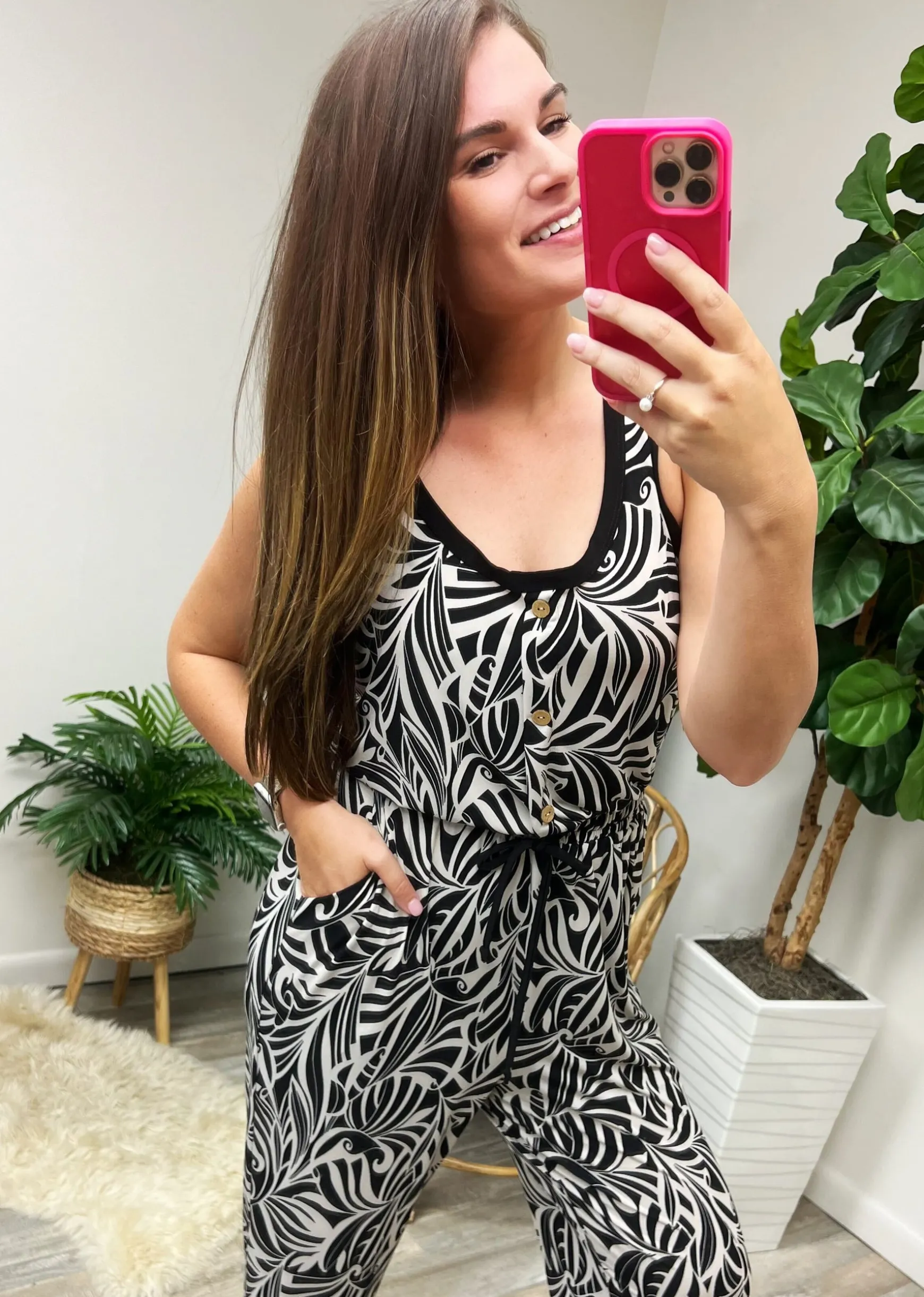 Indulge your inner fashionista with our Cool Girl Filigree Jumpsuit. Featuring a luxurious Bulgari fabric, scoop neck, and decorative buttons, this jumpsuit is both stylish and comfortable. The cased elastic waistband and functional drawstring provide the perfect fit, while the side pockets and lined pants add practicality to this chic piece. Very cool!