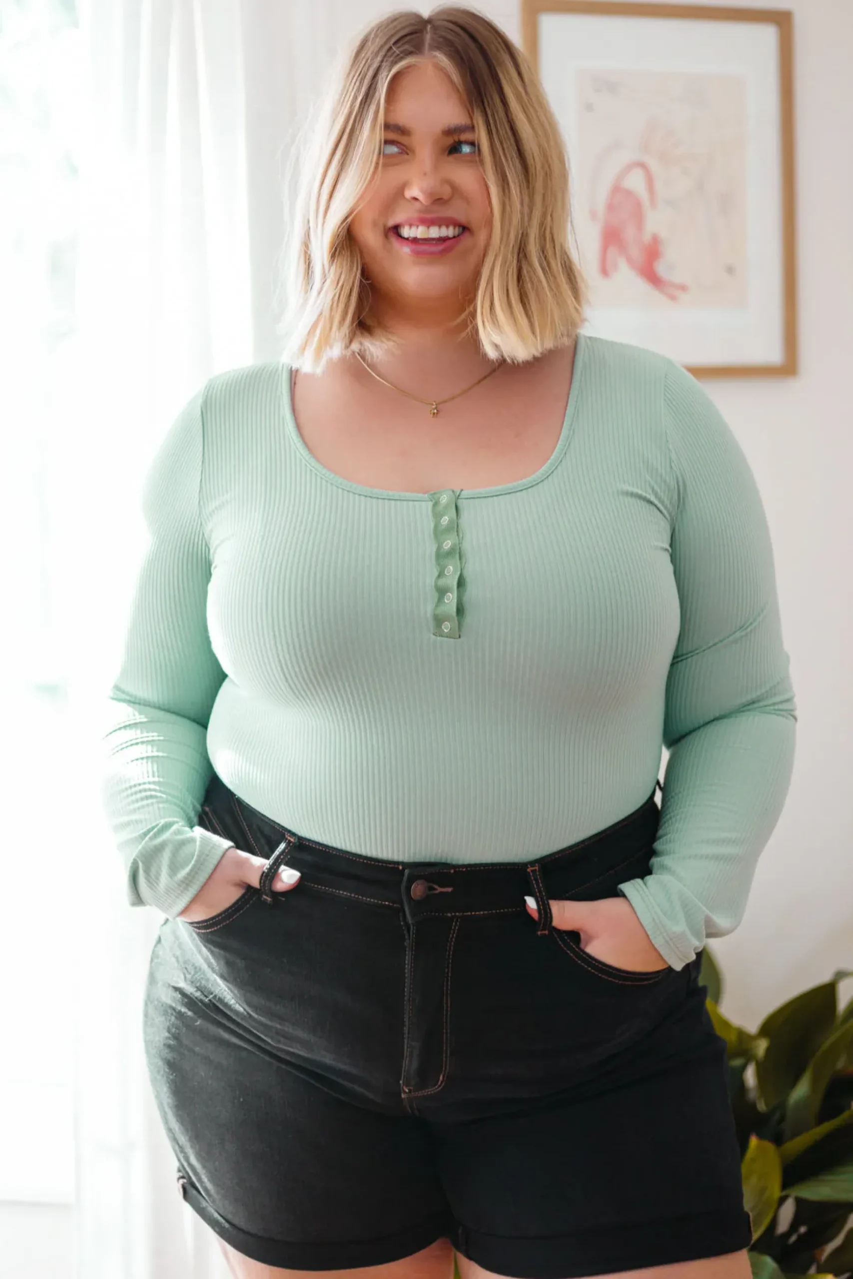 One thing you can count on is the Count on Me Ribbed Bodysuit in Sage to create a super cute fit! A stretchy ribbed knit shapes a scoop neckline with a functional snap button Henley detail and long sleeves. A slim fit bodice leads into a full coverage bottom with snap closure.