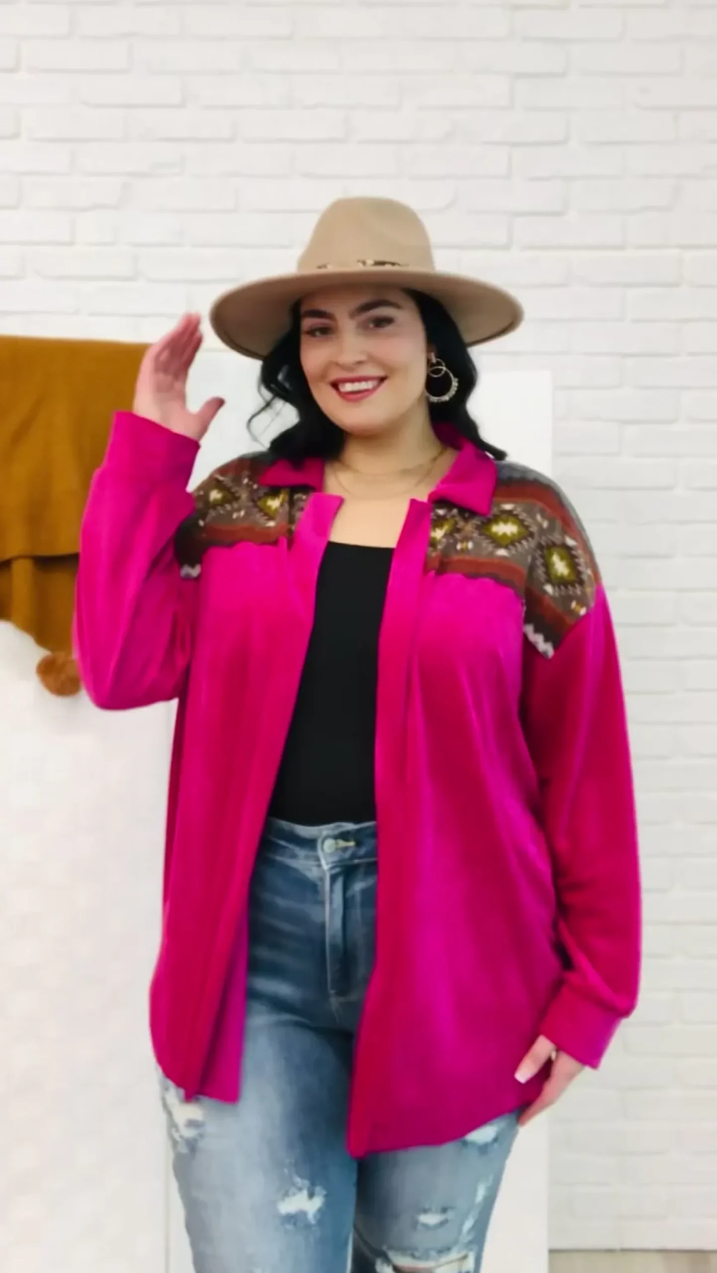The Cozy Cabin Days Sweater in Magenta is easy to throw on and instantly feel put together in! Featuring a buttery soft velour fabric that shapes a collared neckline with notched lapel detailing, dropping into an open front ending at a rounded hemline. Long sleeves start at a drop shoulder detail with a western print design ending at a cuffed hem.