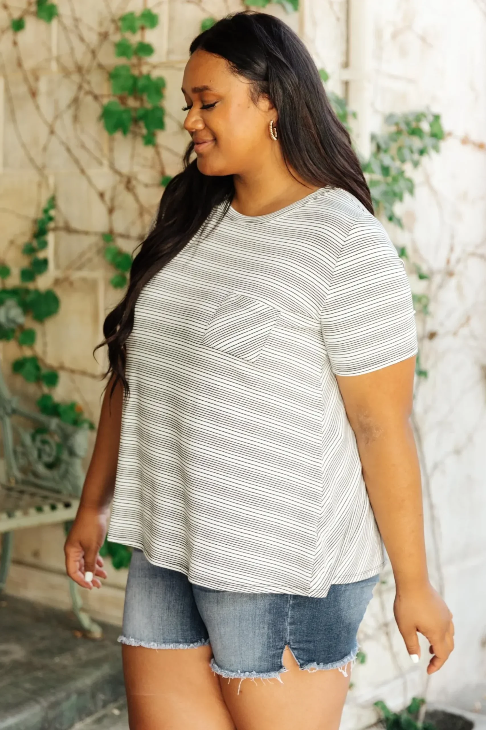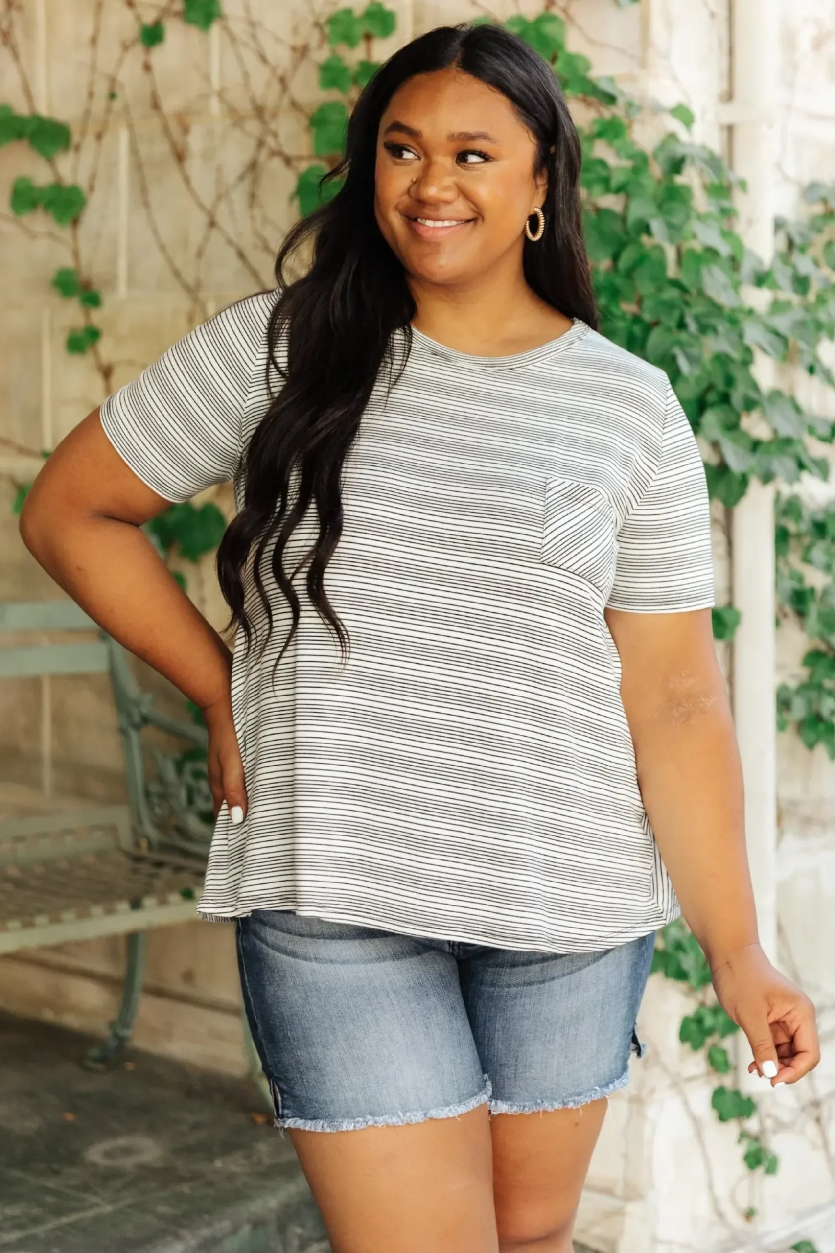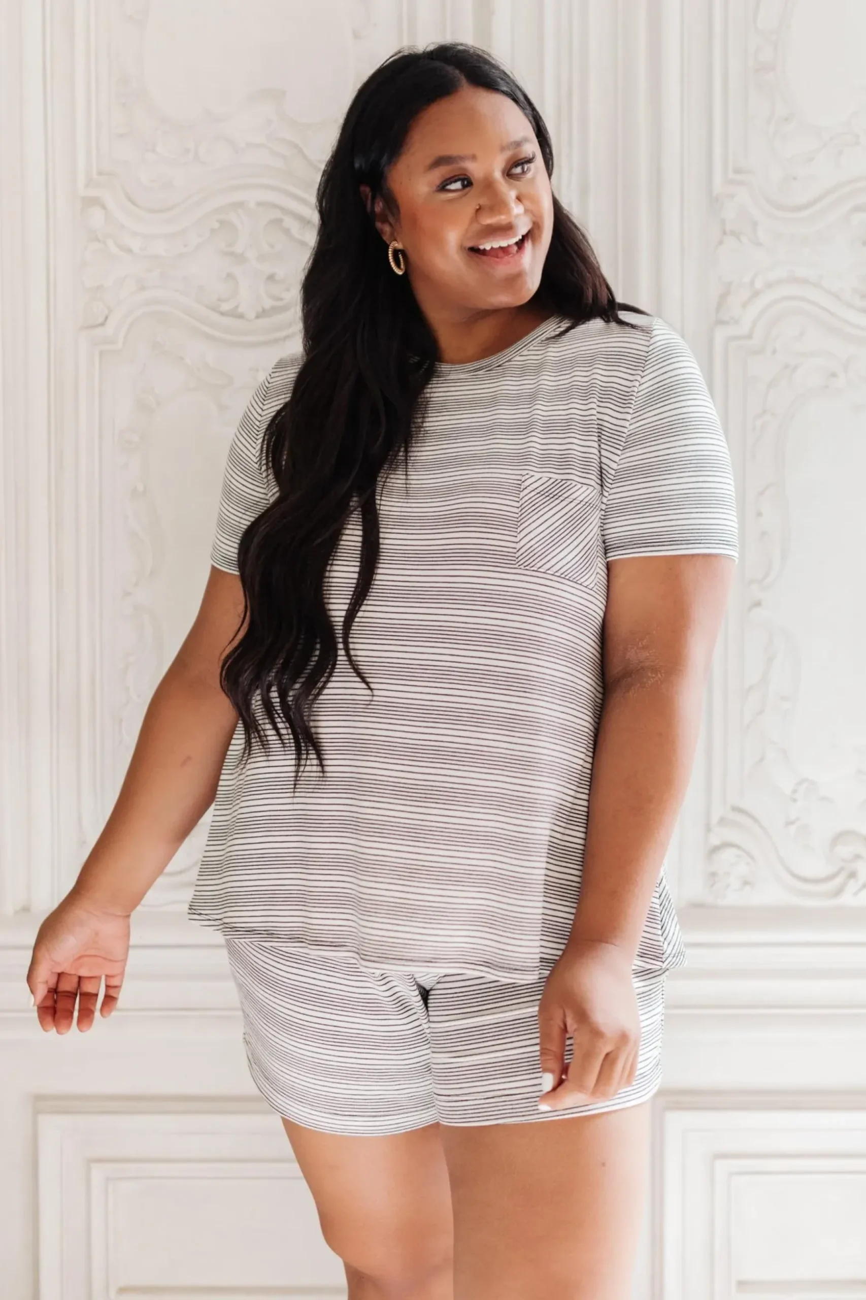 The Cozy In Stripes Top in Gray is a cute and comfy pocket tee. This t-shirt made of super soft gray fabric with tiny black stripes. Pair it with jeans, or the matching Cozy In Stripes Shorts!