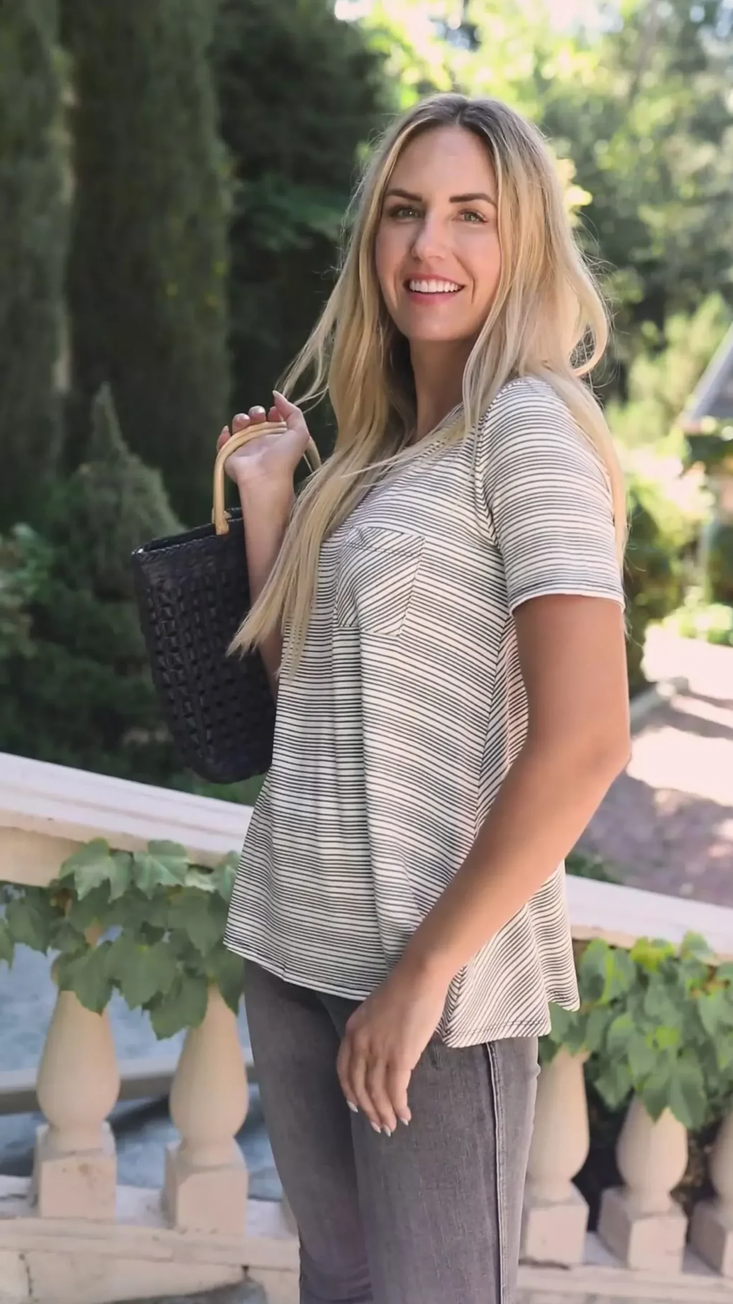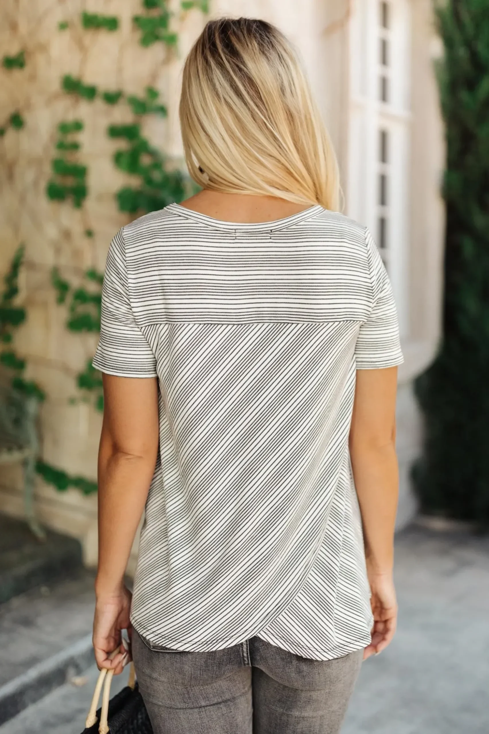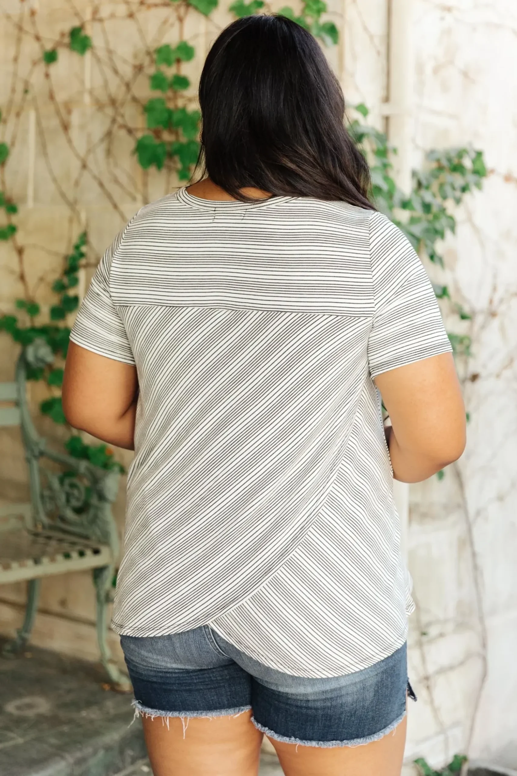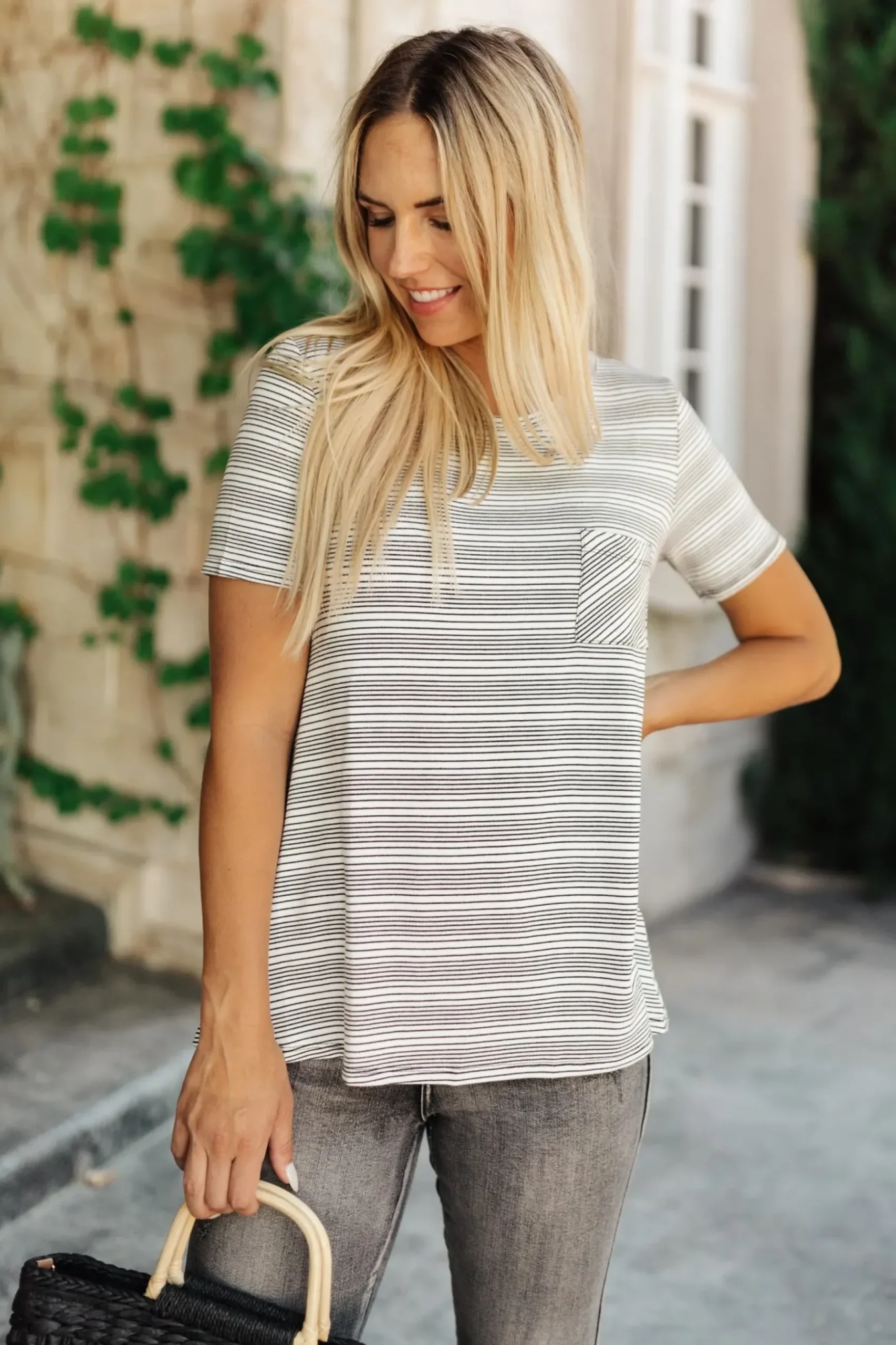 The Cozy In Stripes Top in Gray is a cute and comfy pocket tee. This t-shirt made of super soft gray fabric with tiny black stripes. Pair it with jeans, or the matching Cozy In Stripes Shorts!