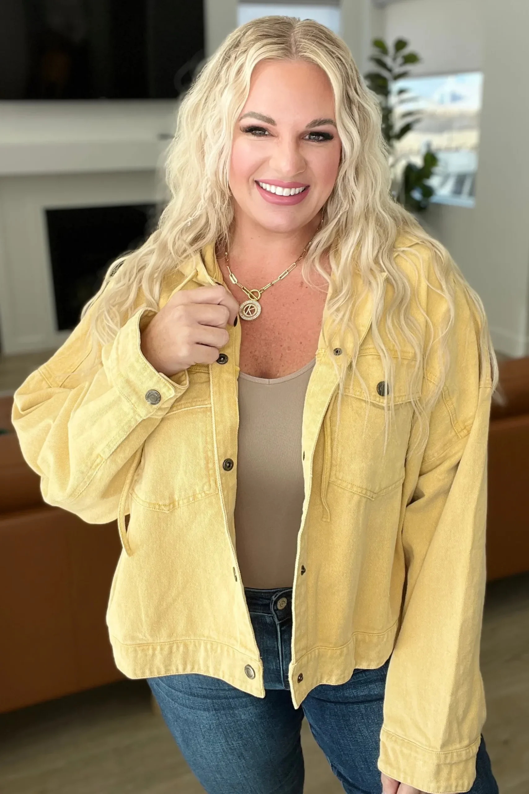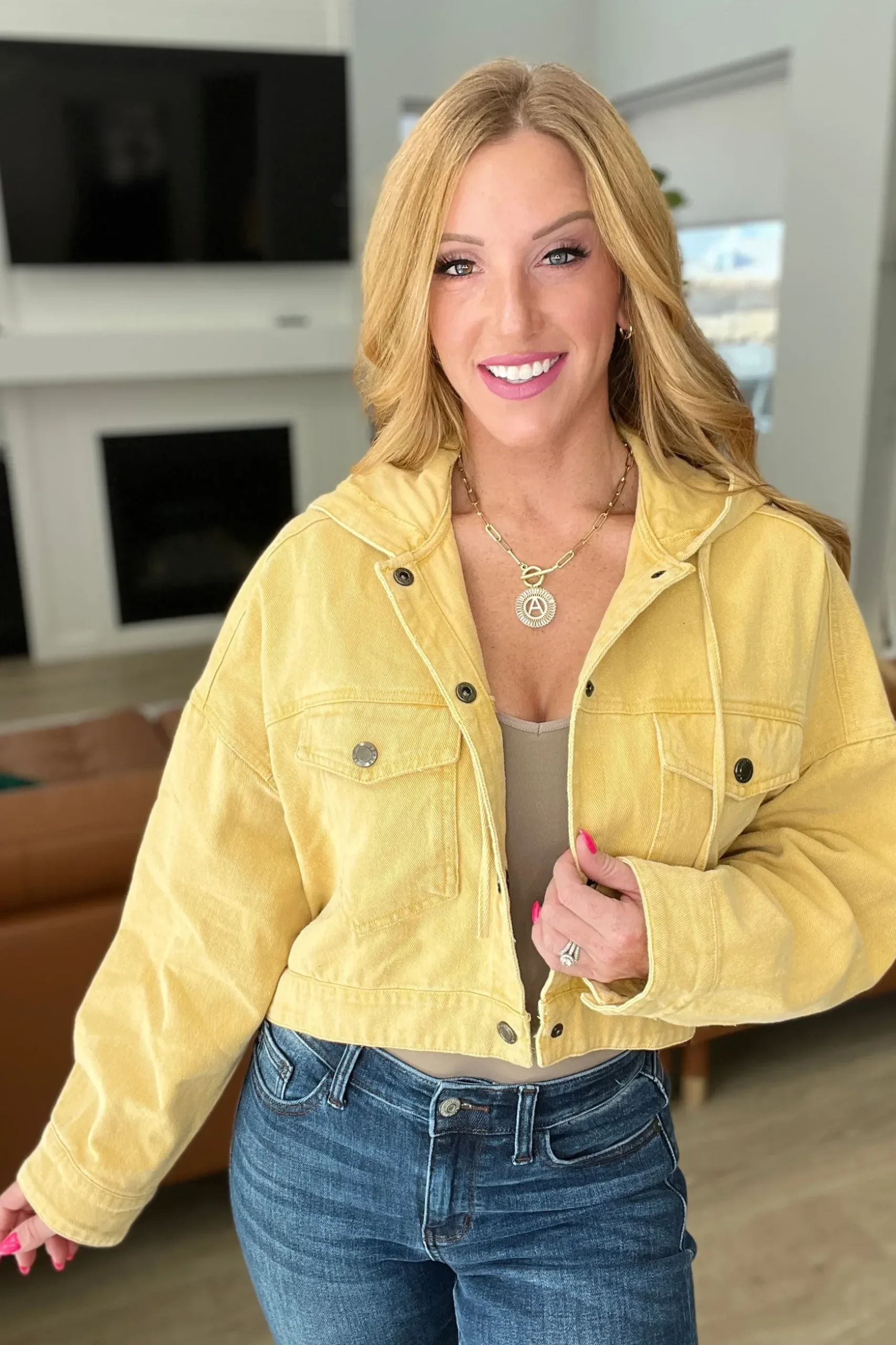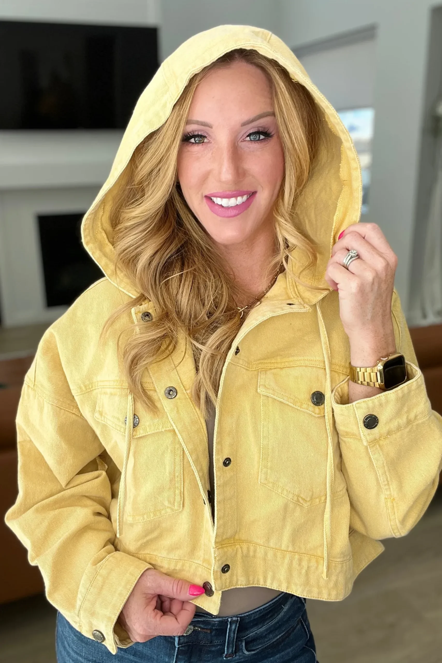 Look stylish this season in this garment-dyed, mustard-yellow Cropped Hooded Denim Jacket. Crafted from durable denim fabric, this boxy-fit jacket features a hood and cropped fit for a modern, on-trend look. Be fashion-forward and stand out from the crowd.
