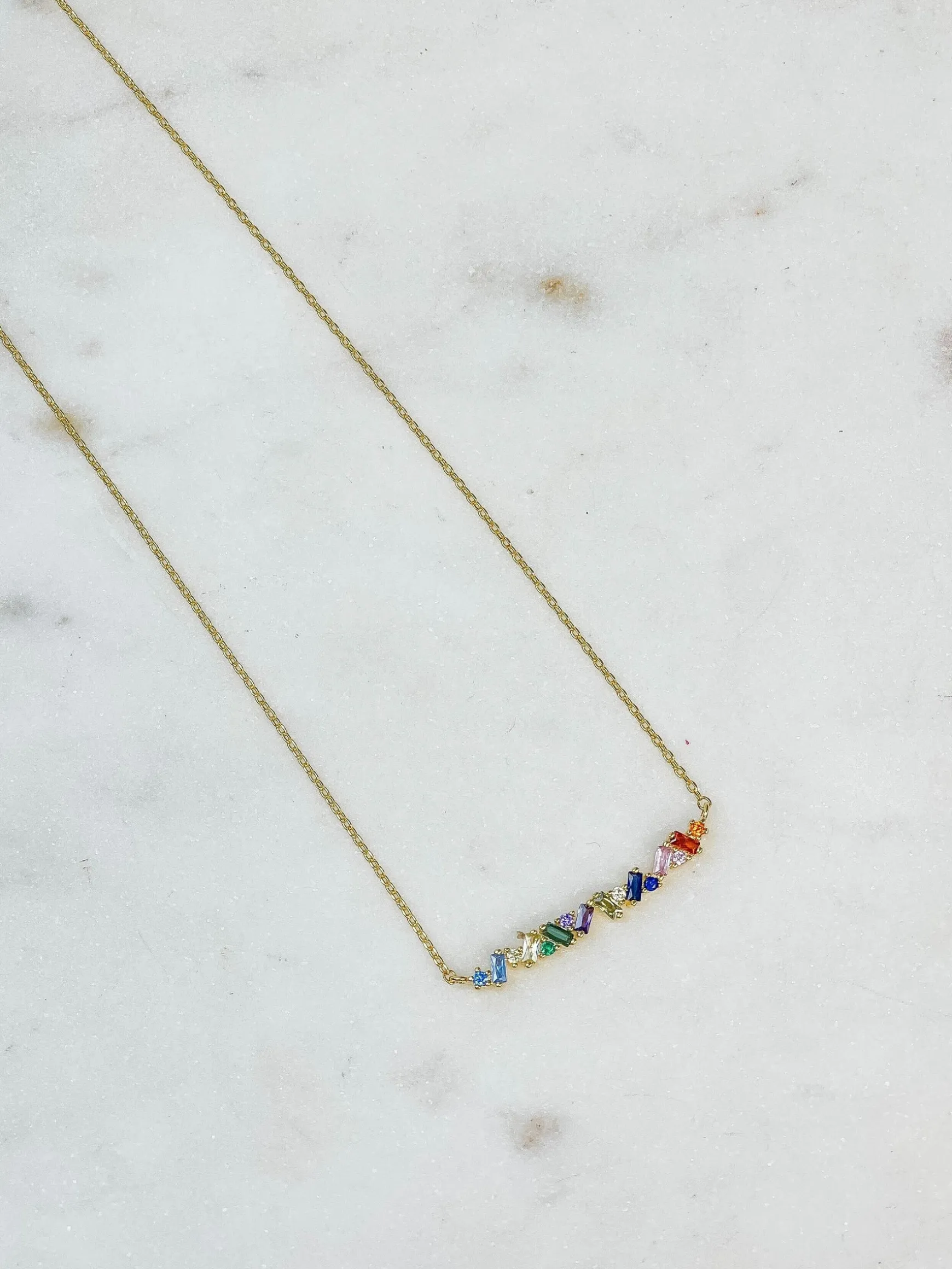 This stunning necklace features a colorful display of cubic zirconia rainbow baguette stones, creating a vibrant and eye-catching look.