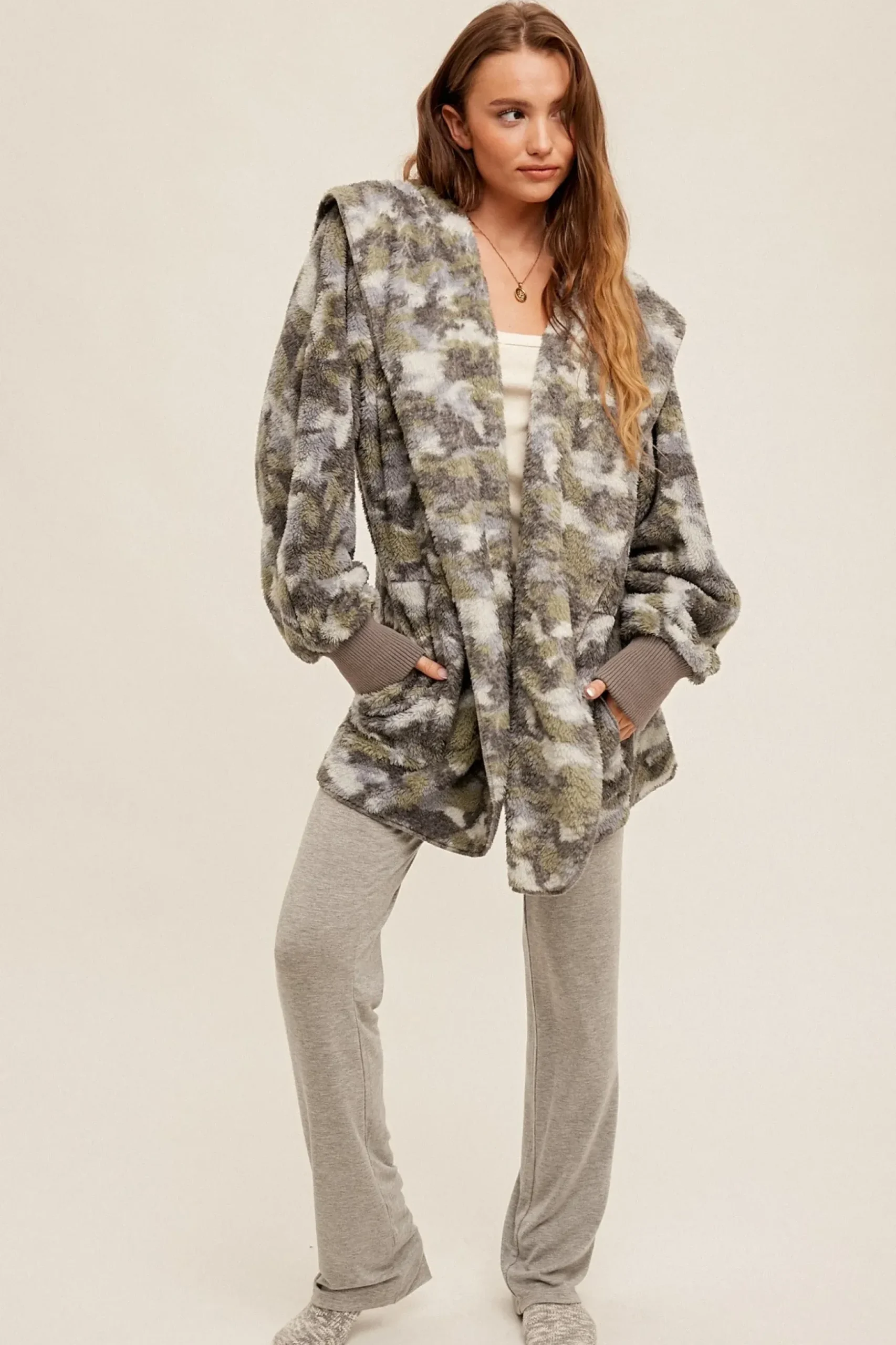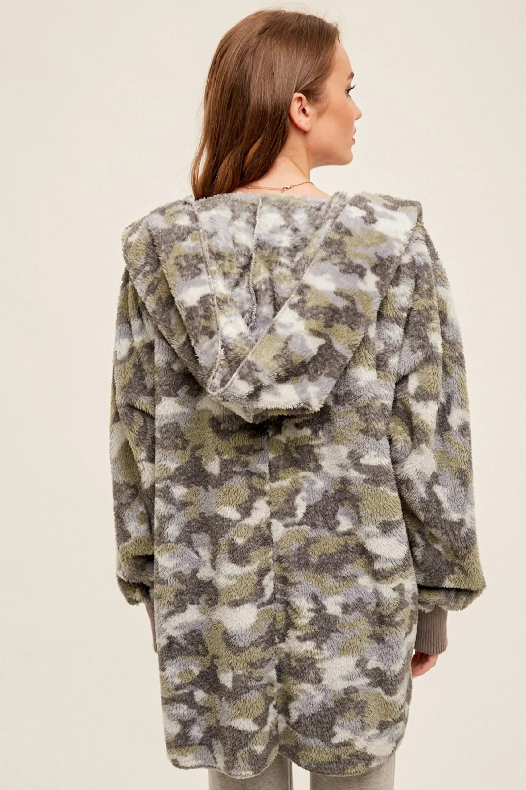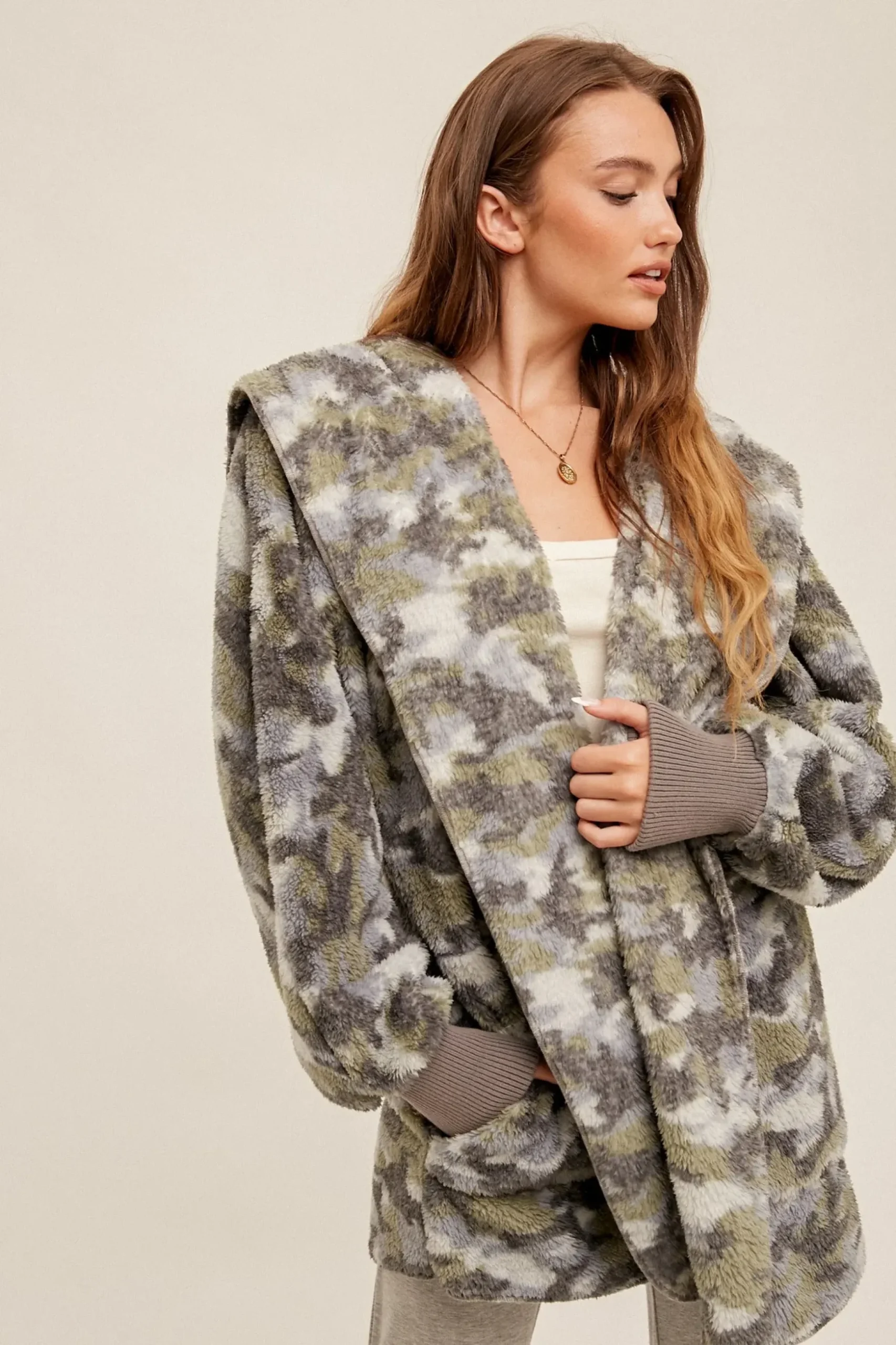 Distressed Camo Fur Oversized Hoodie Jacket by Mystree