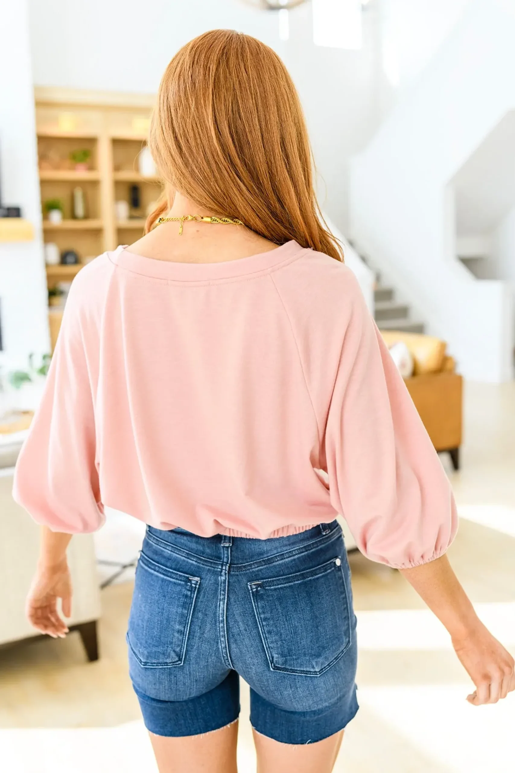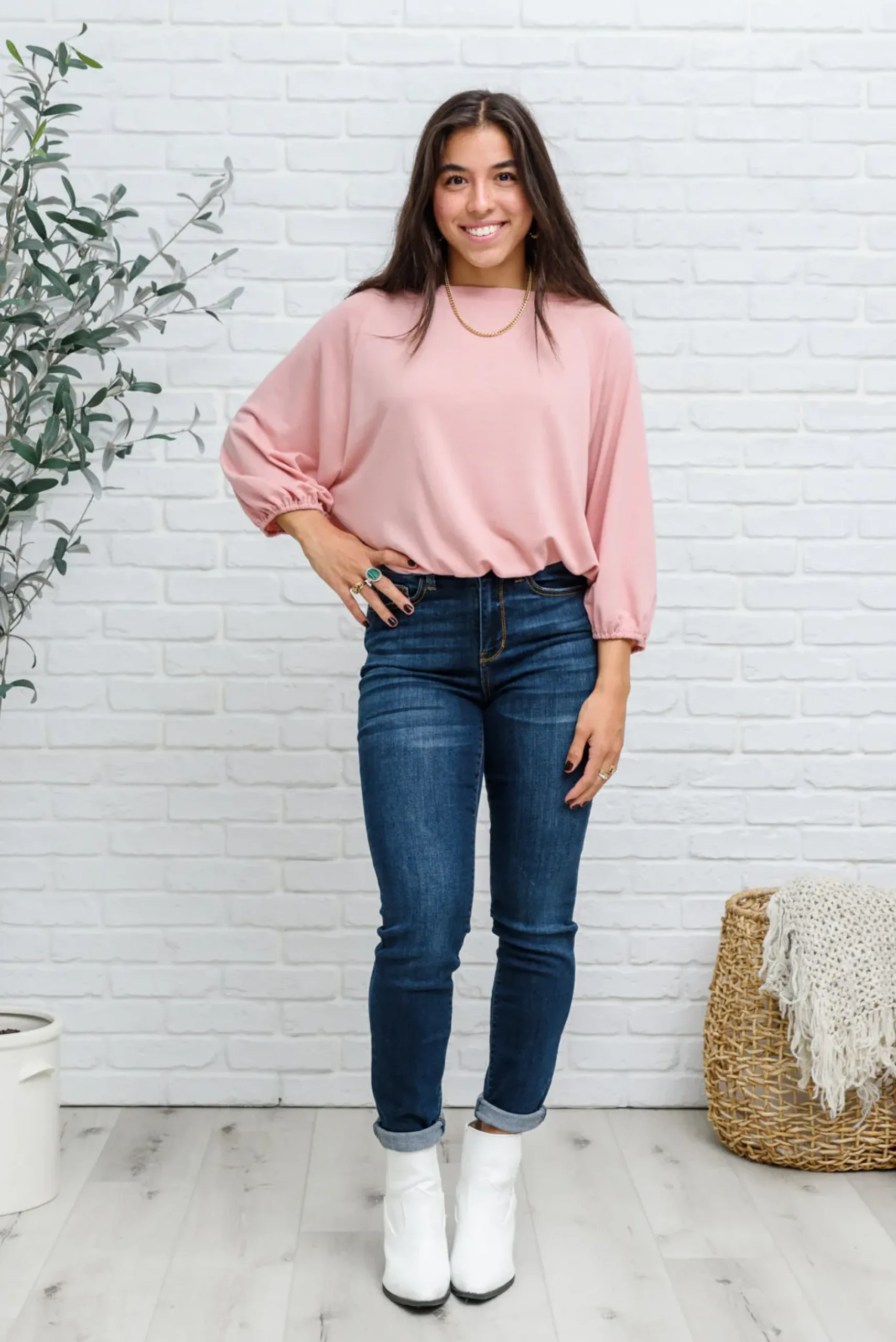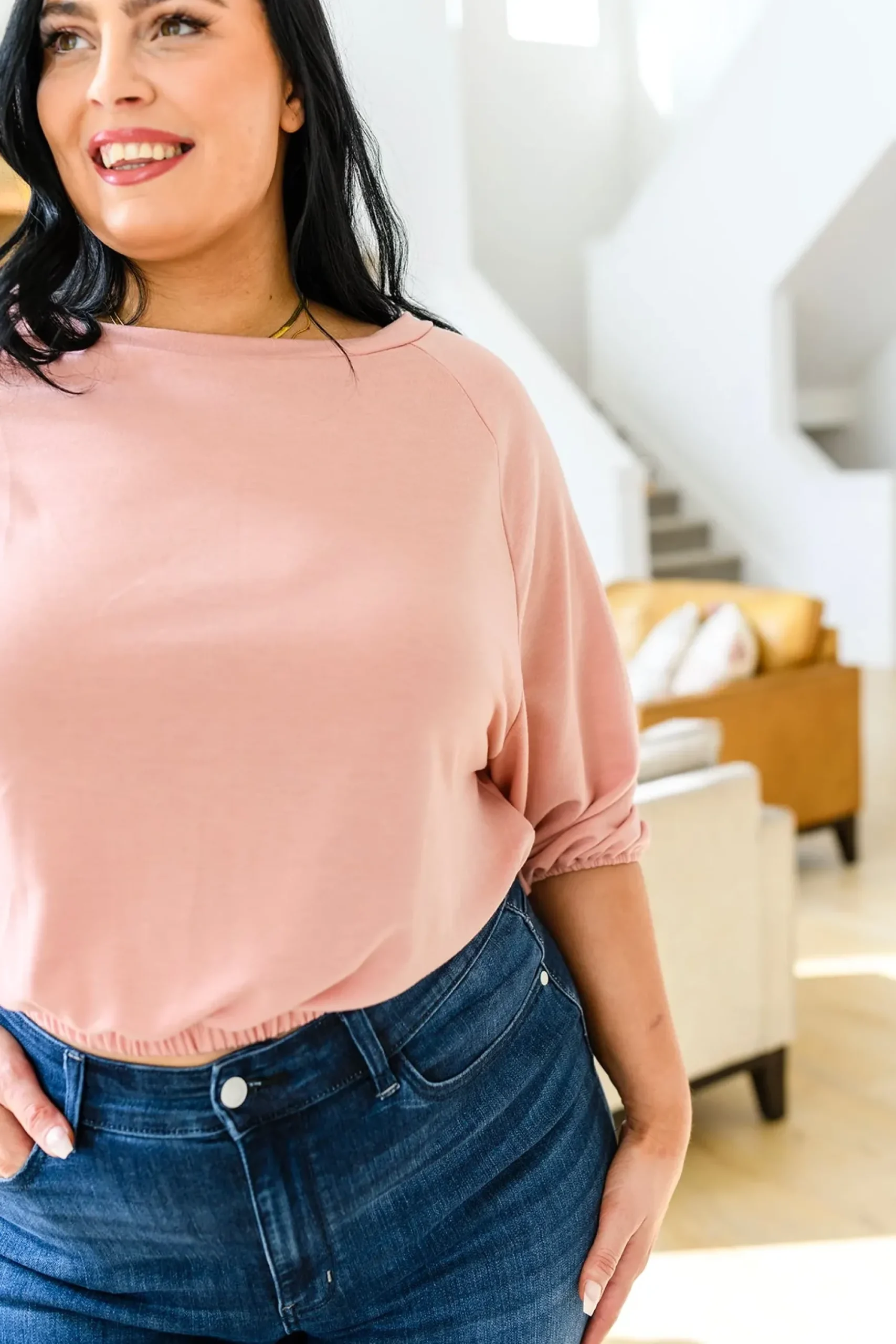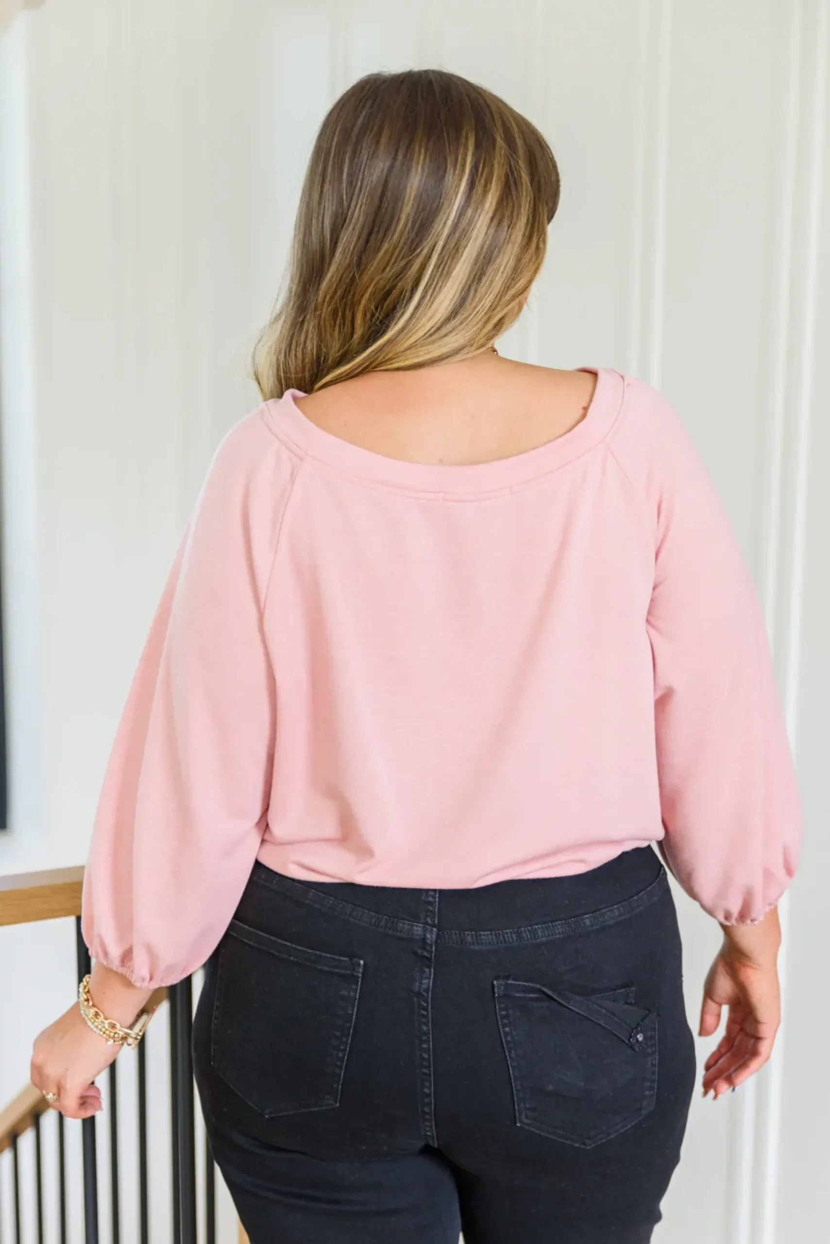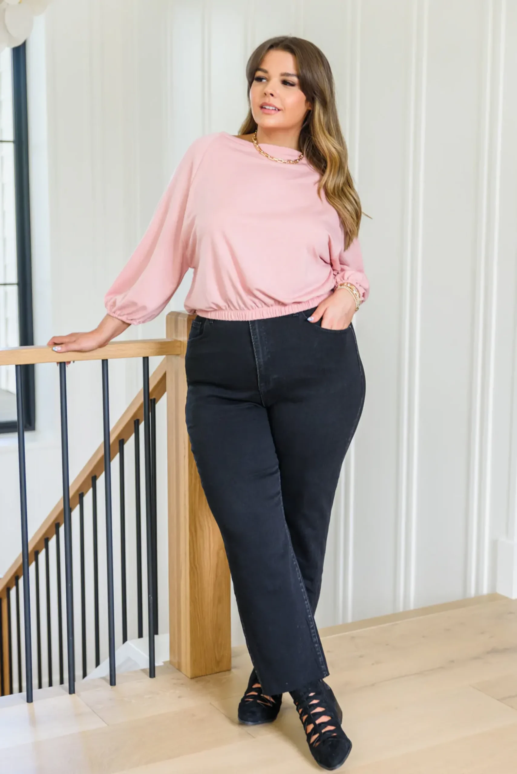 The Don’t Go Yet Top was made for maximum comfort and style! The elasticated cuffs and waistband combined with the three-quarter balloon sleeves, round neckline, and soft jersey fabric make for the perfect go to top! Pair with denim and pumps for a chic look!
